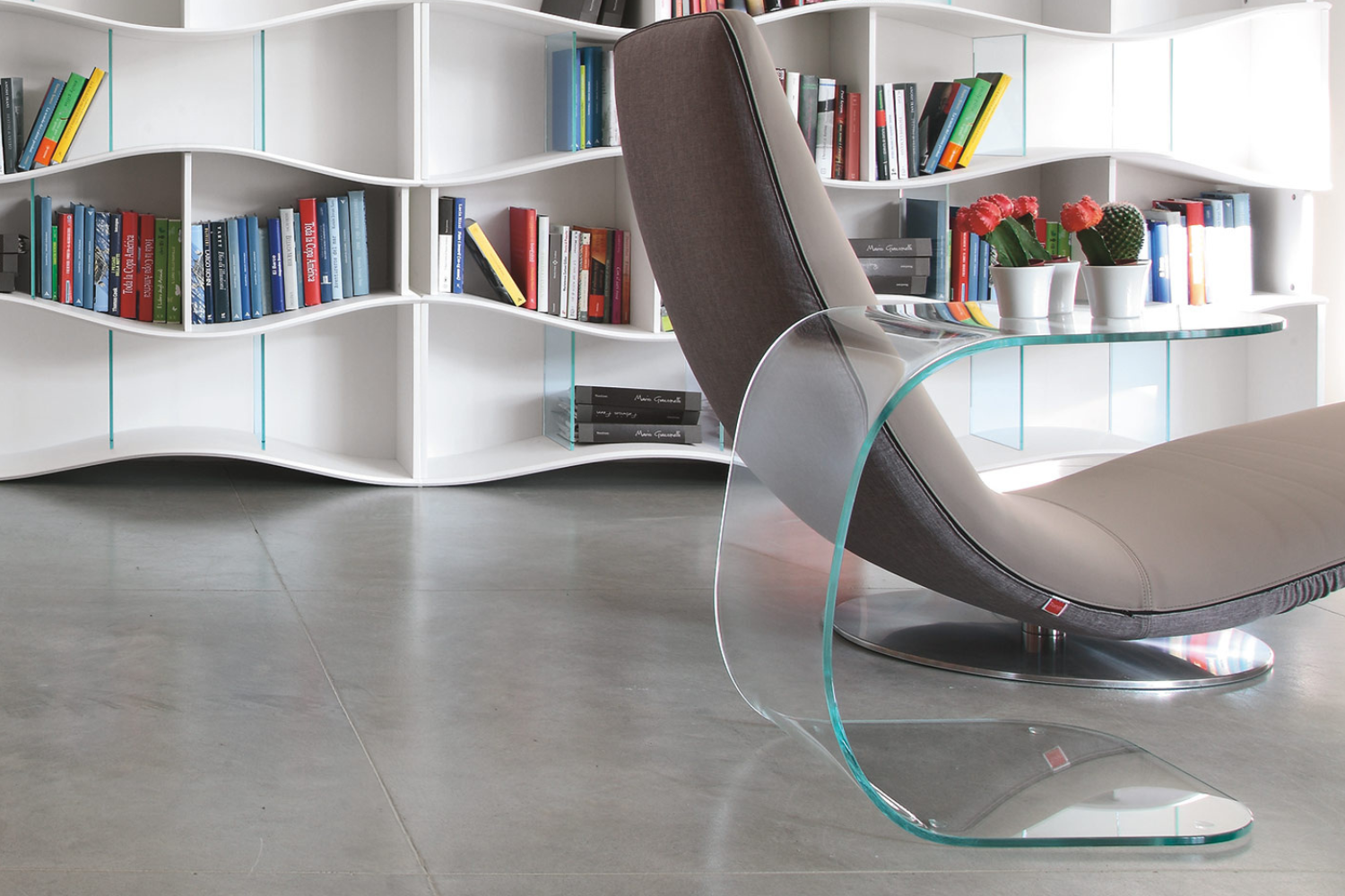 Its curved design slides effortlessly under a couch or chair, creating a convenient workspace or dining surface. The base also doubles as a functional shelf, ideal for storing books or small items. Despite its all-glass construction, the table is both sturdy and durable, built to withstand years of use.