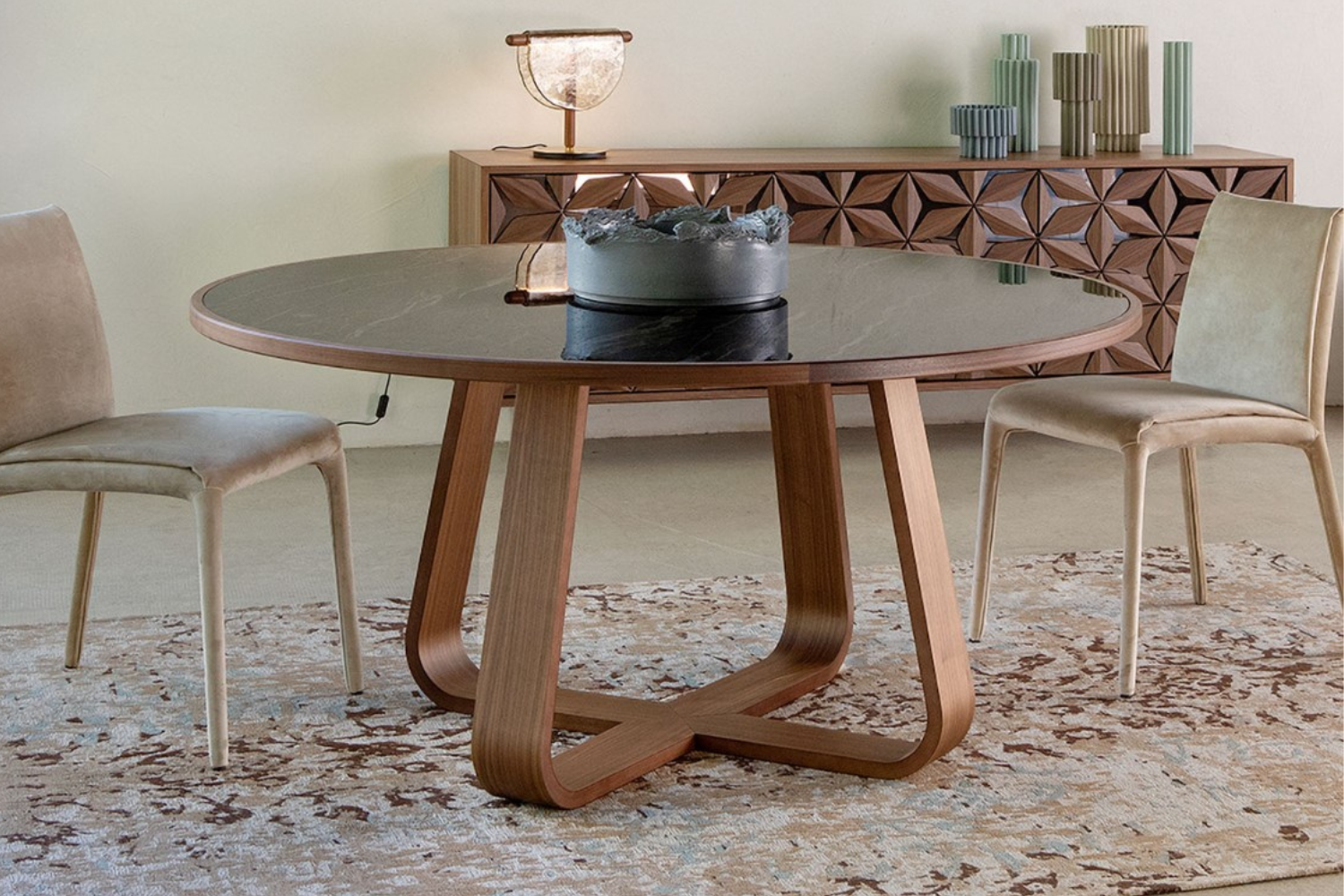 Experience elegance in your dining space with the Arancini round dining table. Its unique wooden base features four gracefully curved elements that radiate from a central point, creating a striking and sophisticated design. The top showcases a beautiful porcelain center, framed by a sleek wood profile that highlights its luxurious finish. Ideal for both dining and socializing, this table offers ample space for gatherings while elevating your room’s aesthetic. Fully customizable, the Arancini table allows you to choose from a range of porcelain and wood finish options to match your style.