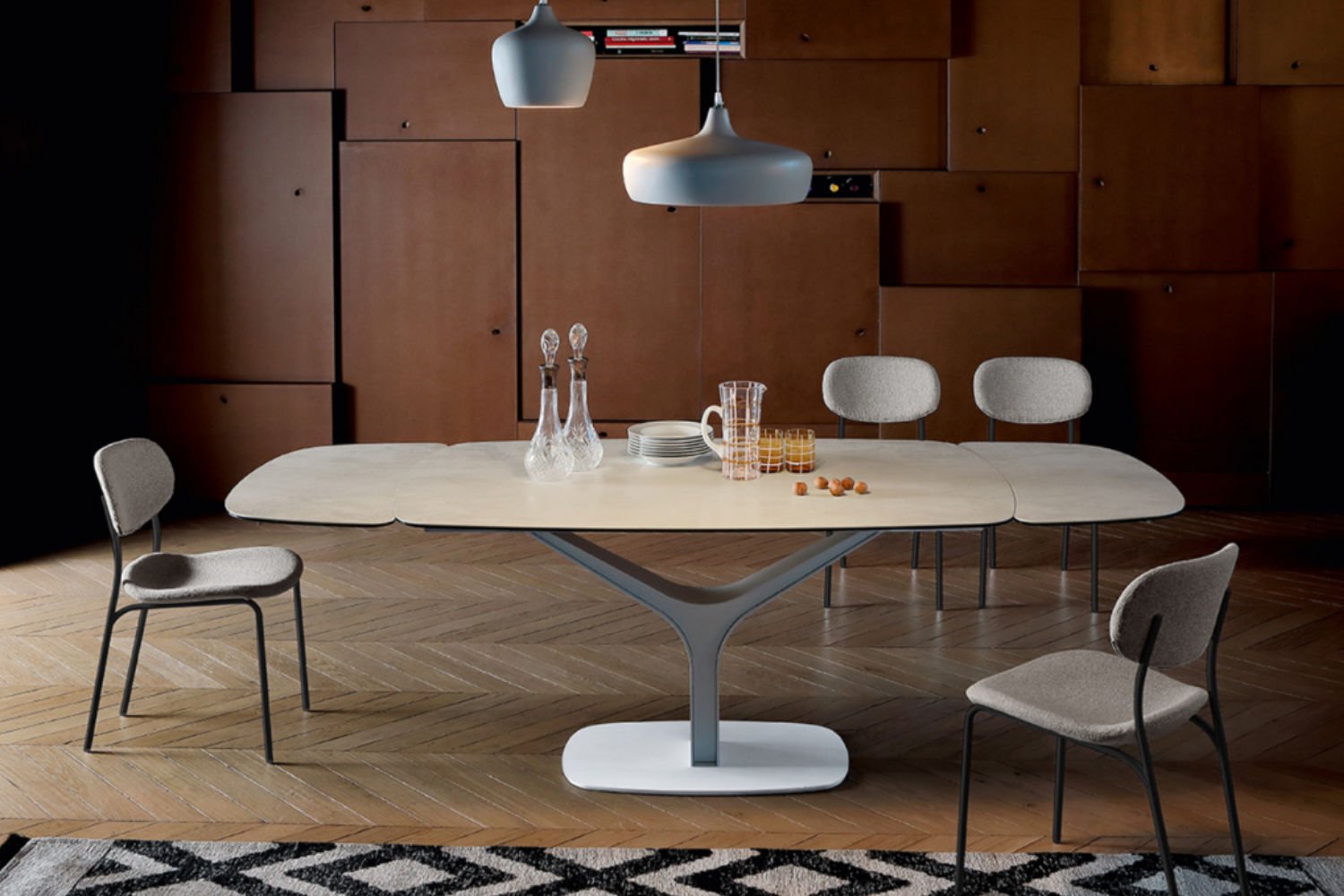 The optimal characterization for Ariston's Pranzo Moderno dining table is 'The New Contemporary.' The table effortlessly balances steel sturdiness with a graceful and nimble design, accentuated by the curves that define its base. The ceramic or porcelain tops, offered in various finishes, seamlessly rest on aluminum guidebars, ensuring both elegance and functionality in this modern piece