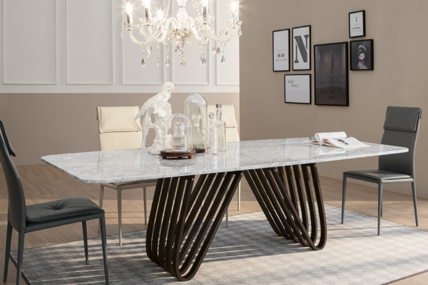 Arpina strives for a harmonious synthesis of shapes and materials, offering options with tempered glass, ceramic, and marble tabletops. Supported by thermoformed wooden legs, it is available in both Canaletto walnut and heat-treated dark oak. The design comes in a fixed version, reminiscent of classic inspiration from music, and an extendible version, incorporating a contemporary and functional aluminum guide bar. This bold design is a true embodiment of the comprehensive Arpina system, encompassing both table and console table.