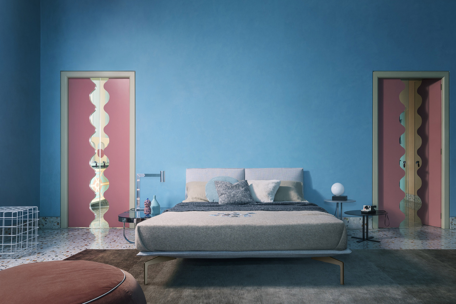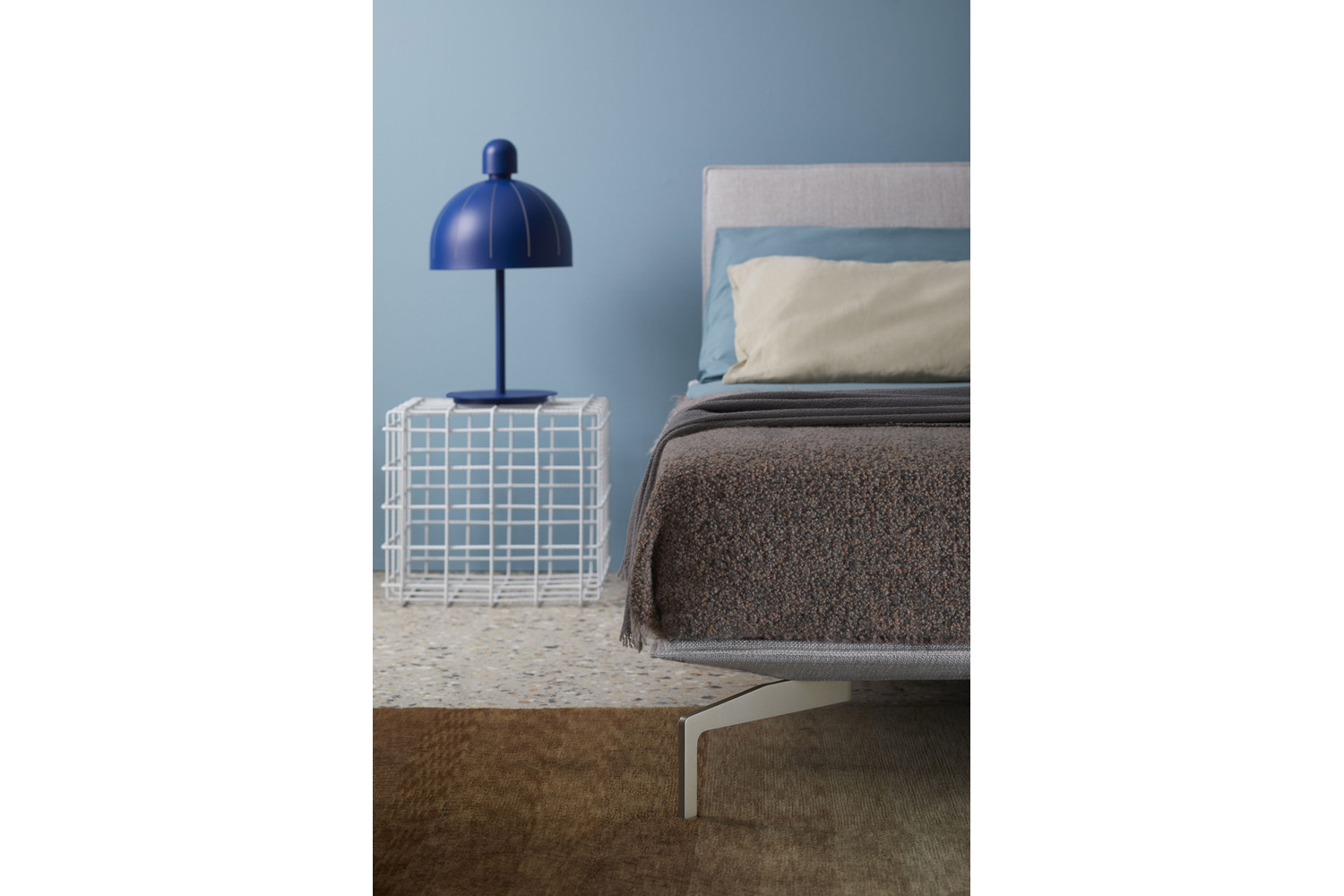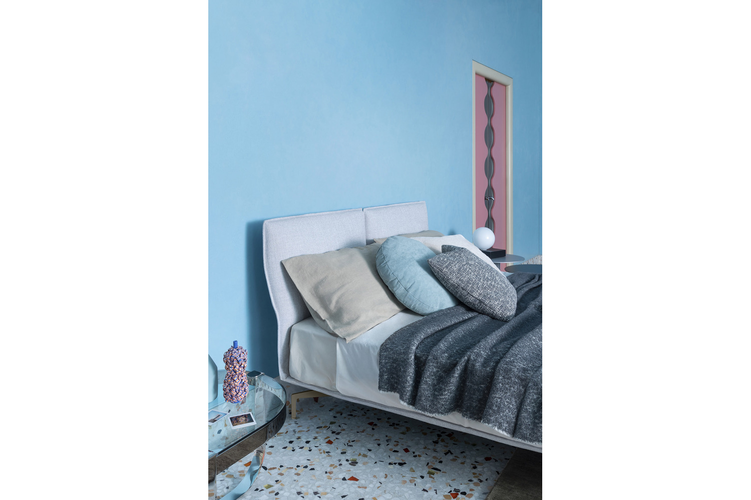 Avanti bed exudes a restrained charm and sophisticated presence. With a balanced yet airy design, it effortlessly adapts into captivating arrangements, courtesy of its unique headboard placements around the base. Its frame, customizable with fabric or leather upholstery, sits gracefully on a metal base adorned with painted metal feet. The covers are entirely removable for easy maintenance.