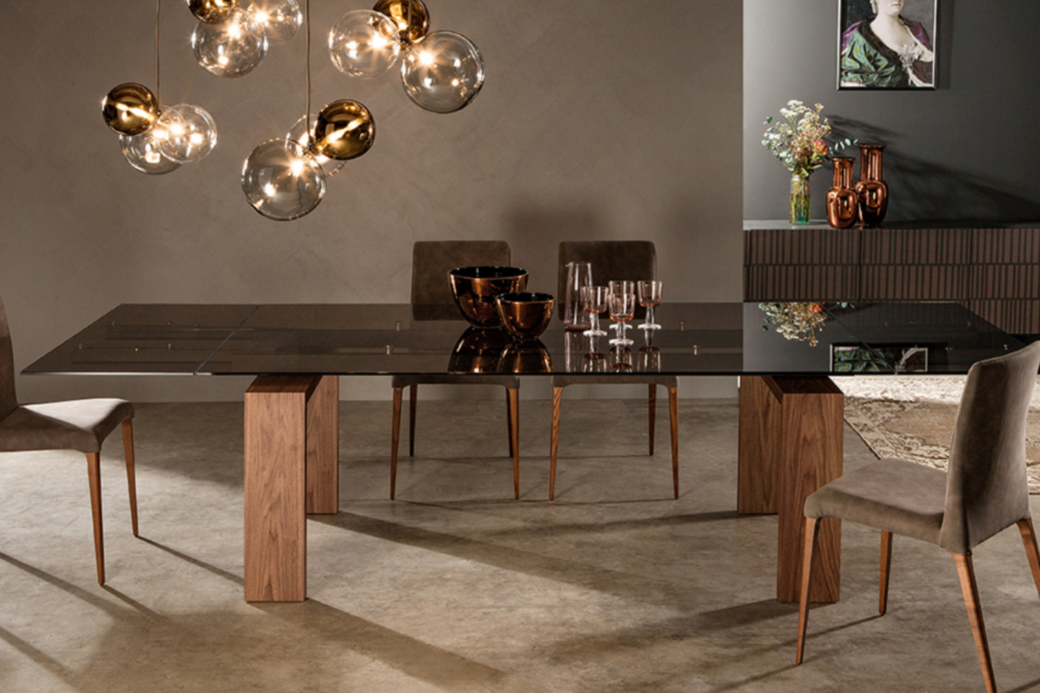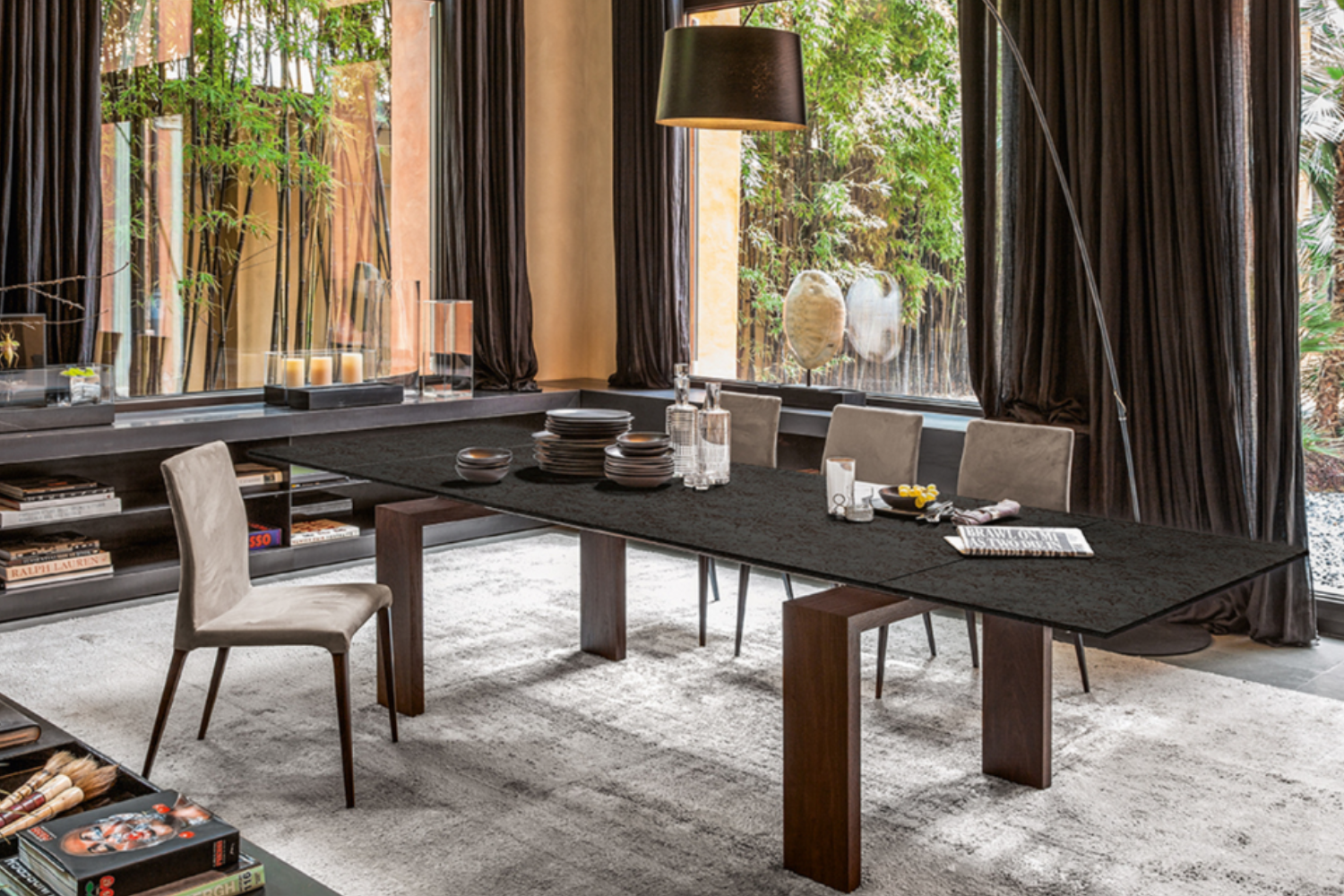 The unwavering resilience of the nearly mythical city,Brovada, serves as the inspiration for this table. It features a wooden base with a regular and geometric design, providing a stable foundation for fixed or extendable tops. The tabletop options include both tempered glass and ceramic glass.