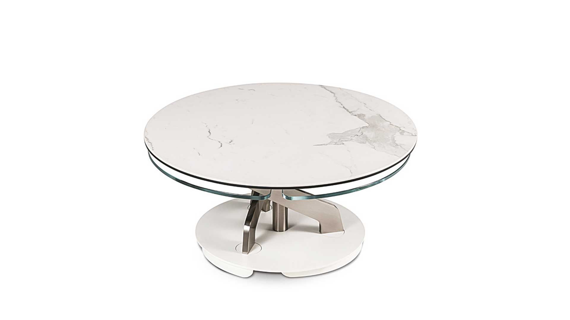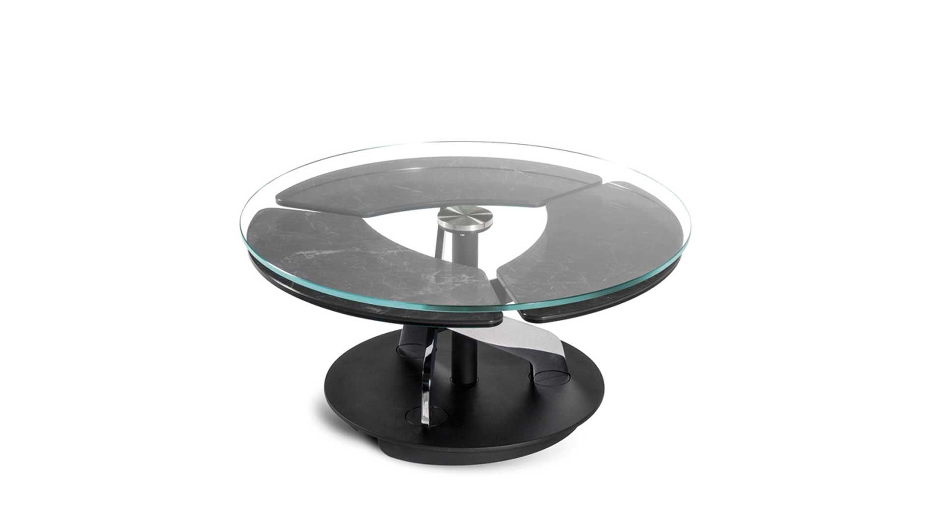 An extendable coffee table comes equipped with an innovative mechanism that, through a 360-degree rotation of the upper round top, automatically opens the three smaller lower tops. In the closed position, the lower small tops are concealed by the round upper top.