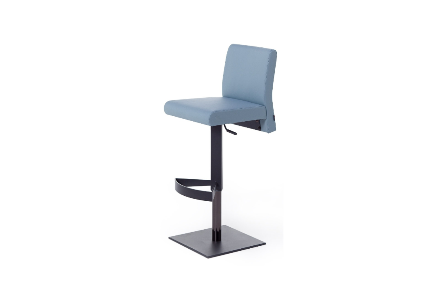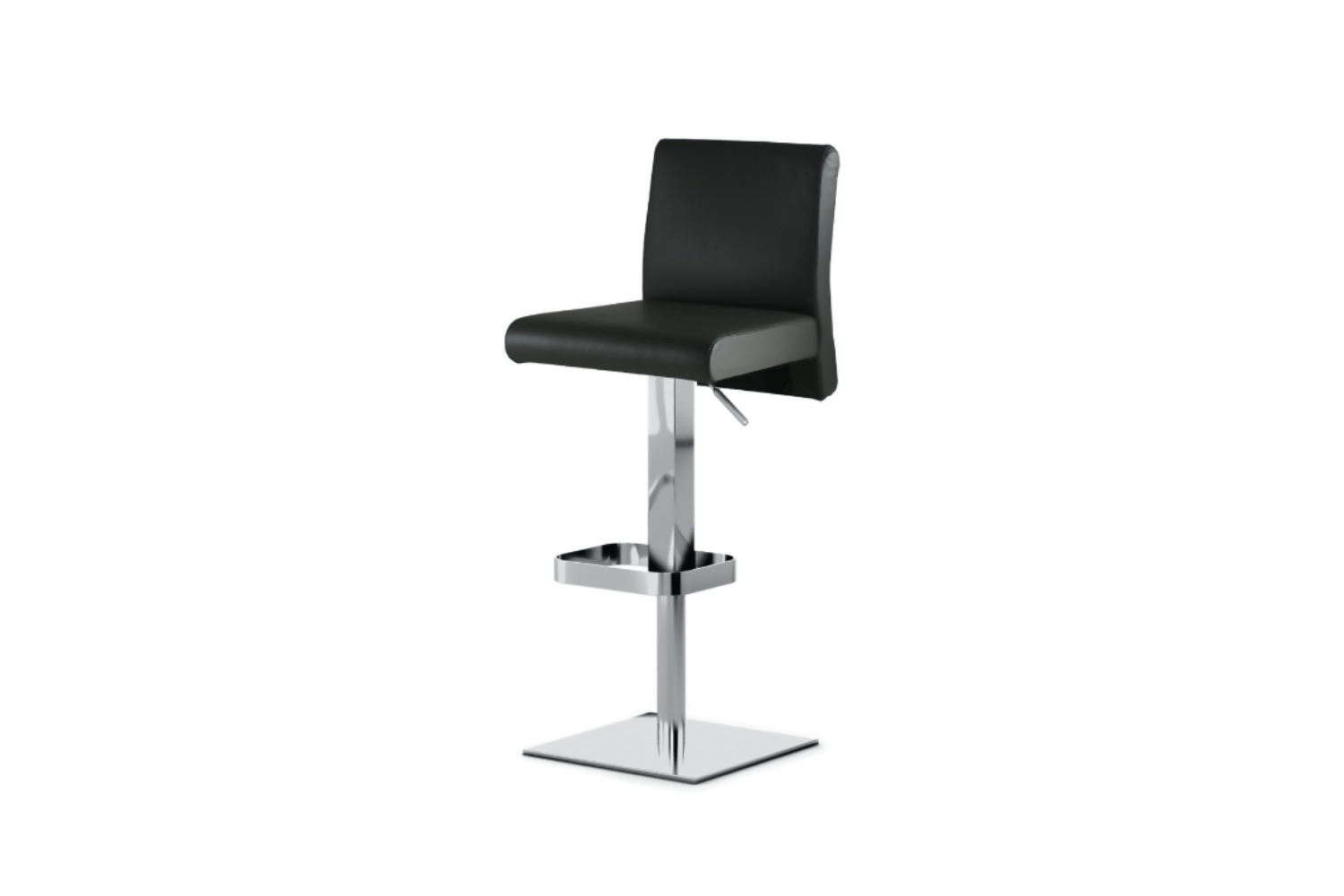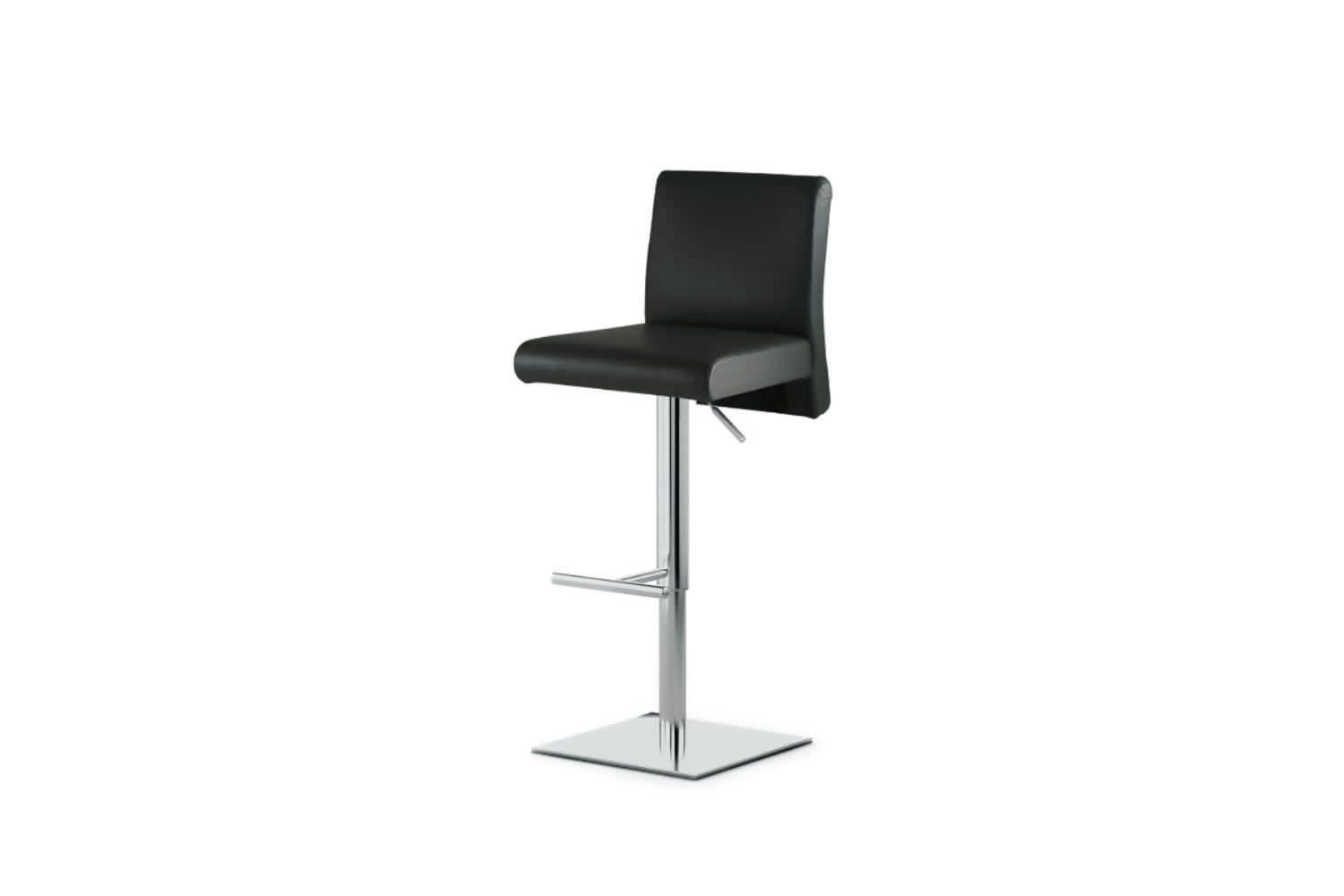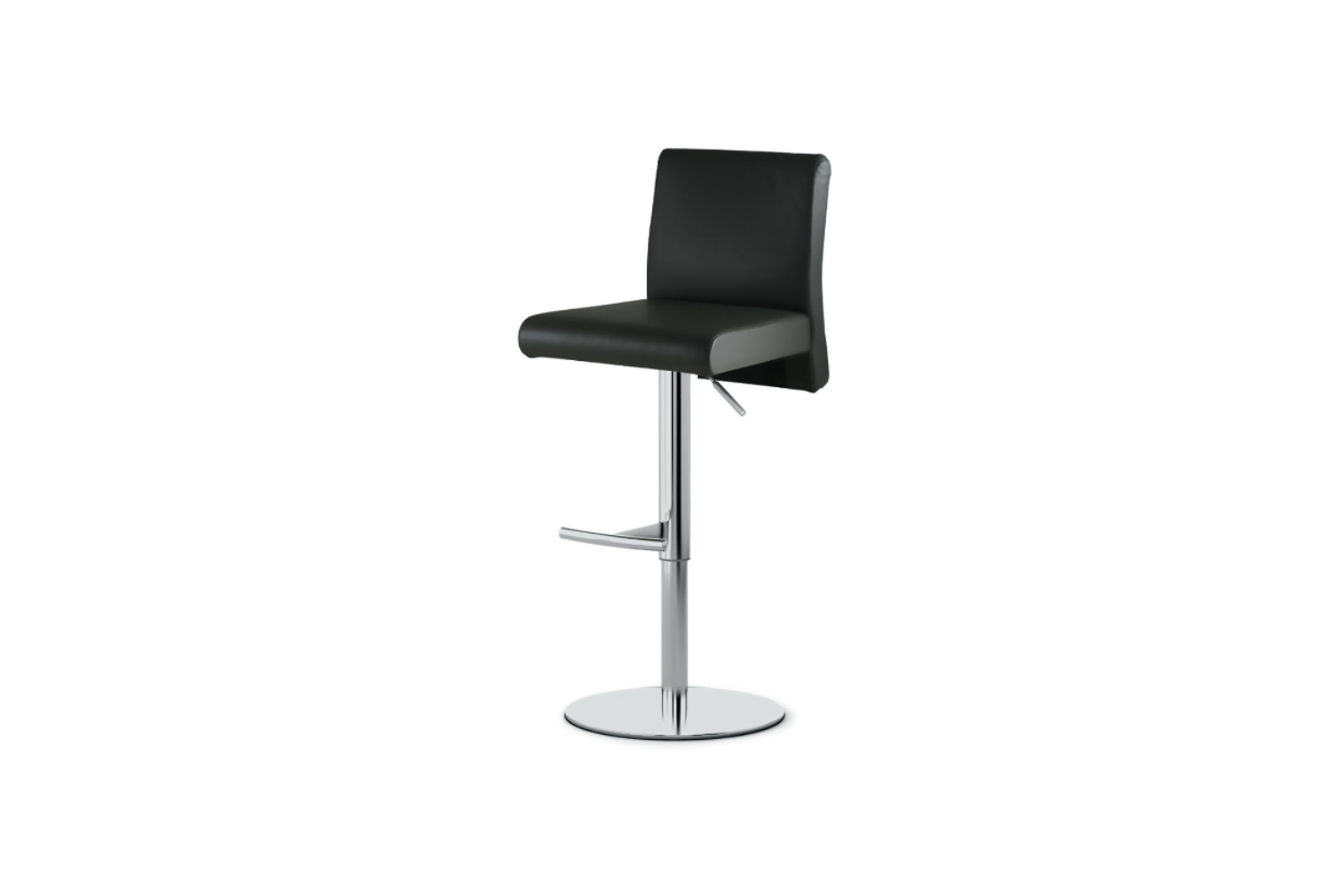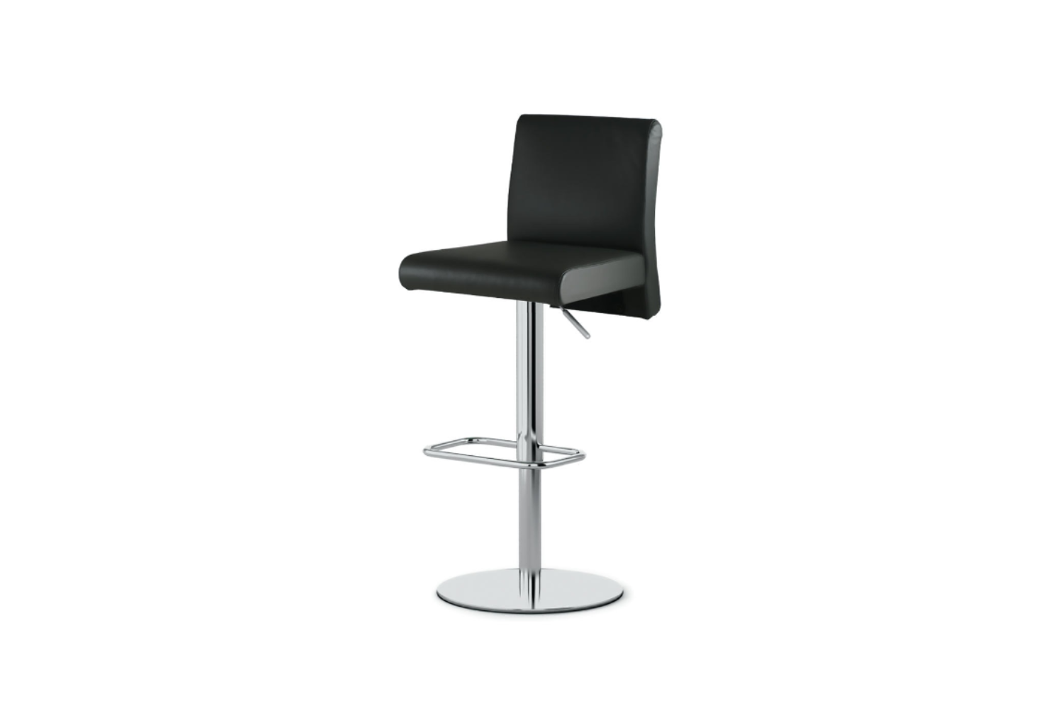 Modern bar stool with cast iron base covered with stainless steel plate, gas lift, seat/back and footrest metal frame with plywood seat pad, covered with polyurethane foam and upholstered in fabric, leatherette or leather.