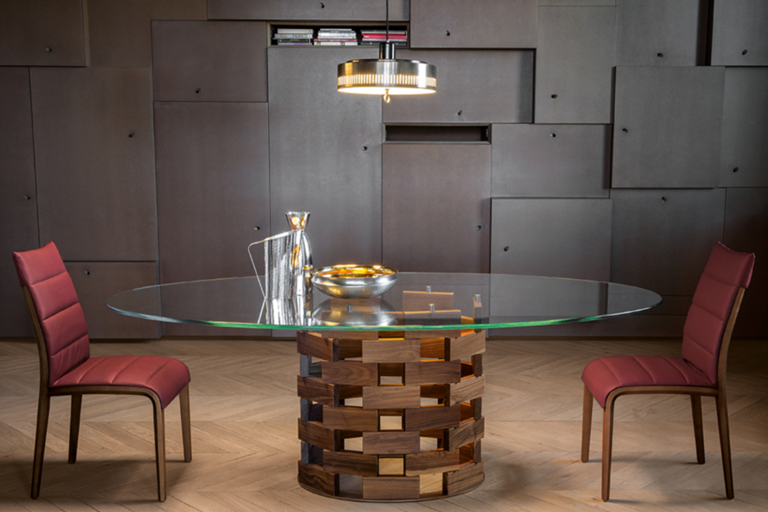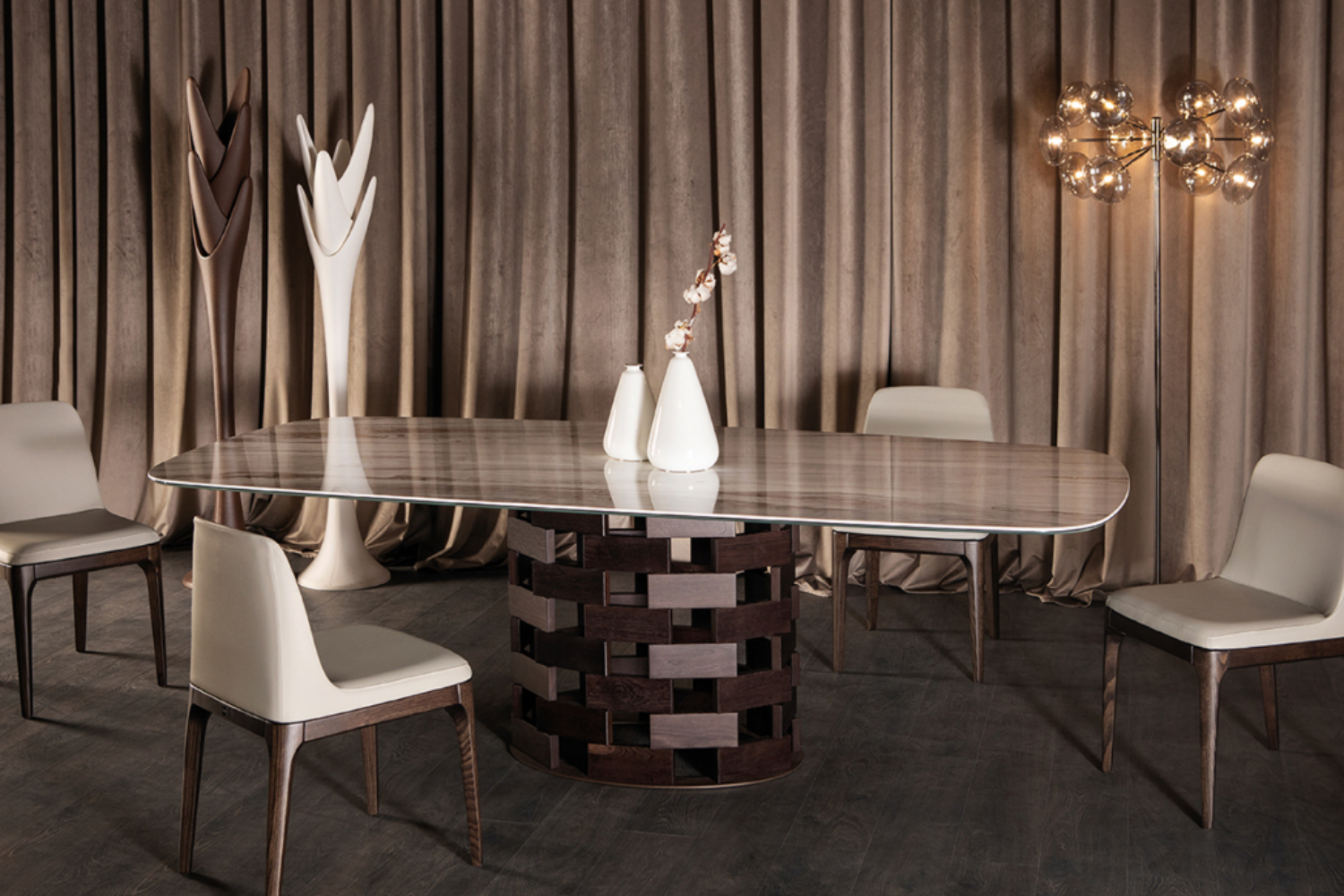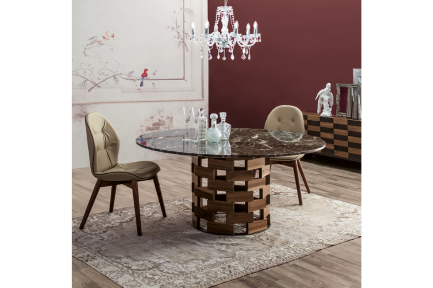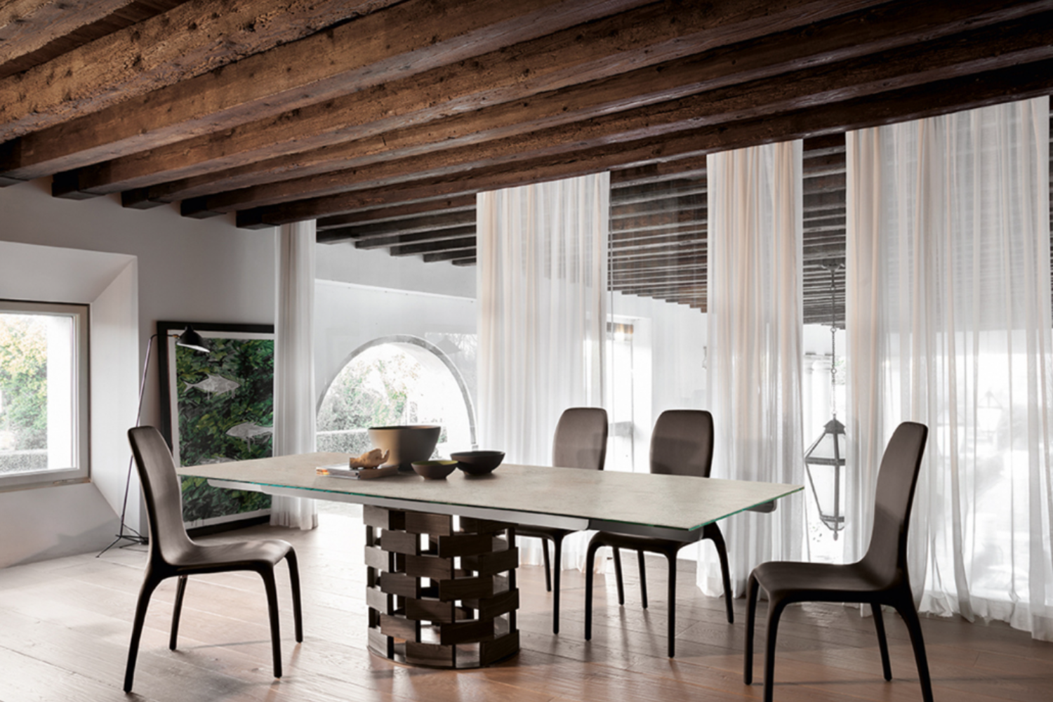 Another homage to the essence of Italy, encapsulating warmth and balance in both form and feeling. A sturdy base crafted from solid walnut or dark oak provides the groundwork for fixed or extendable tabletops, offered in glass, ceramic, and marble options