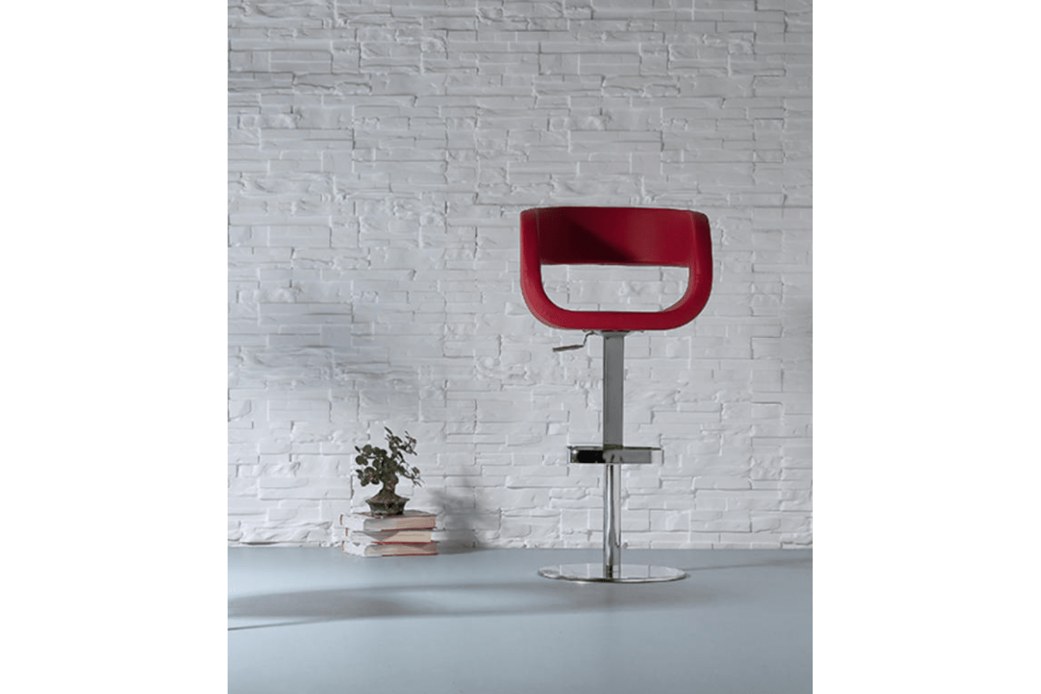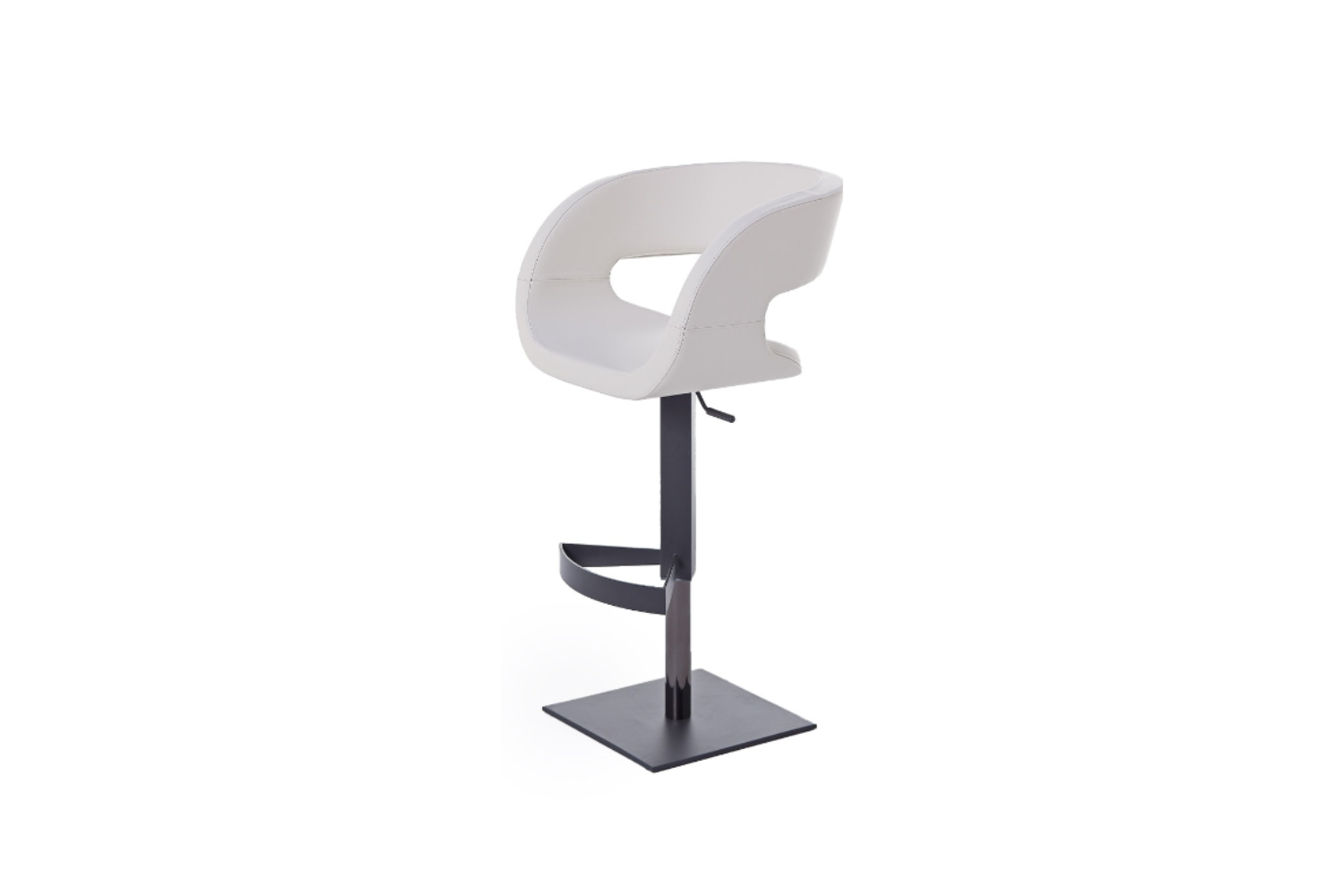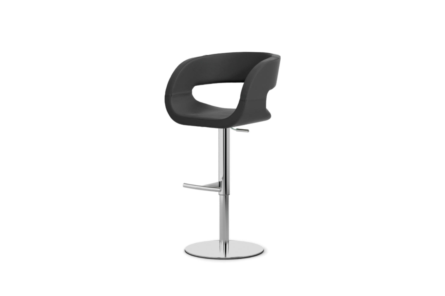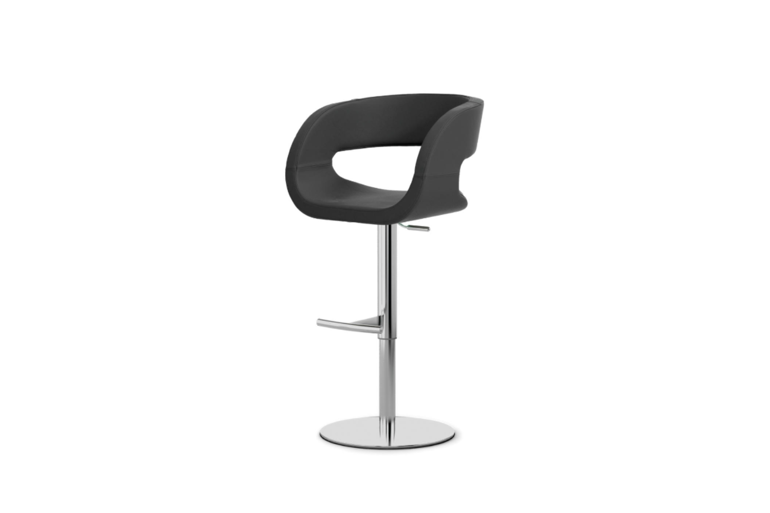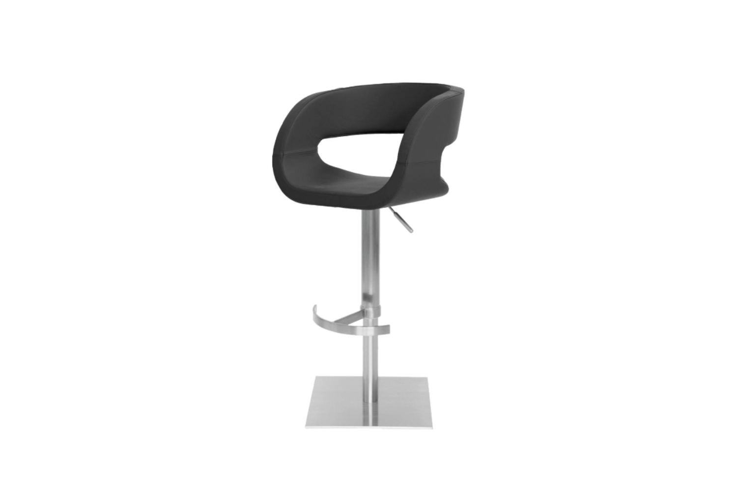 Modern bar stool with cast iron base covered with stainless steel plate, gas lift, seat/back and footrest metal frame with plywood seat pad, covered with polyurethane foam and upholstered in fabric, leatherette or leather.