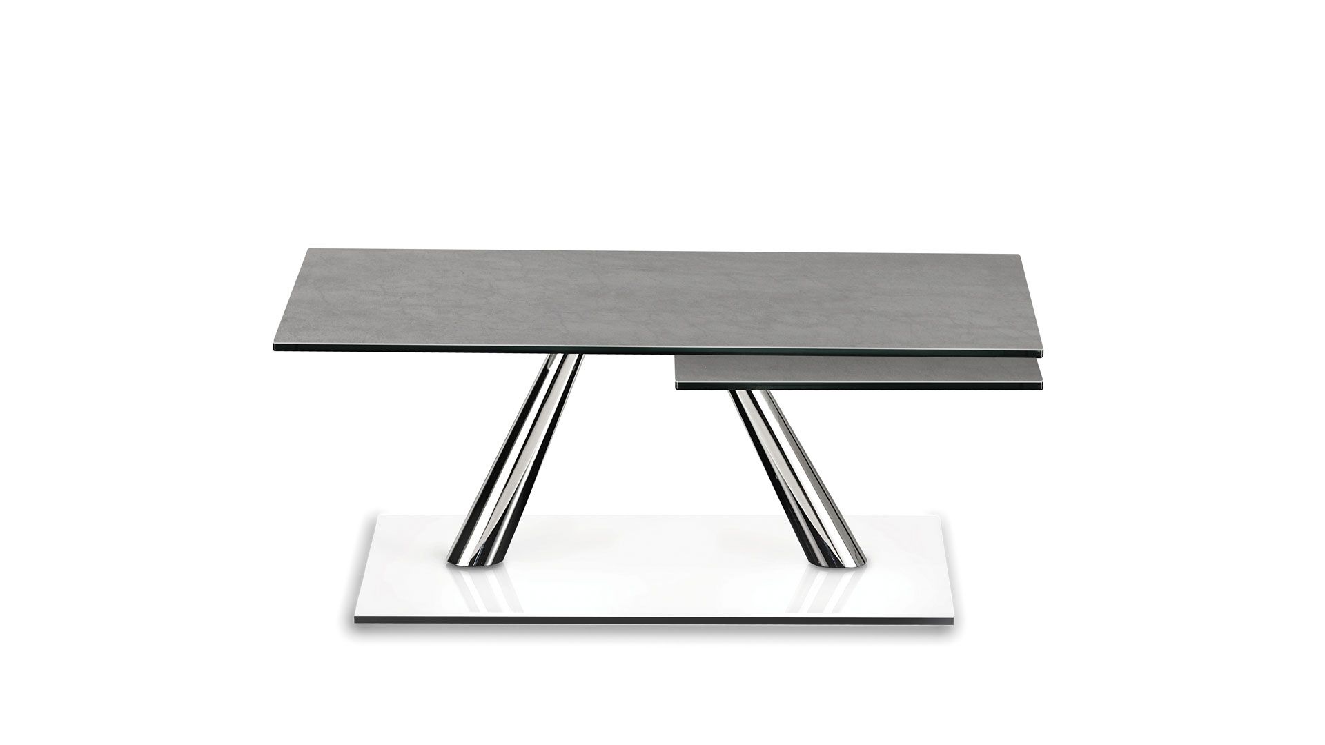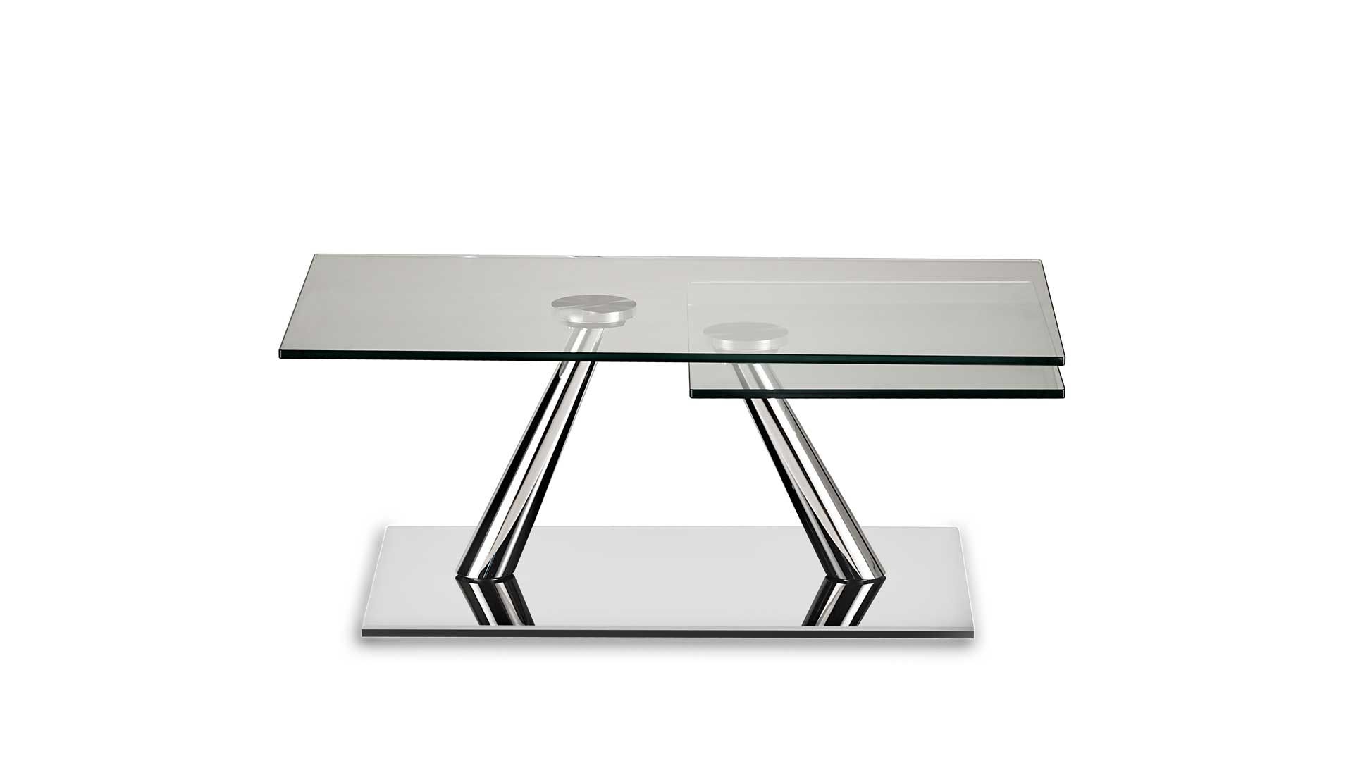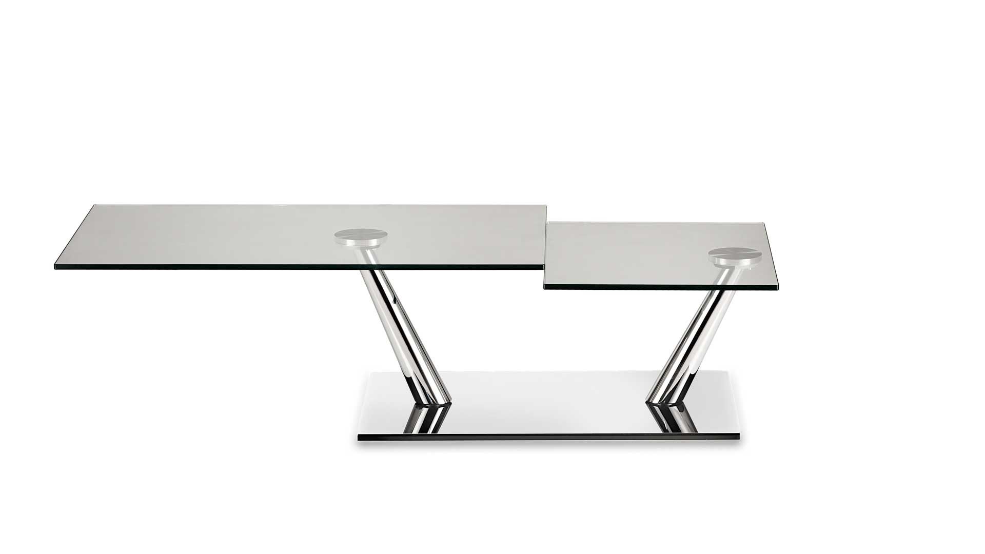 A coffee table with extendable features and synchronized revolving glass tops, supported by a base and frame made of galvanized or painted steel. It is also offered with ceramic tops.
