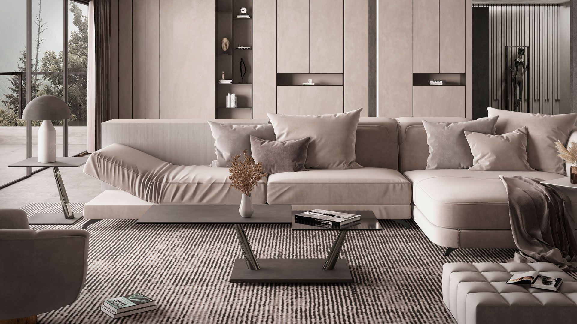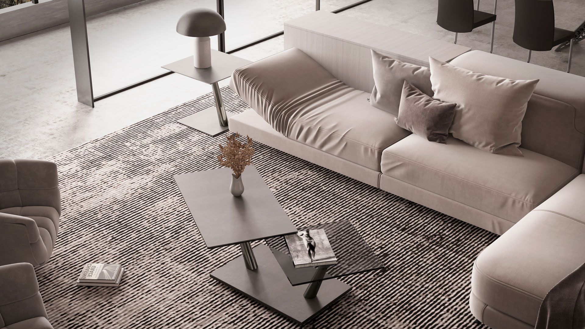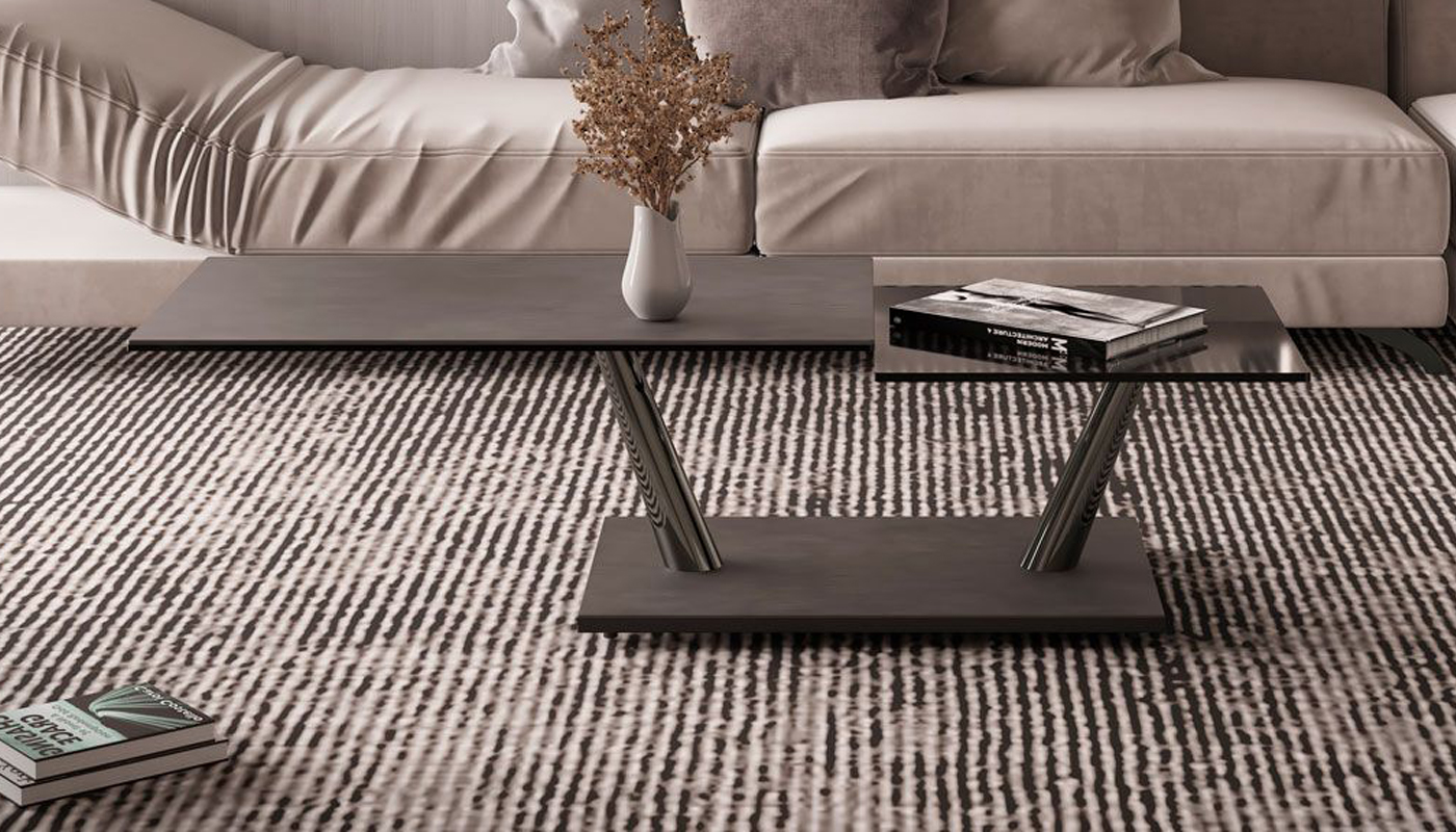 A coffee table with extendable features and synchronized revolving glass tops, supported by a base and frame made of galvanized or painted steel. It is also offered with ceramic tops.