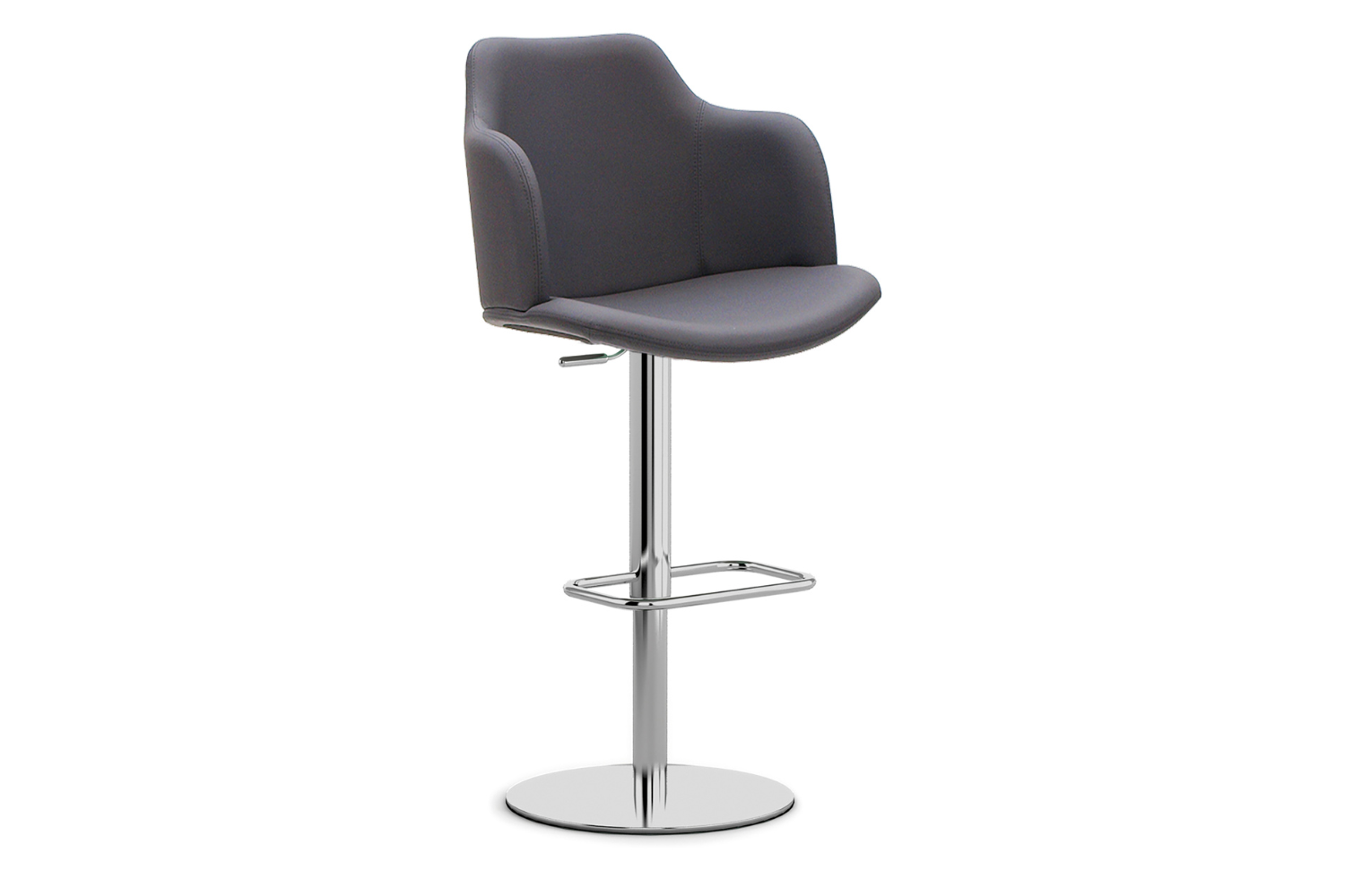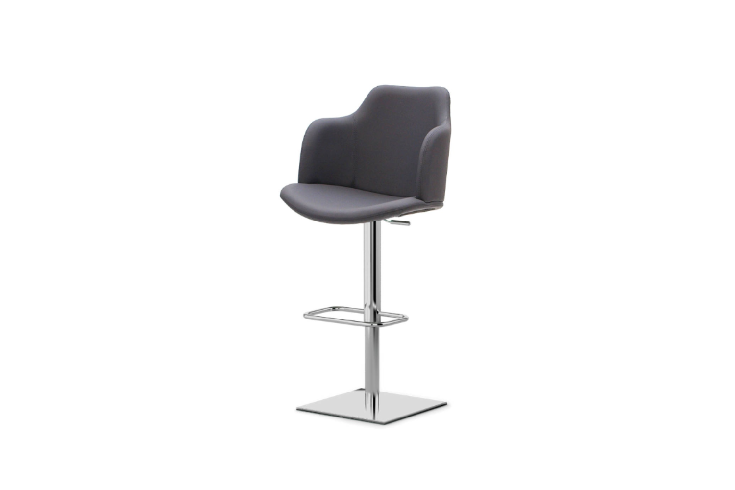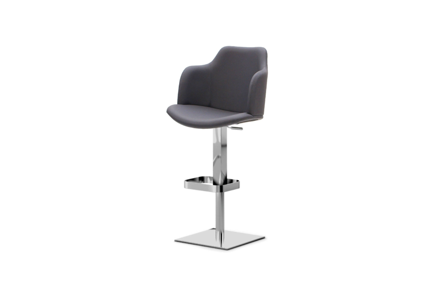 Adjustable and swivel stool with cast iron ballast covered with stainless steel cover, gas piston, footrest, seat and backrest made of beech plywood covered with polyurethane rubber and upholstered in fabric, imitation leather or genuine cowhide of Italian origin. Extra cushion available as an option.
