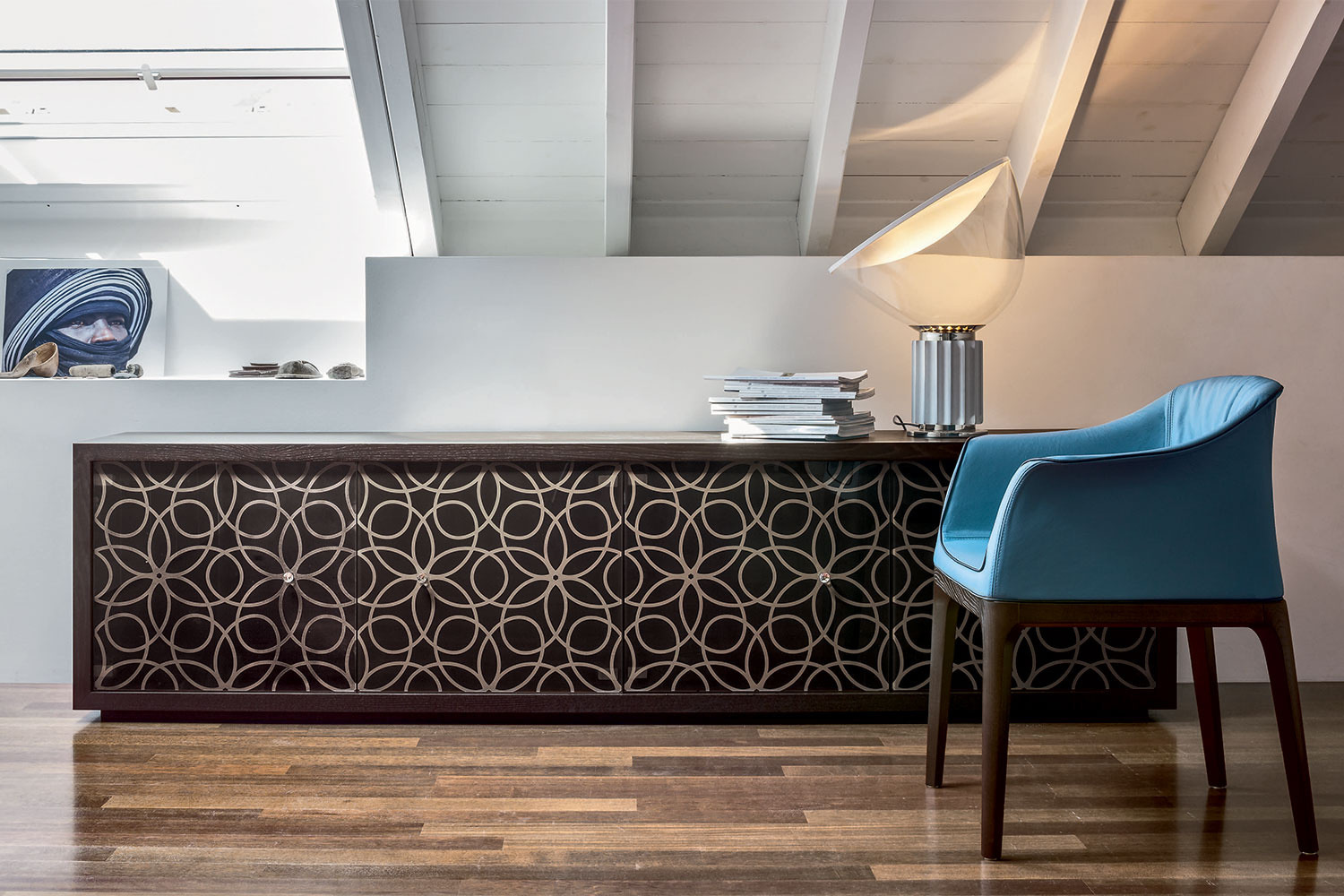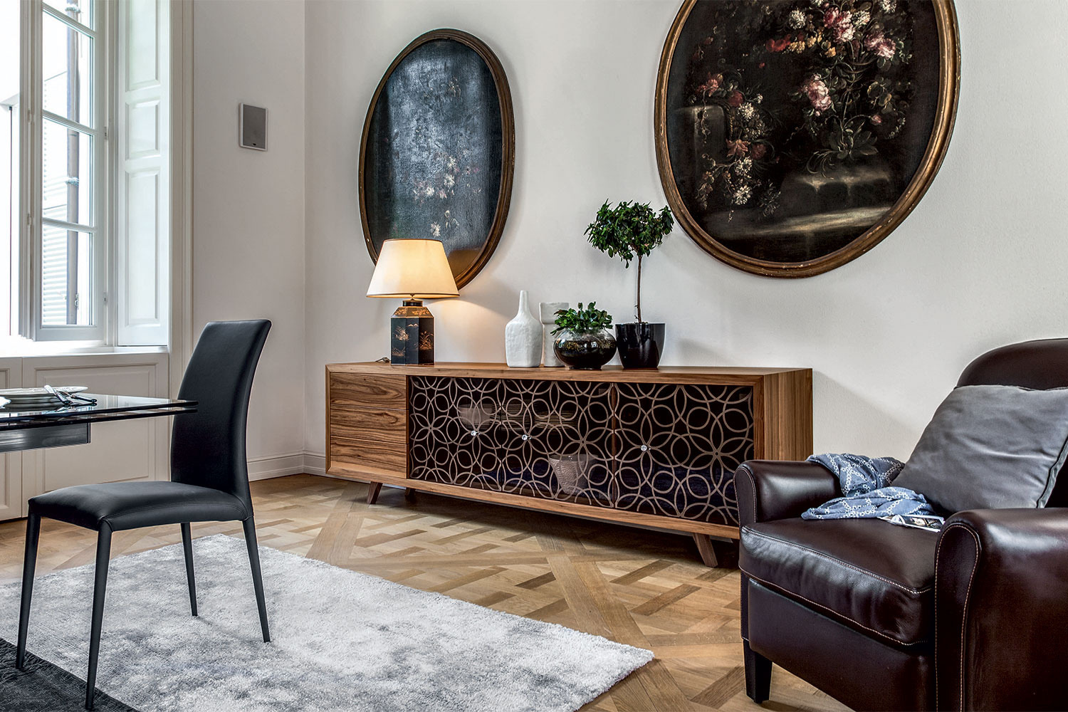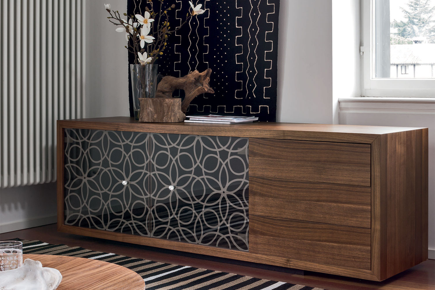 Introducing a dynamic manifestation of contemporary luxury design, the Granada sideboard surpasses expectations. Embellished with baroque serigraphy on its glass doors, it exudes an aura of elegance and sophistication. The Canaletto walnut or thermal oak frame acts as a striking protective border, establishing a captivating contrast with the unique material. Swarovski crystal knobs add a chic finishing touch to the floral pattern, providing a timeless, haute couture allure. Opt for a version with just doors or a combination of doors and drawers for a well-organized home that encourages creative decoration on top.