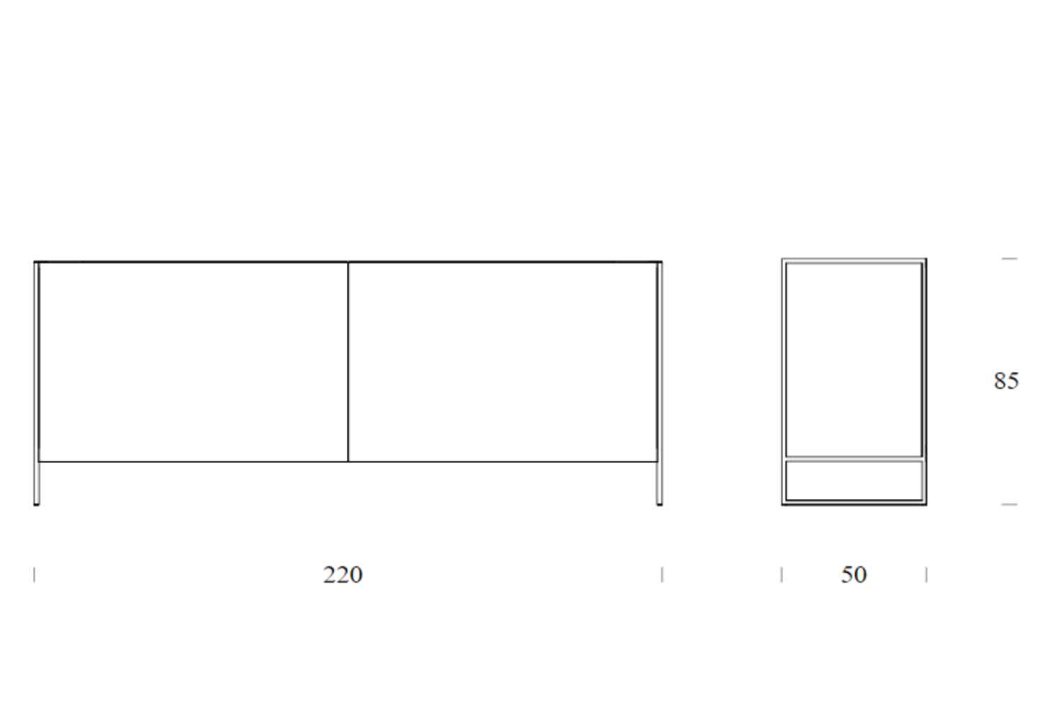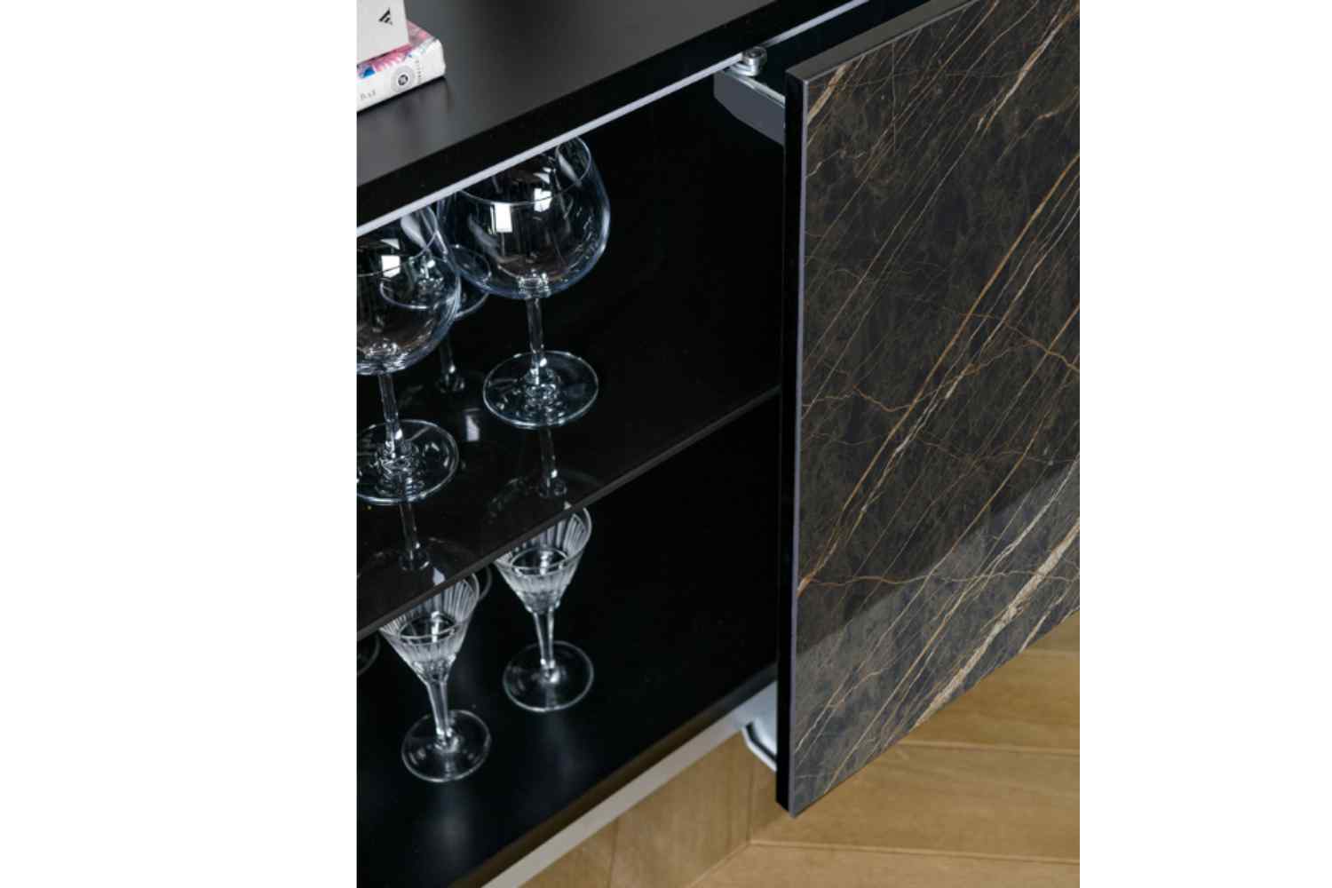 A sideboard with flush doors constructed from porcelain stoneware and a frame made of lacquered metal, tailor-made to perfectly harmonize with the tabletops of Tonin Casa tables.