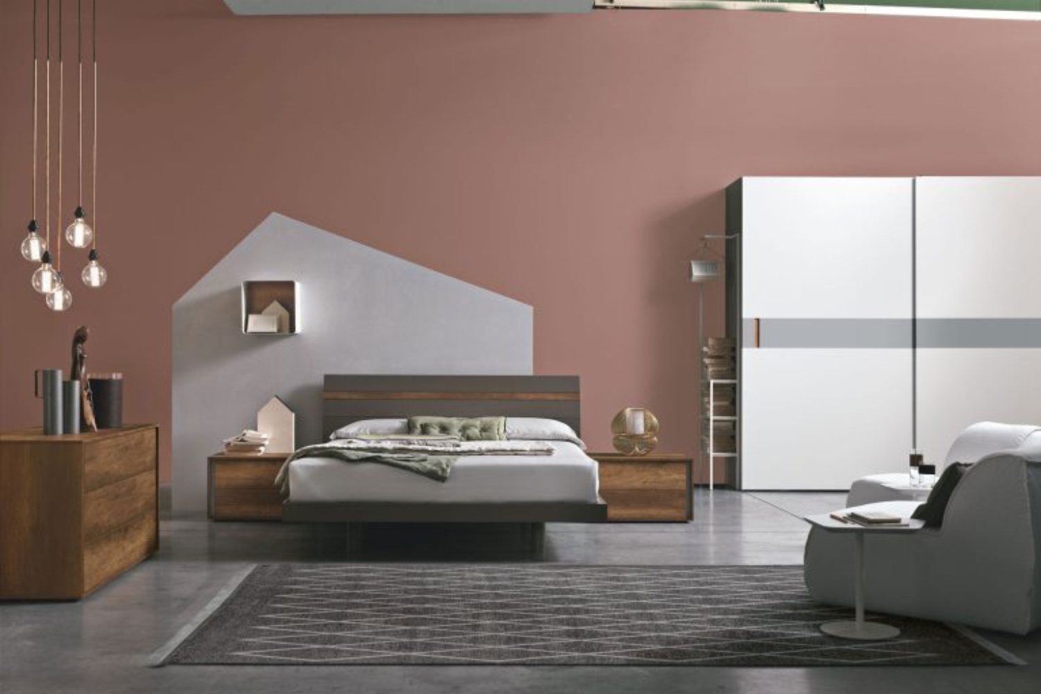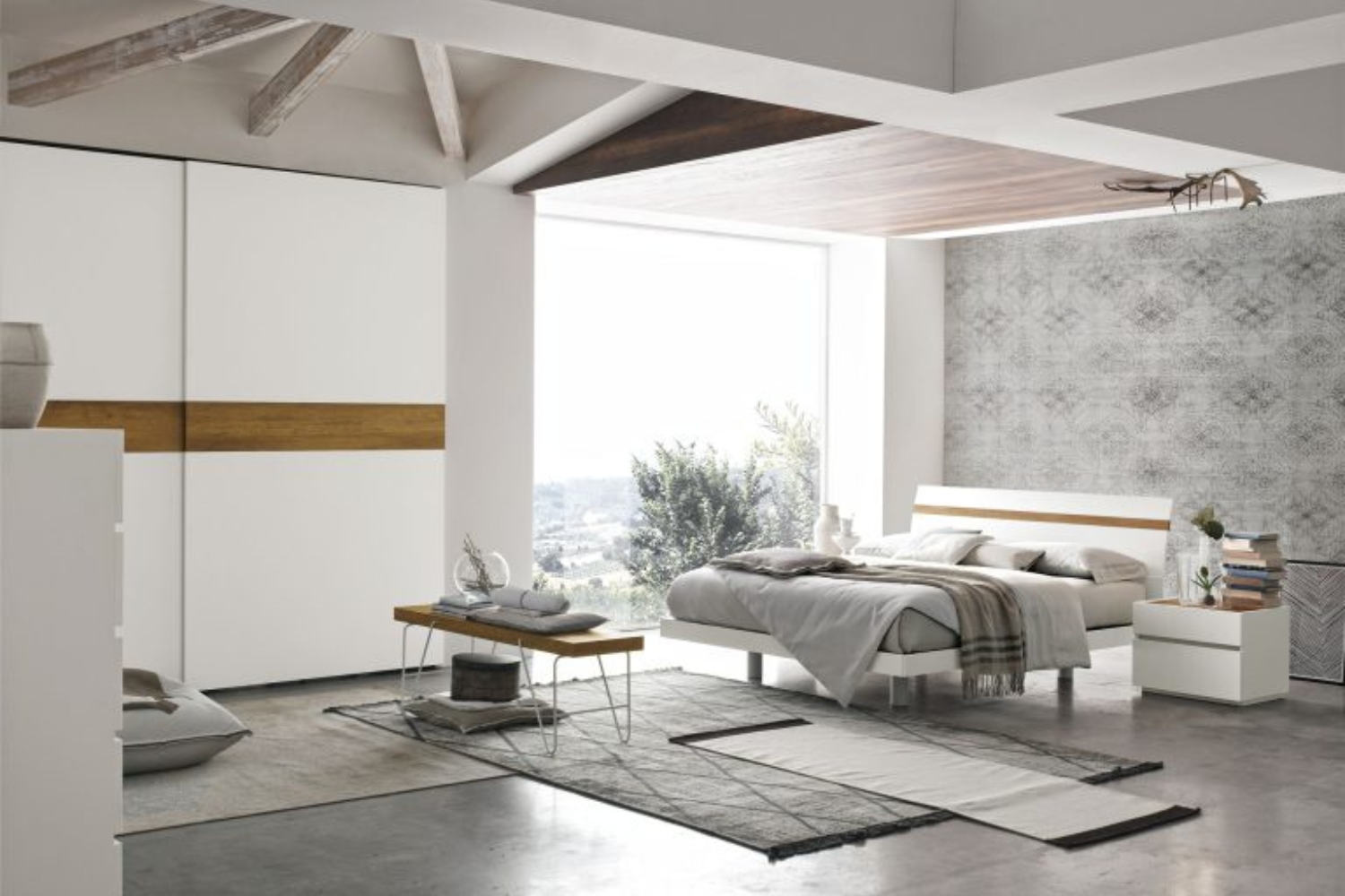 A horizontal line highlights the headboard's design, while contrasting tones and materials underscore and enrich the interaction of lines.
