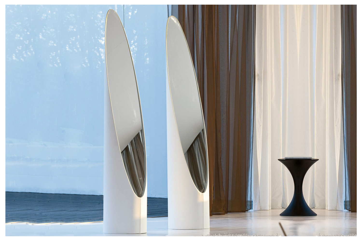 The Kolonika mirror makes a bold geometric statement, perfect for modern bedrooms. Its unique silhouette features a round base that tapers elegantly at the top, creating a striking visual appeal. The long, angled mirror is ideal for effortless reflection while preparing for the day. Crafted with contrasting materials for added sophistication, it blends style with functionality. Built for durability, the Kolonika mirror promises lasting beauty and performance in any contemporary space.
