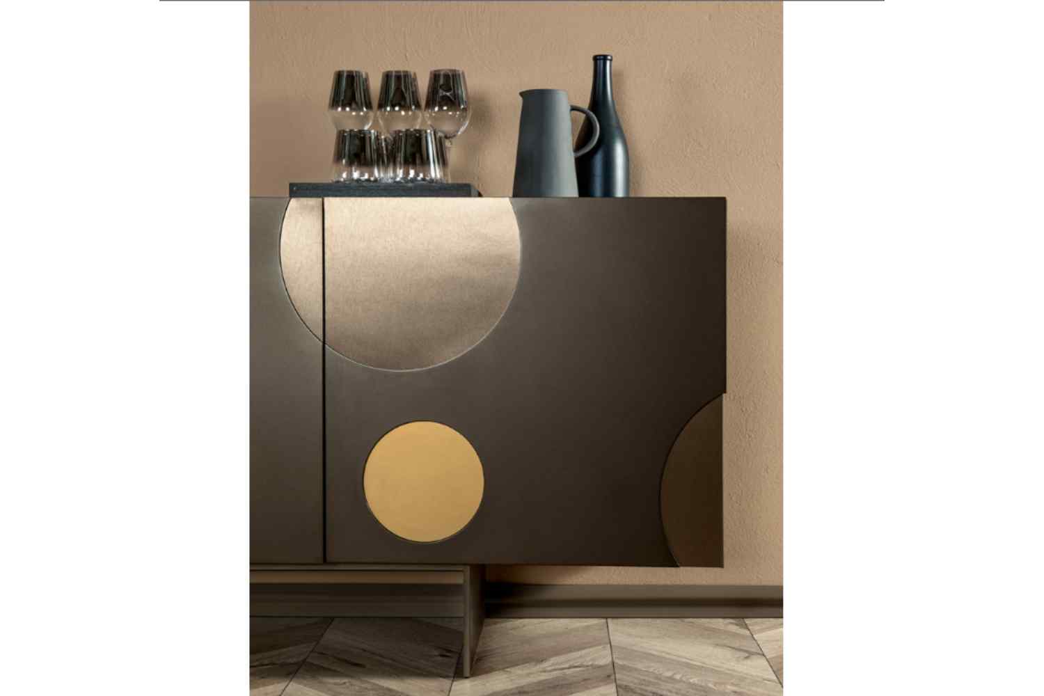 Matisse is characterized by a lacquered MDF sideboard adorned with inset decoration, resulting in a translucent effect. Its defining feature is a playful yet elegant blend of colors.