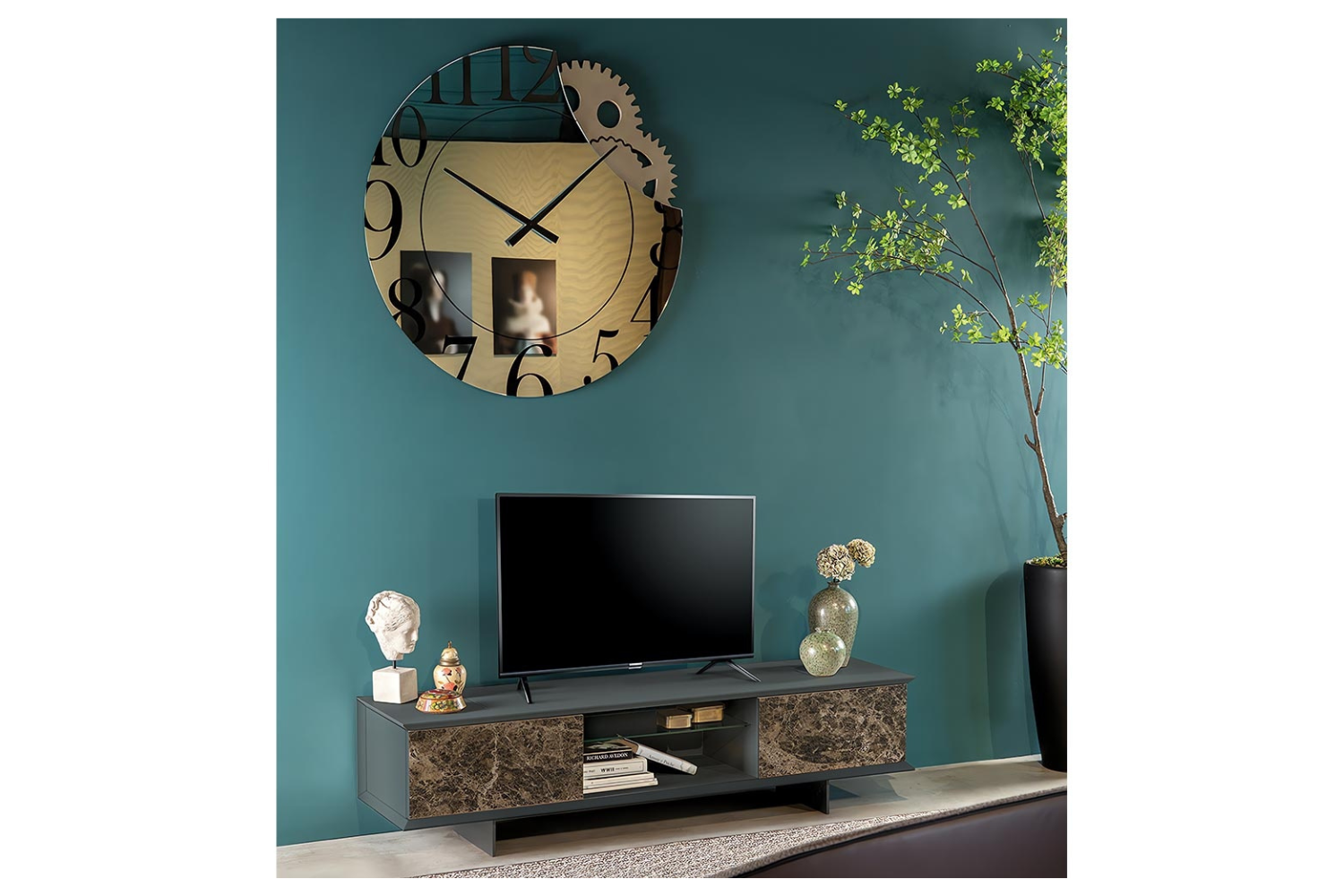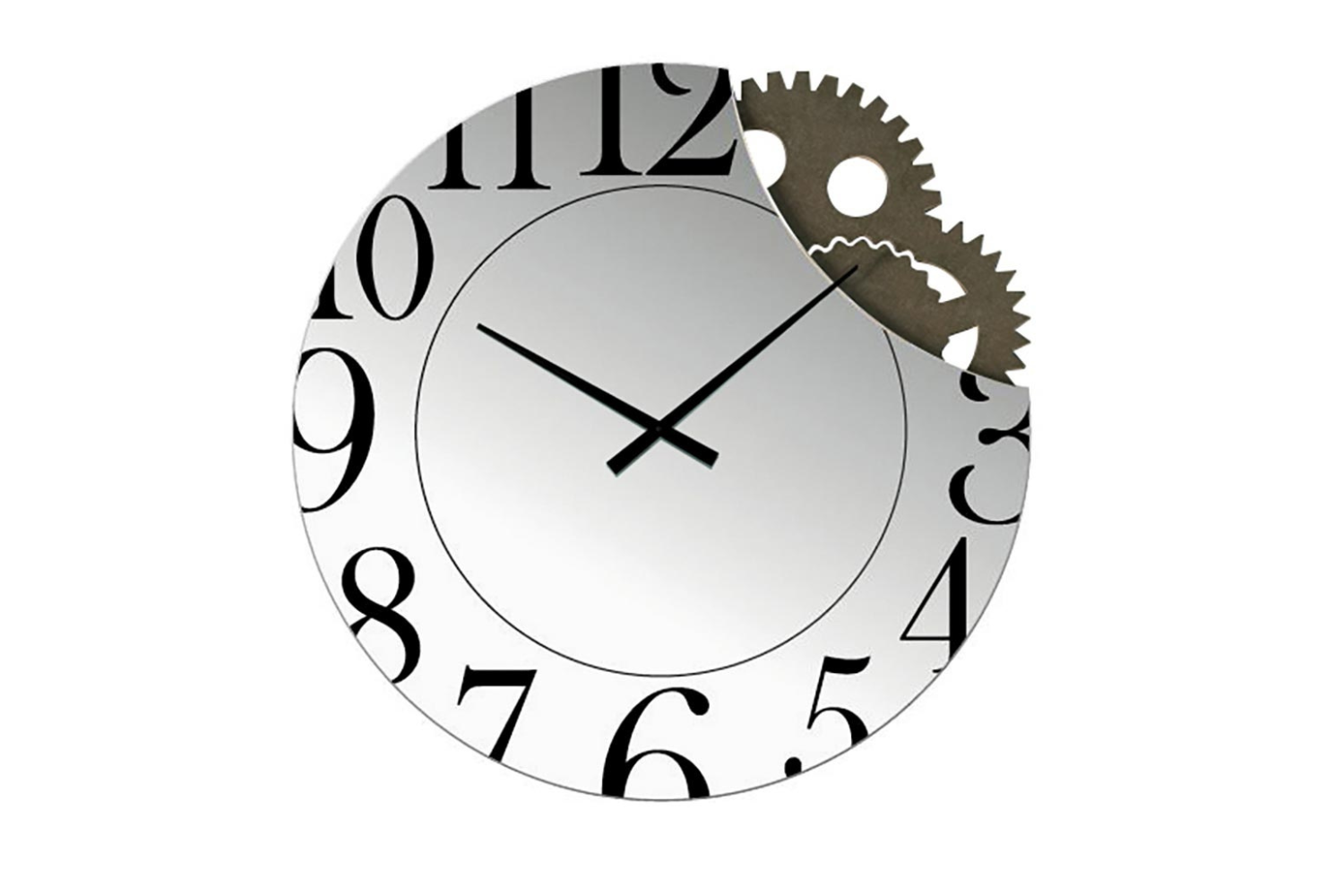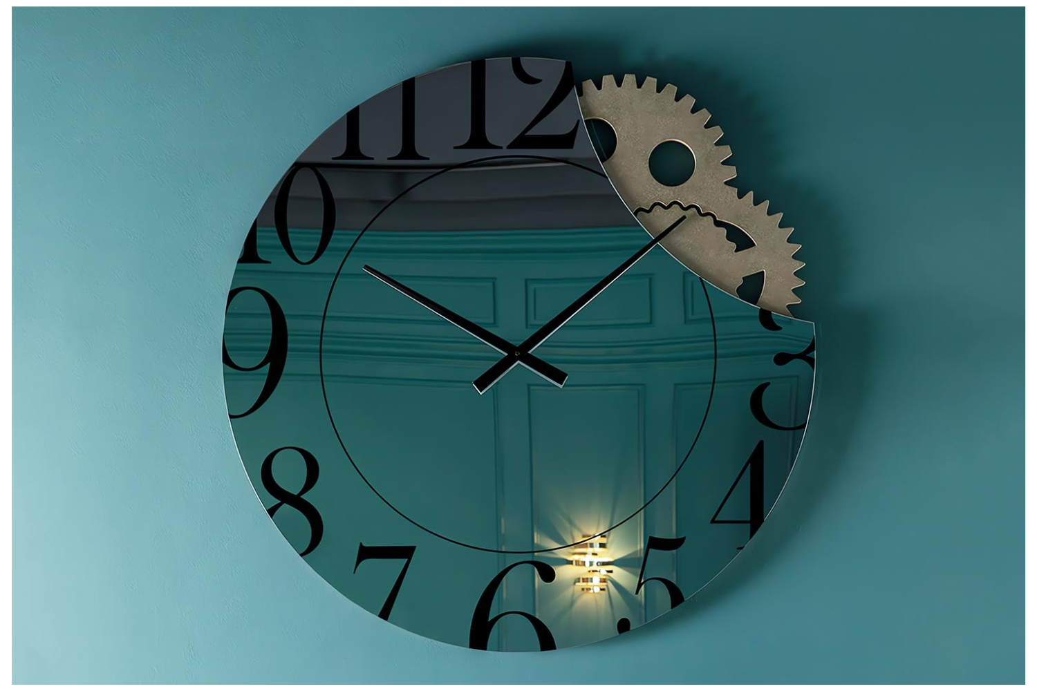 • Combines a mirror, clock, and wall art in one piece Bold numbers and clock hands at the center for time-telling Exposed gears add an industrial touch and reveal the inner workings of time Ideal for modern spaces, blending functionality with style