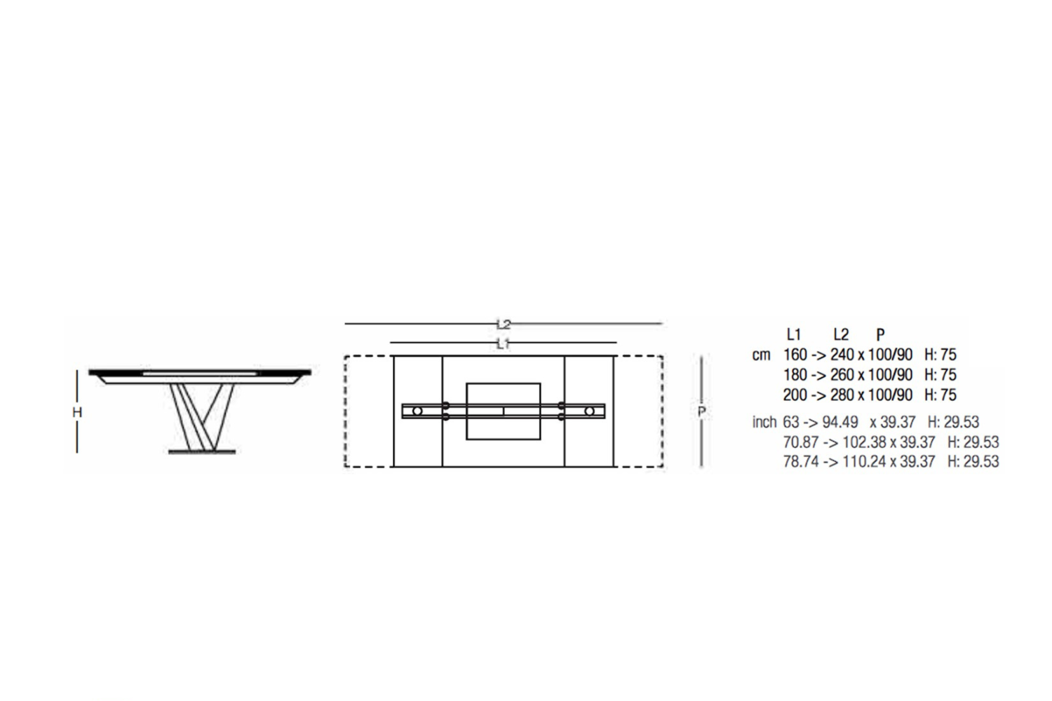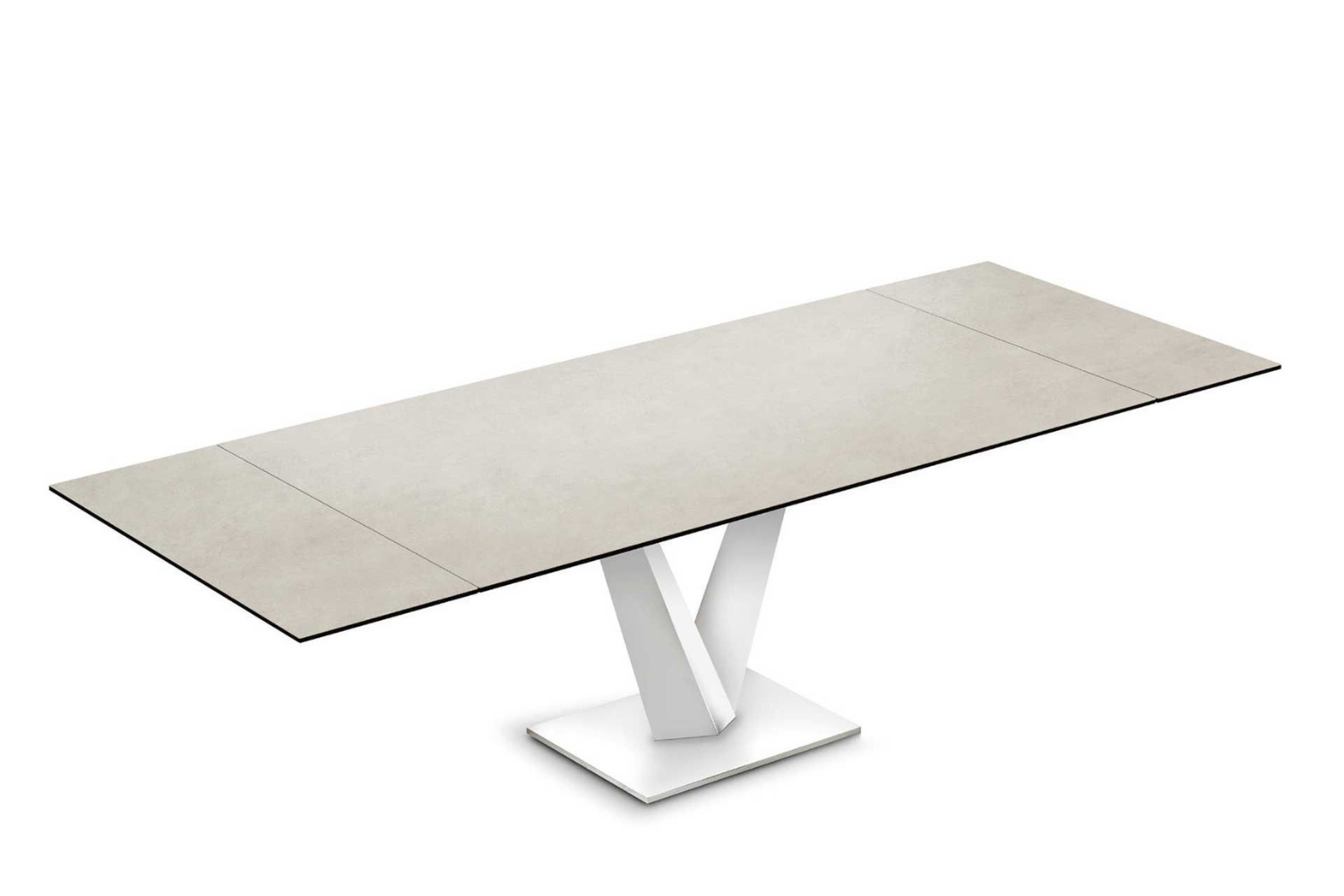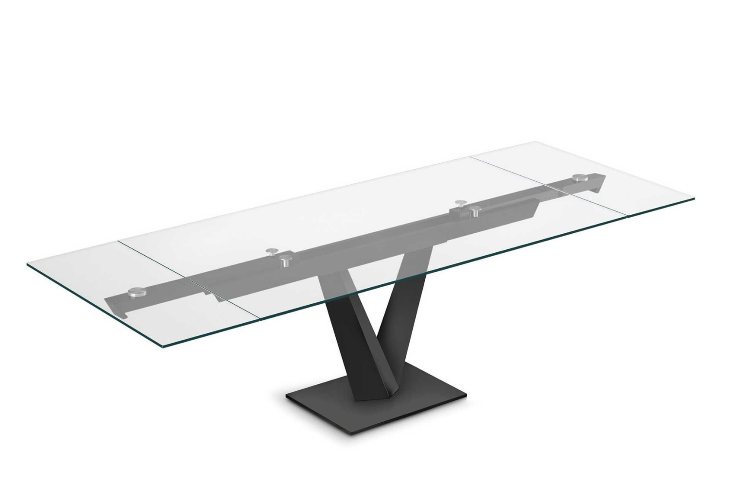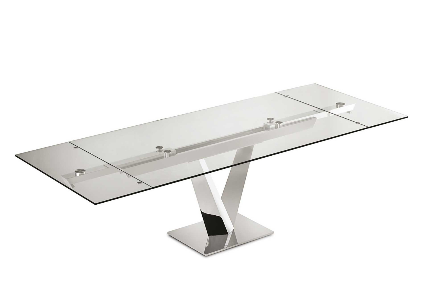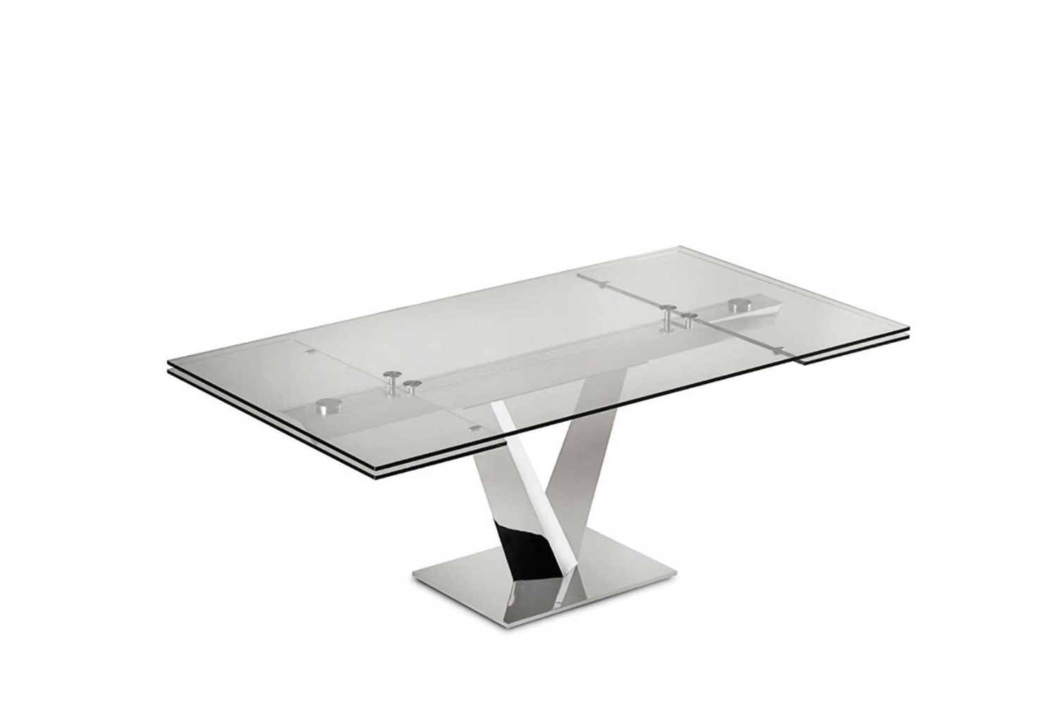 Extendable dining table, with top and extensions of glass. Base and track of chromed or painted metal. A very easy patented mechanism to pull out the lateral extensions allows the widening of the top of cm 80. Available also with ceramics tops.