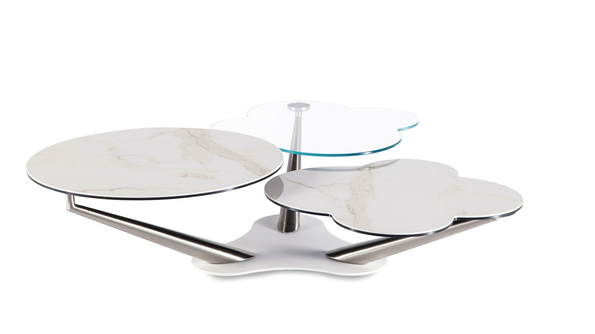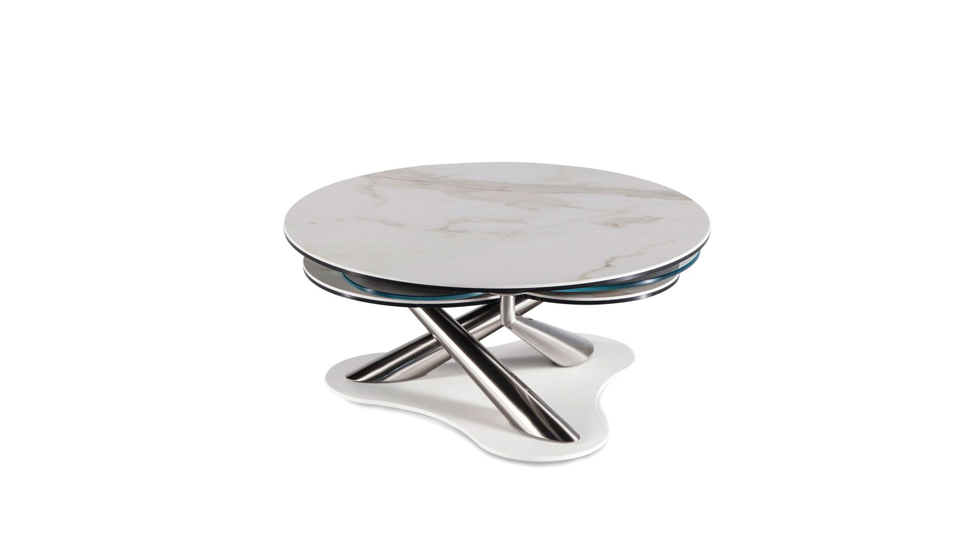A coffee table with extendable functionality, featuring three synchronized revolving tops in glass or ceramic. The unique tops and mechanism geometry enable the lower tops to be concealed when in the closed position. The base and supports are crafted from painted or chromed steel.