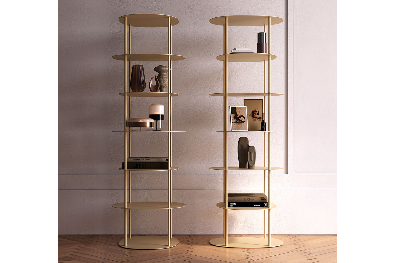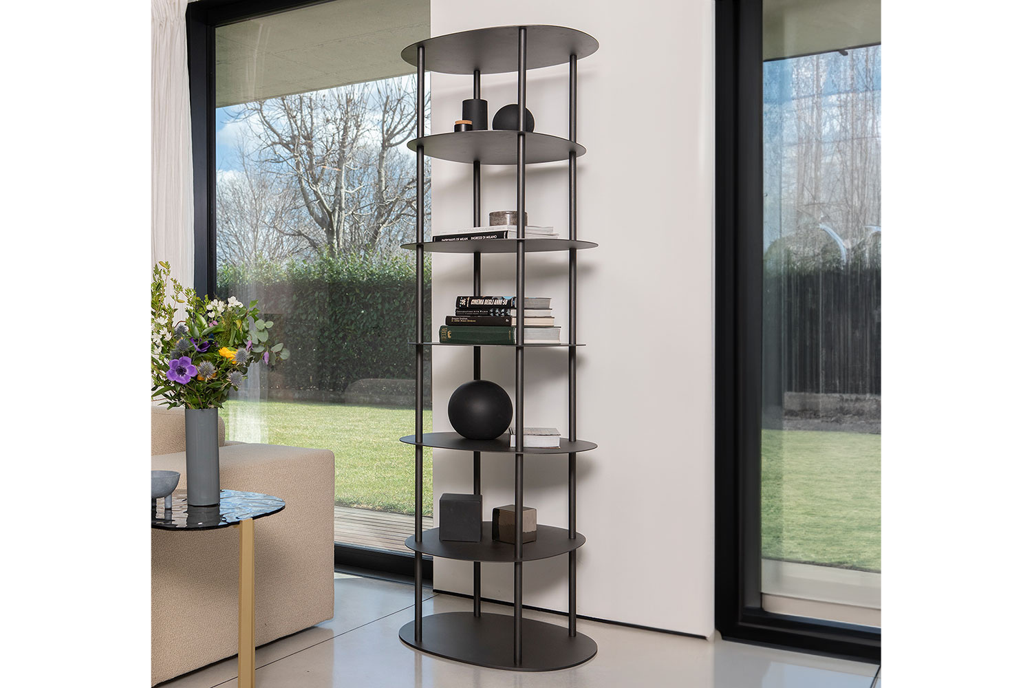 The Oasia bookshelf offers a refined and modern way to showcase your belongings. Its chic geometric design features four surrounding bars and seven round shelves, creating an open and airy aesthetic. The tall, slender silhouette seamlessly fits into various spaces, from living rooms to studies. With sturdy shelves, it provides ample space to organize and display décor, books, photos, and more, adding a refreshing touch to any room.