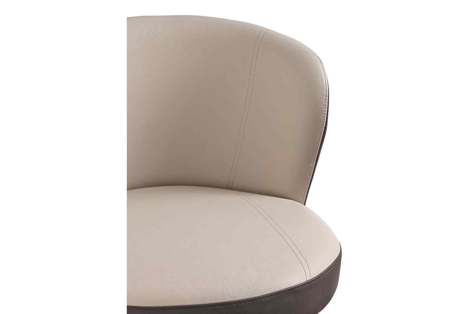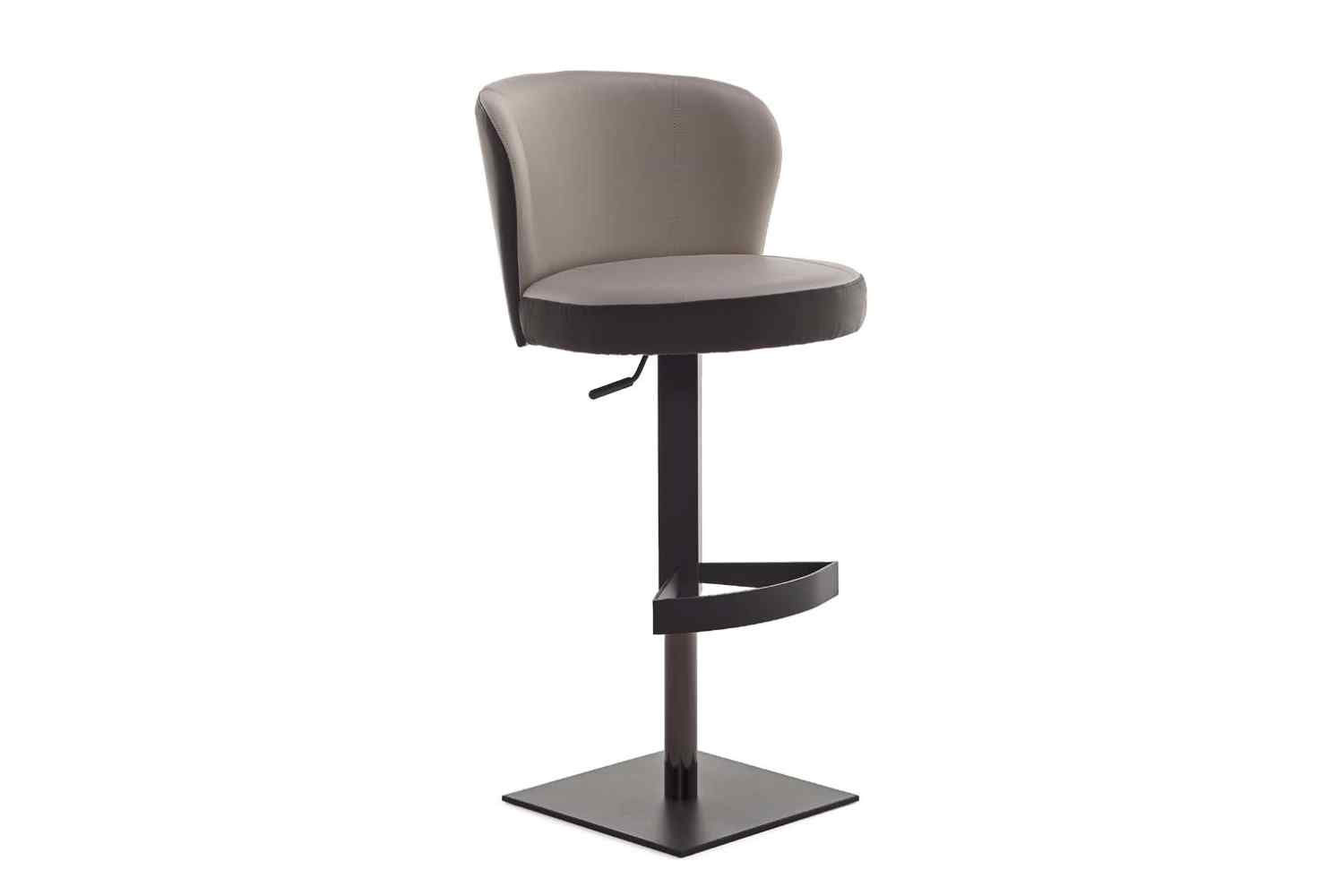 Modern bar stool with cast iron base covered with stainless steel plate, gas lift, seat/back and footrest metal frame with plywood seat pad, covered with polyurethane foam and upholstered in fabric, leatherette or leather.