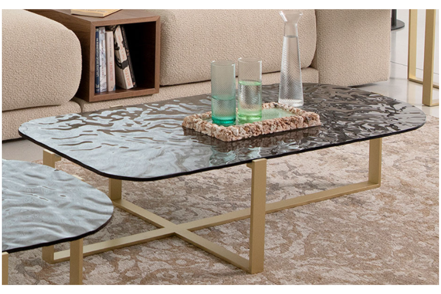 The Oceano coffee table is a striking centerpiece that effortlessly enhances any contemporary living room. Its uniquely rippled glass top captures the mesmerizing effect of water in motion, creating an artful, asymmetrical profile. Complementing this intricacy, the interlocking geometric base offers a bold contrast with its clean lines and solid structure, blending style and substance for a truly distinctive design. Crafted with a harmonious mix of materials, the Oceano coffee table brings a vivid interplay of textures to your space. Available in two sizes, it provides ample surface area for decor and everyday essentials while maintaining a visually lightweight and elegant presence. With its luxurious fume glass top and choice of two sleek metal finishes for the base, this table is designed to meet the highest standards of form and function.