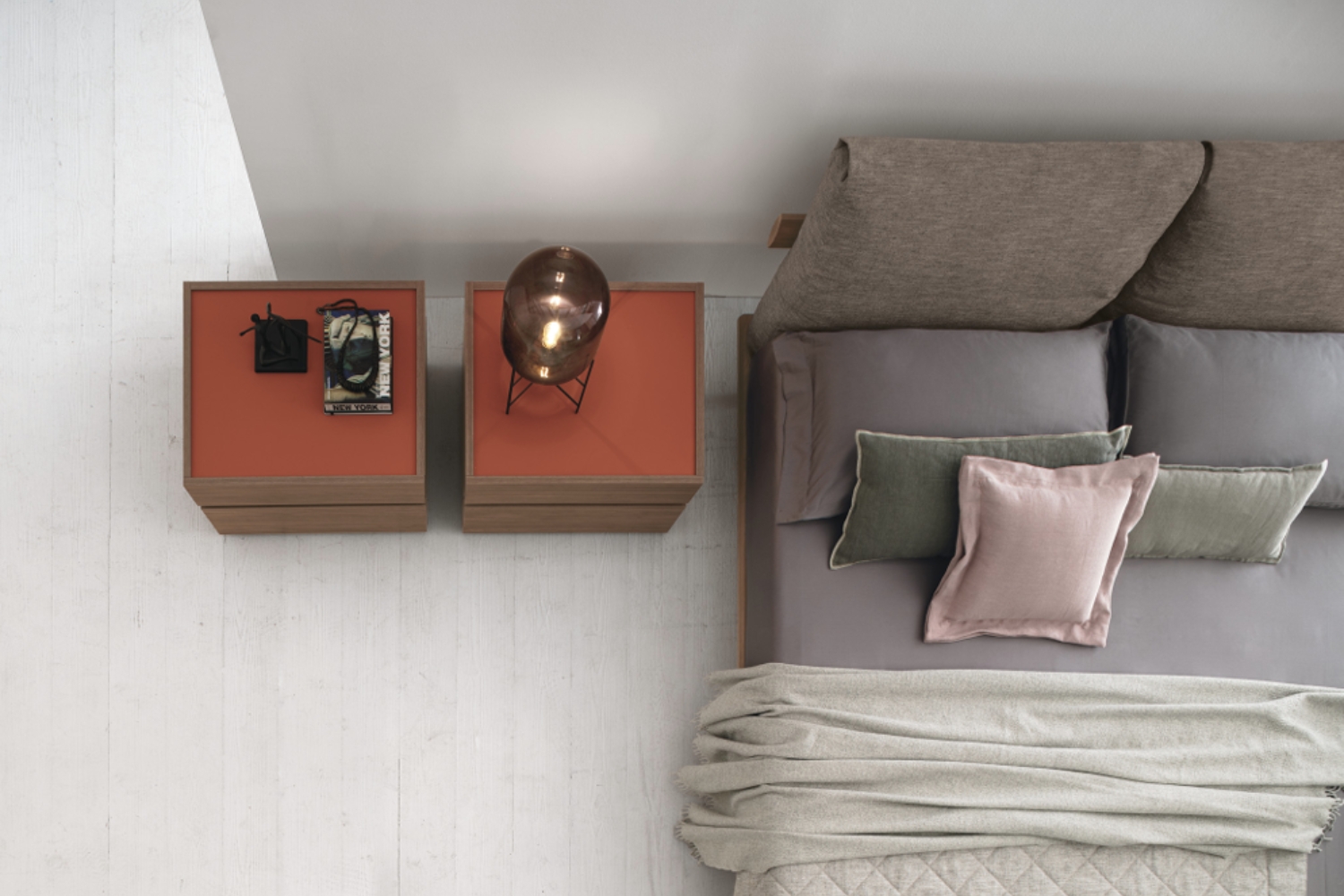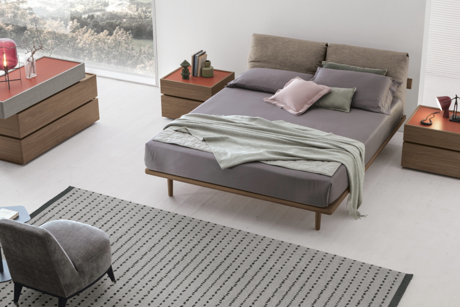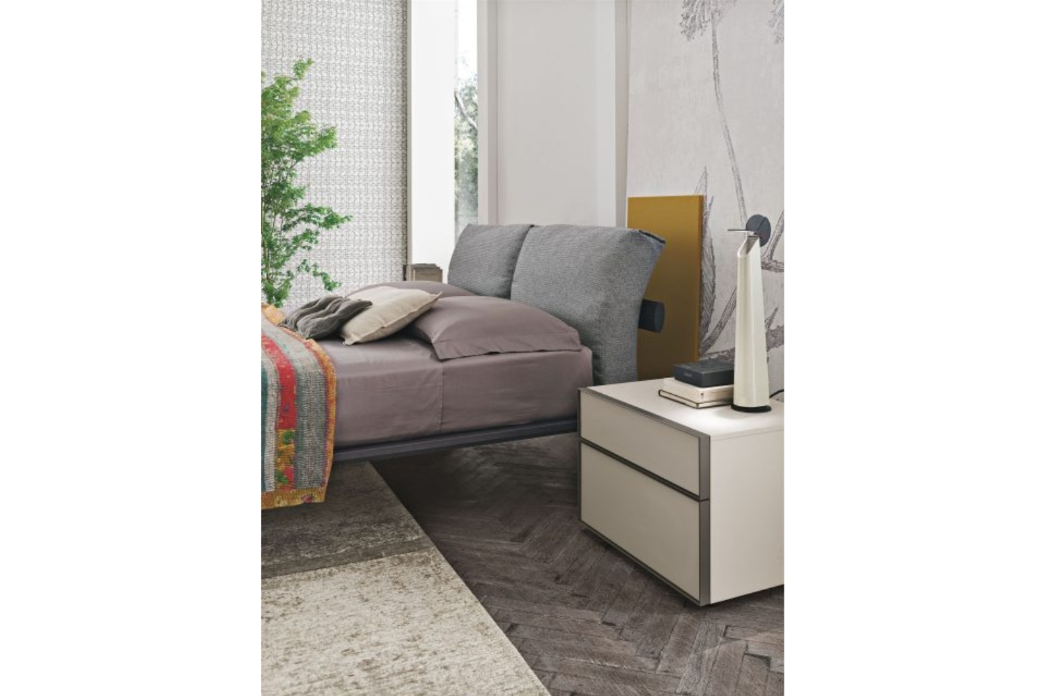 In a modern bedroom setting, the Piuma bed by Tomasella captures attention as a captivating centerpiece. Its timeless design features an upholstered headboard divided into two sections resembling pillows, ensuring comfort while reading or watching TV in an upright position. The headboard, legs, and frame showcase diverse finishes, enhancing the bed's visual appeal while seamlessly integrating with the room's overall aesthetic. With a range of leg styles to choose from, you can opt for either a traditional or bold geometric appearance to suit your preference. Crafted from premium materials, this bed guarantees longevity and durability.