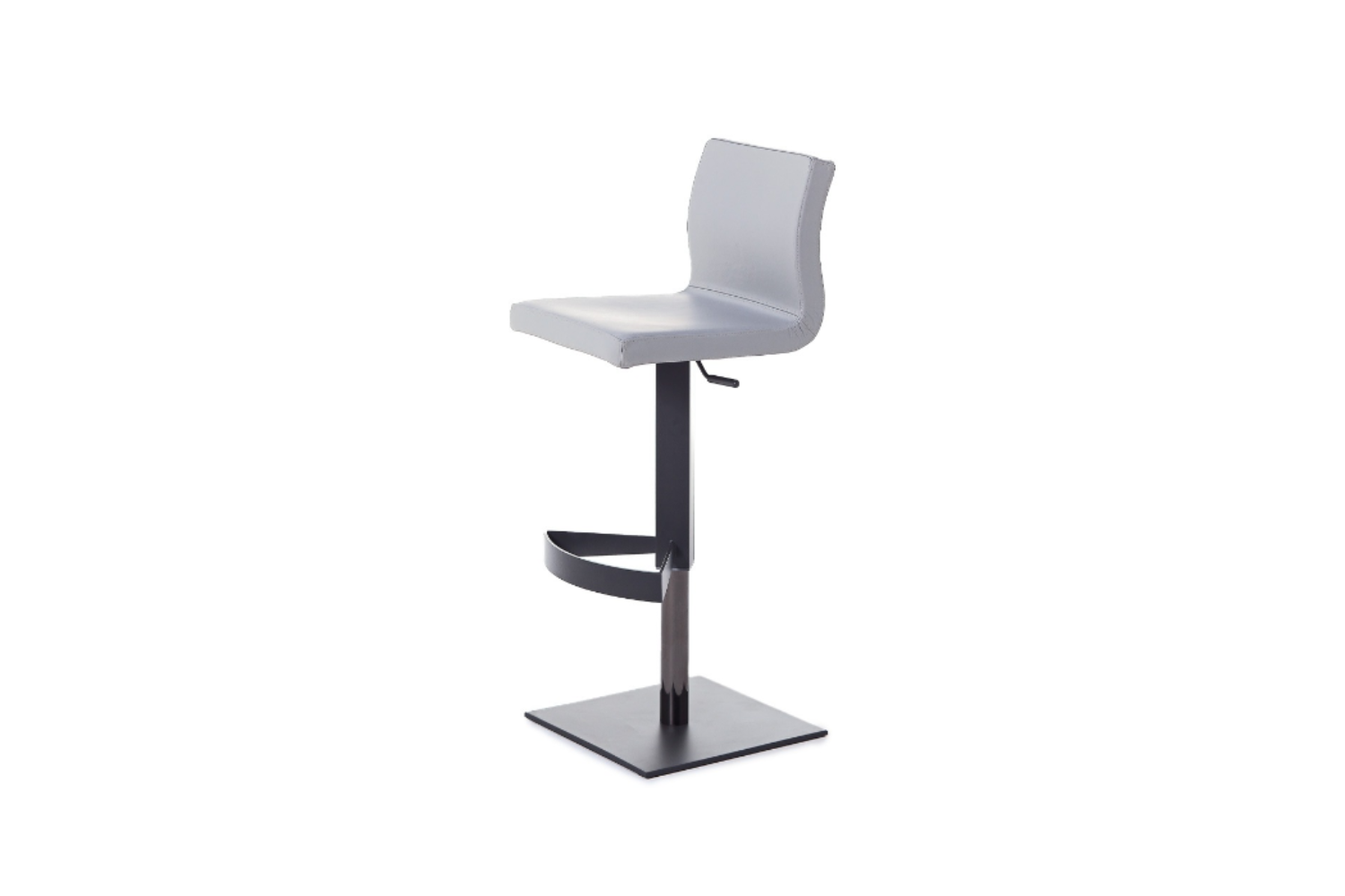 Adjustable and swivel stool with cast iron ballast covered with stainless steel cover, gas piston, footrest, multi-ply beech shell seat covered with polyurethane rubber and upholstered in fabric, imitation leather or genuine cowhide of Italian origin