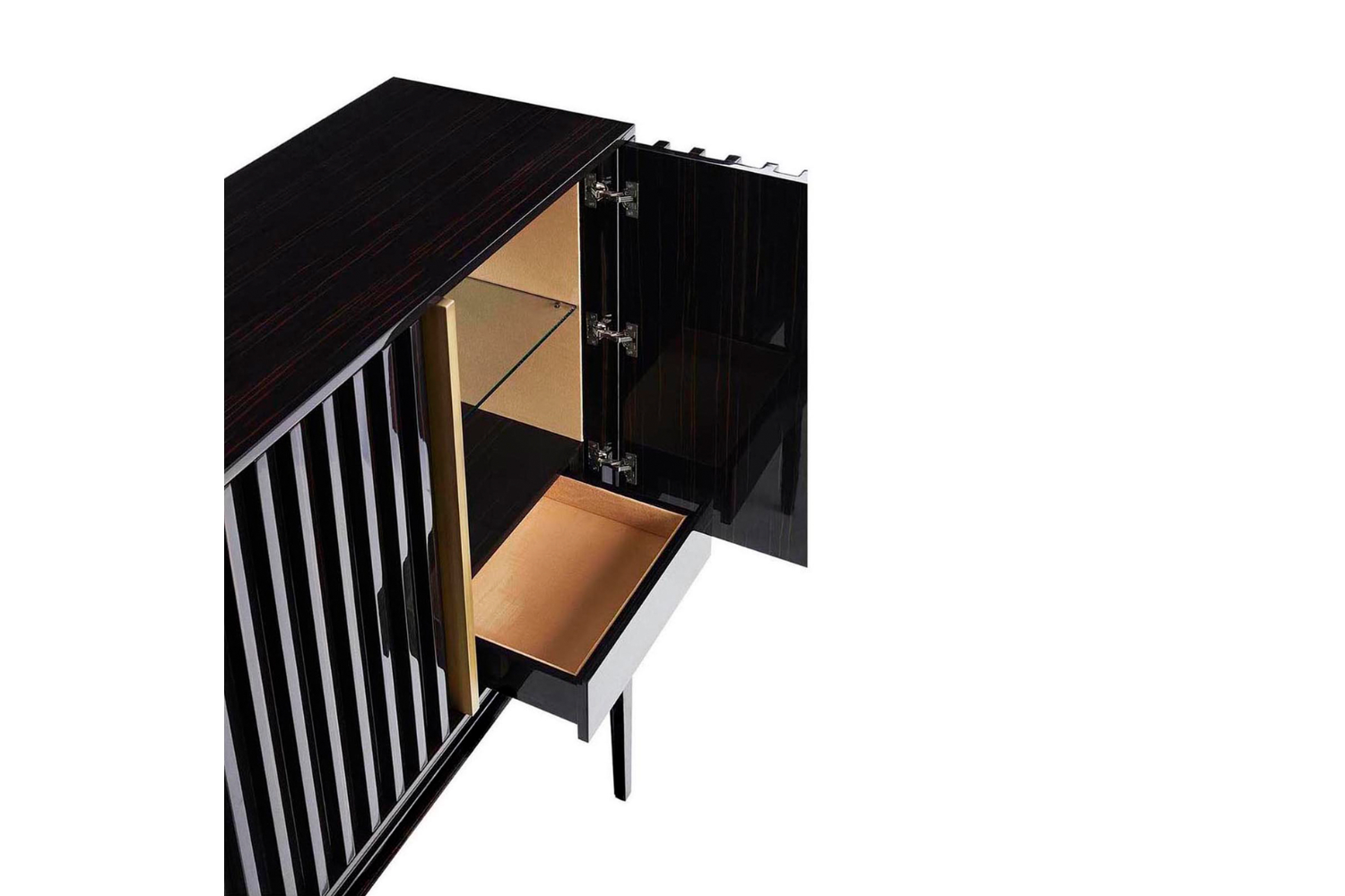The Revel Bar Cabinet is an essential statement piece for any modern living room. Crafted with a sleek, contemporary design and superior quality, it’s sure to captivate attention. Featuring a striking slatted structure and refined metal handles in brass or stainless steel, the Revel Bar Cabinet exudes bold character and timeless style, elevating your space with effortless elegance.