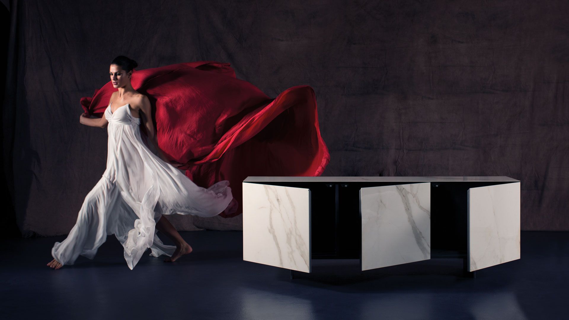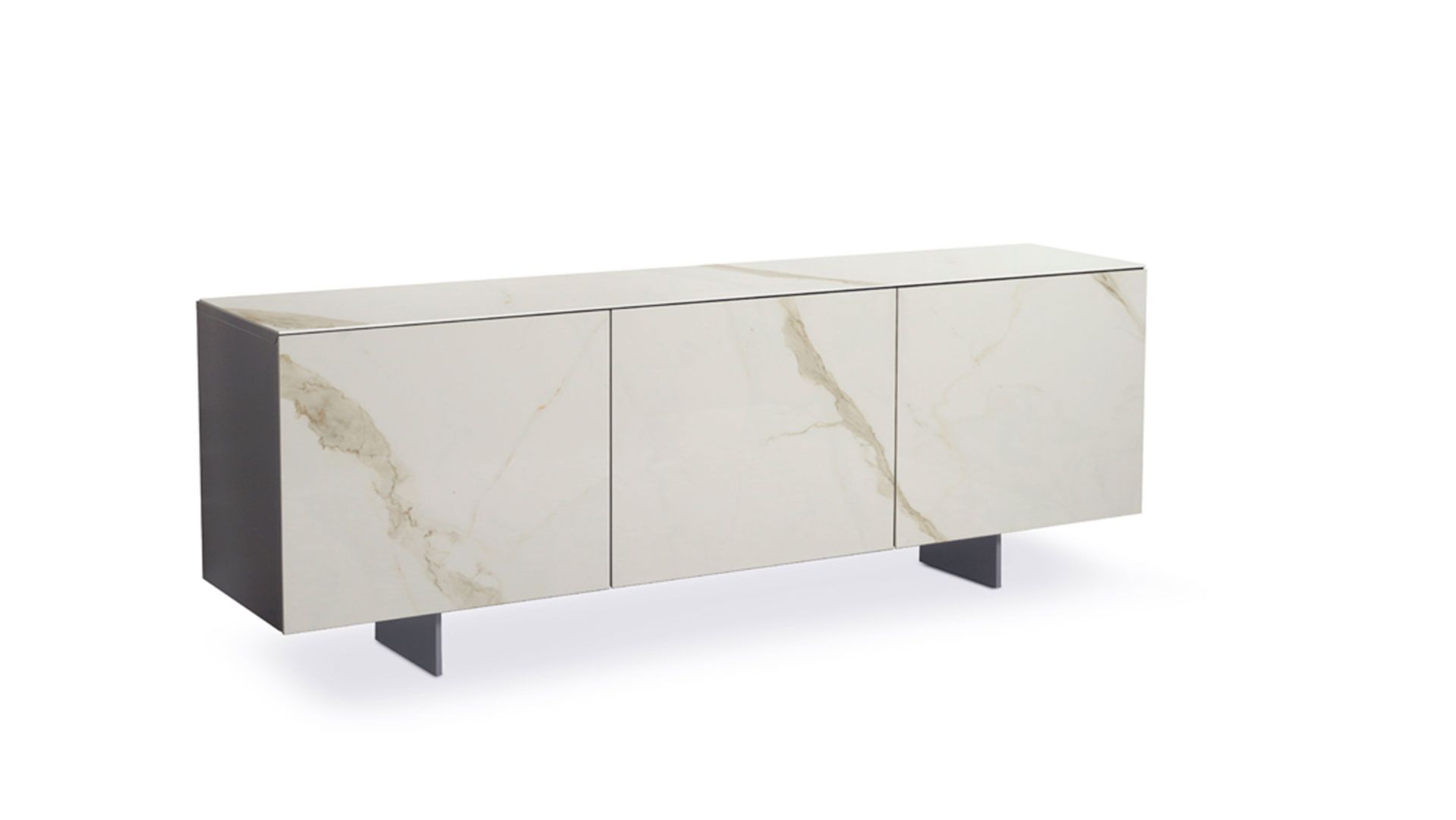 Three doors sideboard in wood with top and doors covered in ceramic. Internal shelves in glass. Hinge with automatic opening system and closing lock.Wooden sideboard featuring three doors, with a ceramic-covered top and doors. Internal glass shelves and a hinge equipped with an automatic opening and closing lock system.