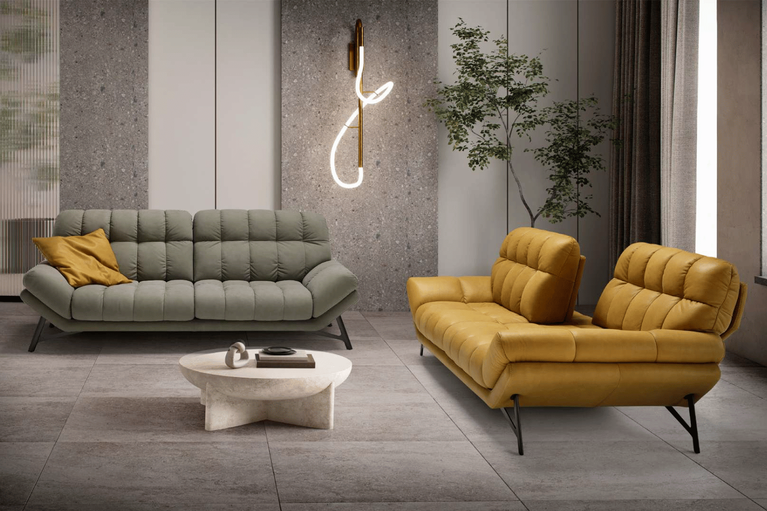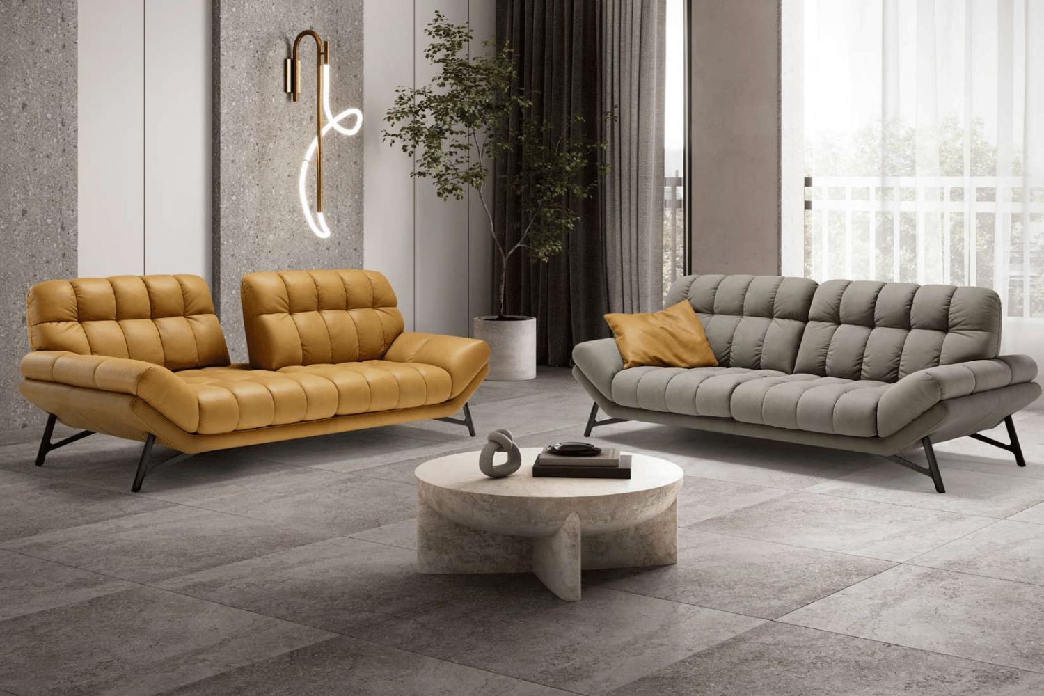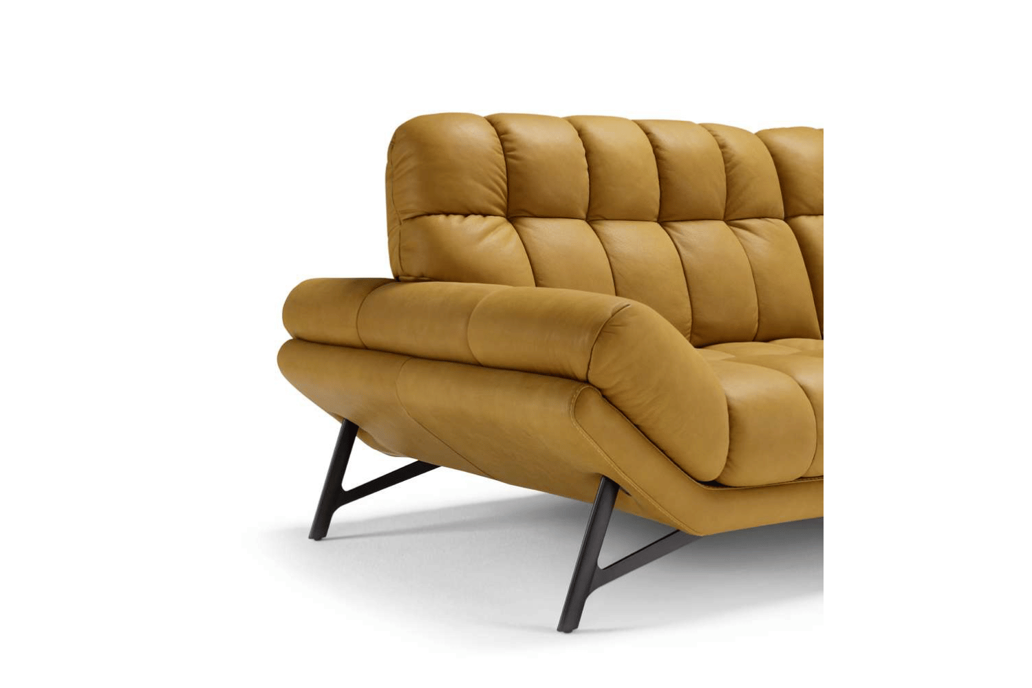 Spigla is an elegant design that focuses on the originality of its shapes. Characterized by a deep quilting on the seat and on the backrest as well as sophisticated details of the metal feet, it features a tilting backrest and inclined armrests that add extra comfort. Available in both leather and fabric covering, as well as with tilting mechanism and fixed backrest with reduced depth, it offers the possibility of configuring sofas in various sizes and in combination with chaise lounges.