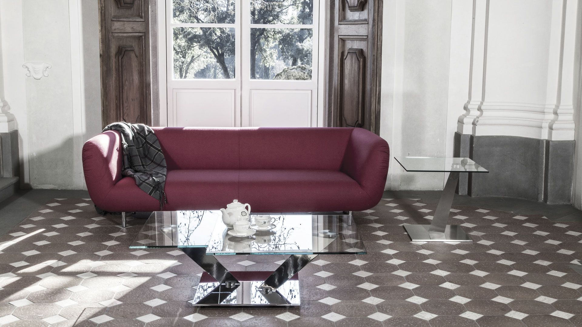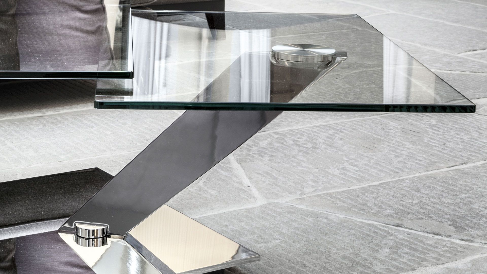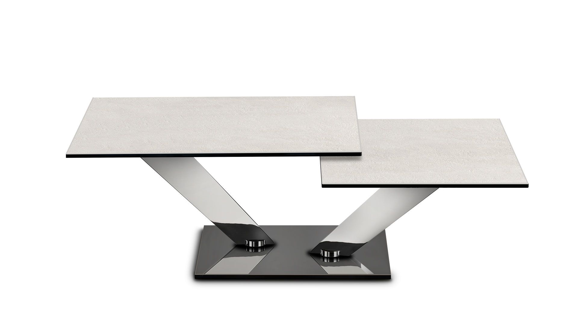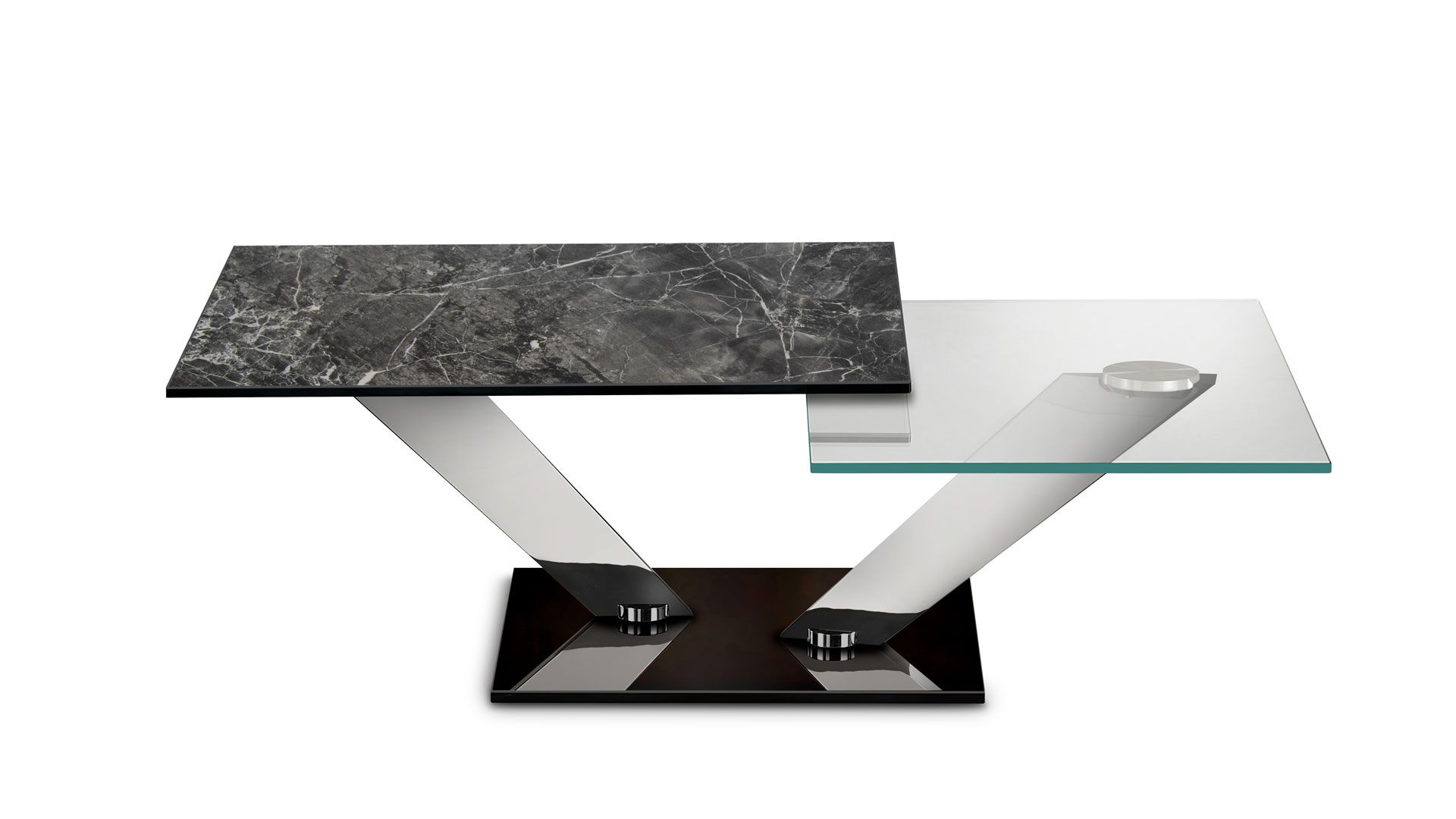 Extendable cocktail table with synchronized revolving glass tops. Base and supports in galvanized or painted steel. Available also with ceramics, painted glass or mirror base. Available ceramics tops.