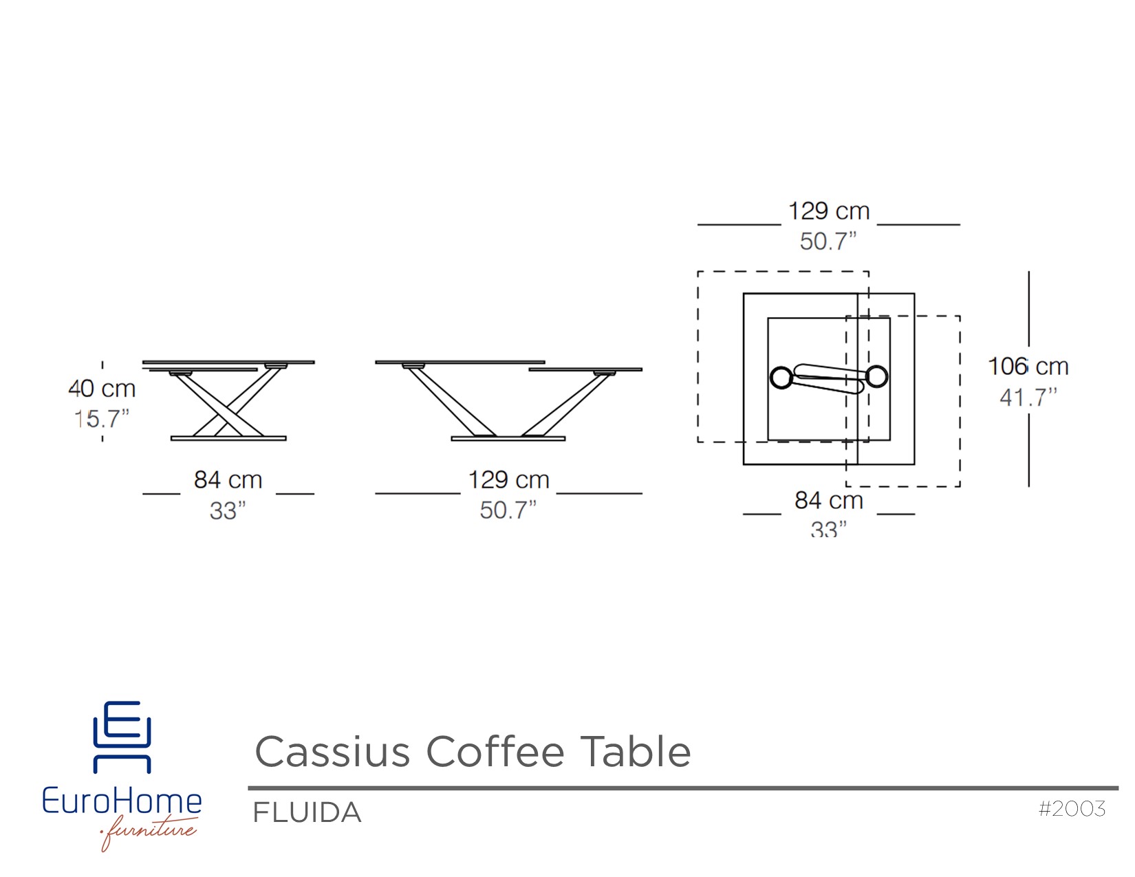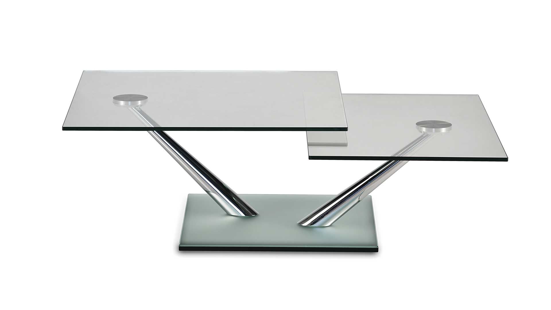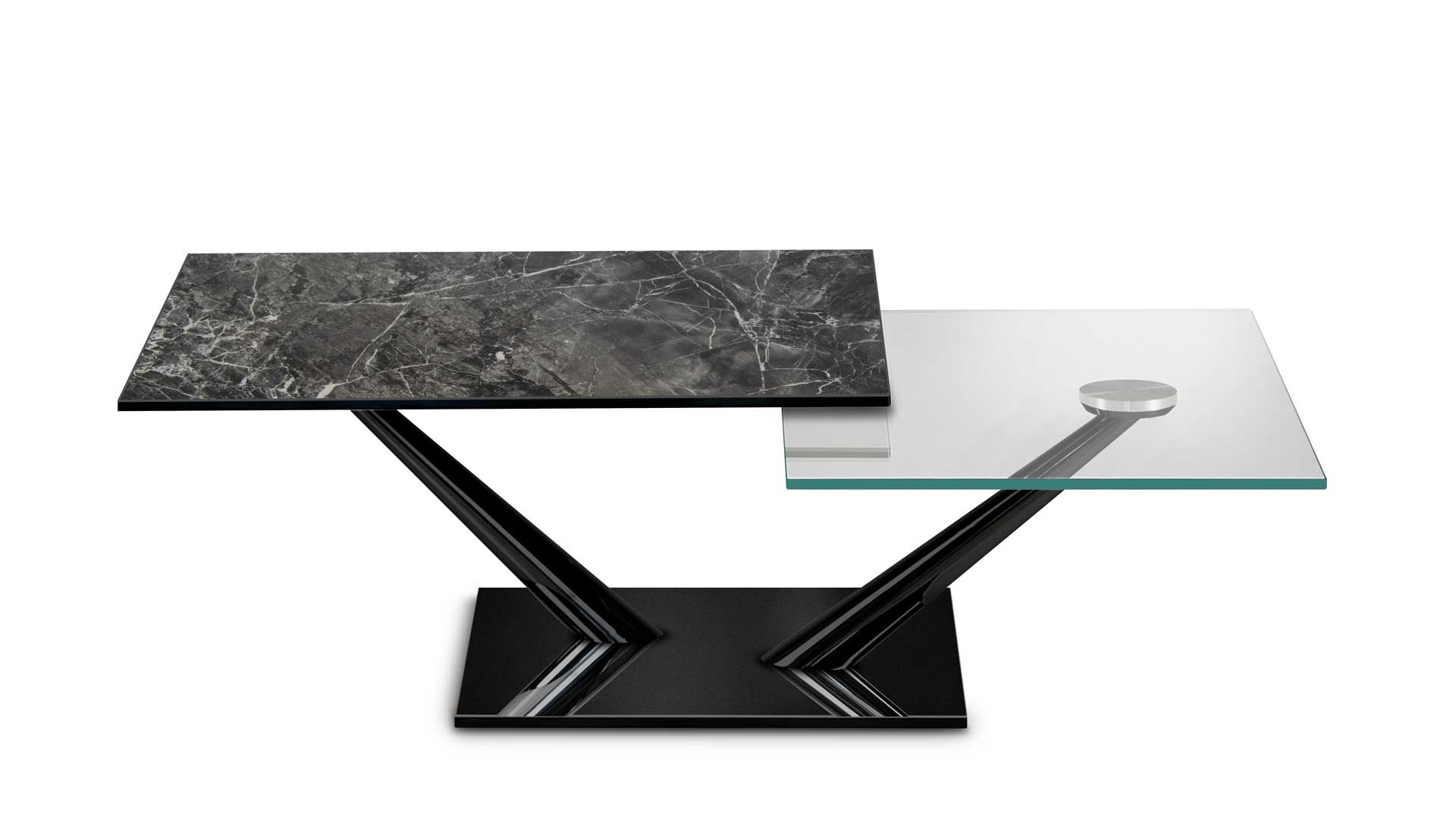 An extendable coffee table with synchronized revolving glass tops. The base and supports are constructed from galvanized or painted steel. It is also offered with a base in ceramics, painted glass, or mirror, with various ceramic tops available.