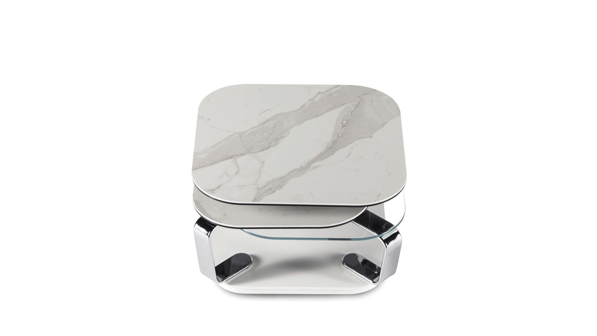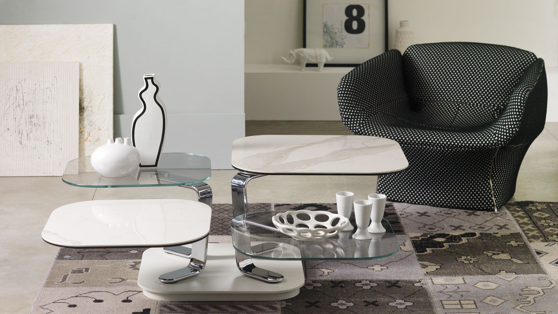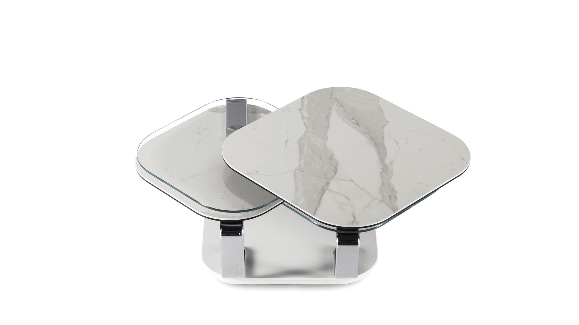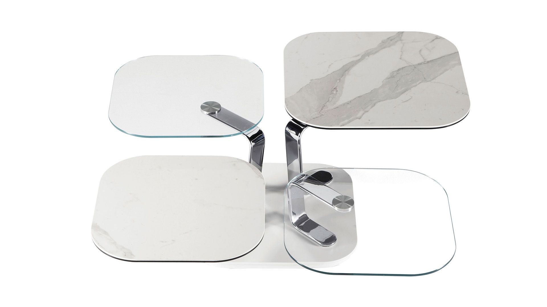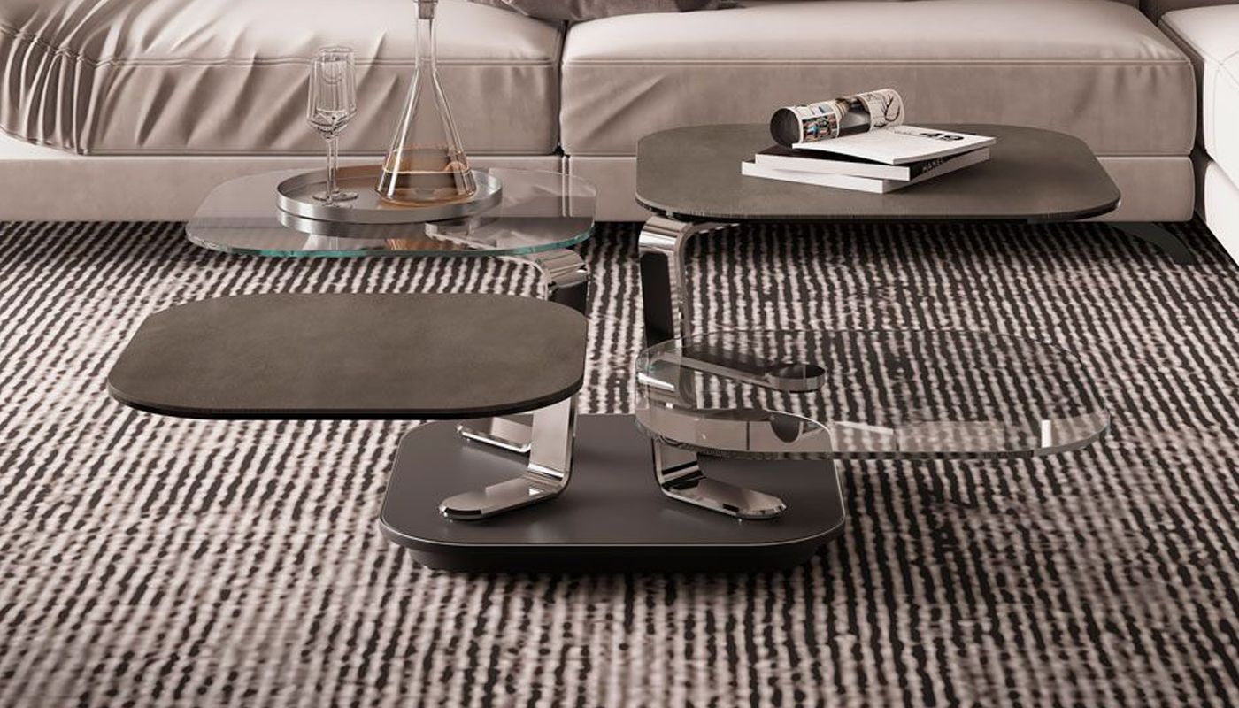 An extendable coffee table featuring four glass or ceramic tops. It is equipped with an innovative double synchronized mechanism that allows all four tops to be opened simultaneously with a simple gesture, and they can be placed in different directions. The supports are crafted from painted or chromed steel.