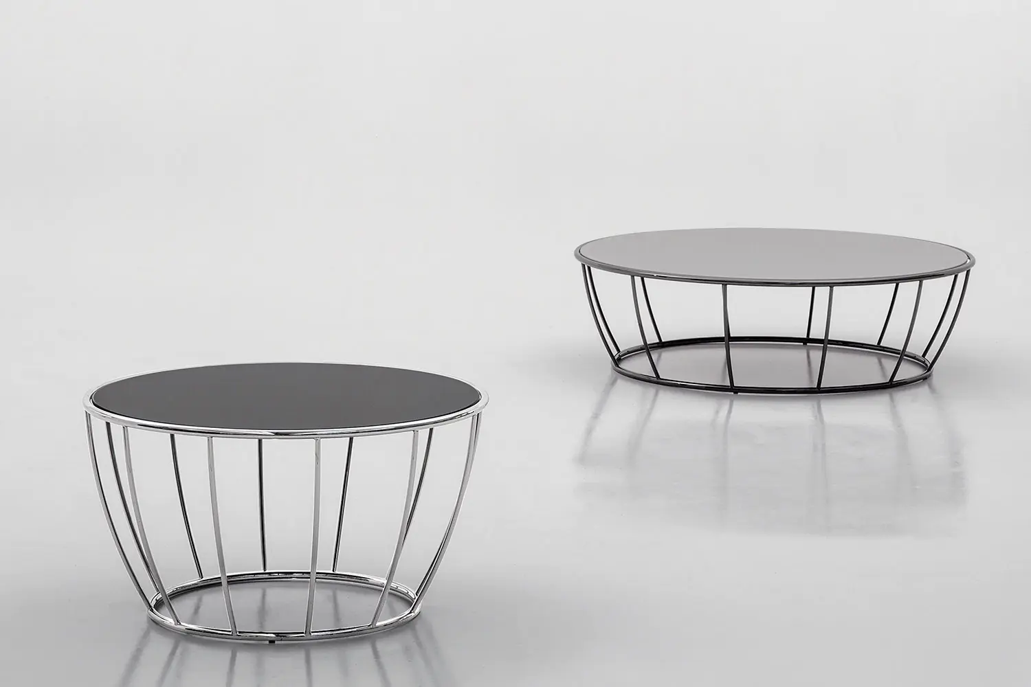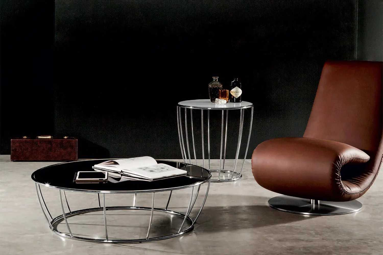 The Amburgo coffee and side tables embrace sleek lines, crafting a space that is illuminated by the voids within the structure. Chromed or stone bronze metal tubes ascend to support the tabletop, which is available in black, white, beige tempered glass, or porcelain stoneware.