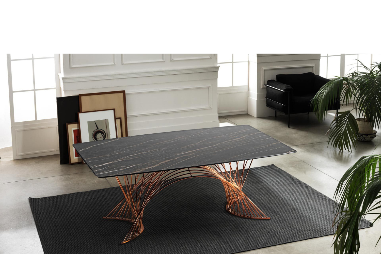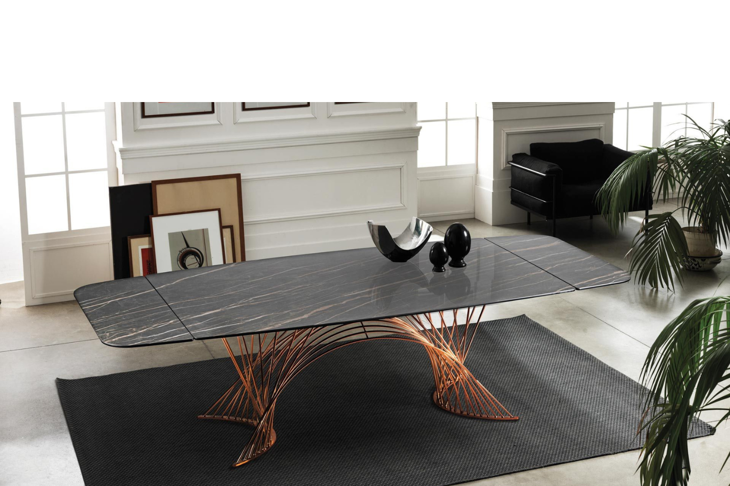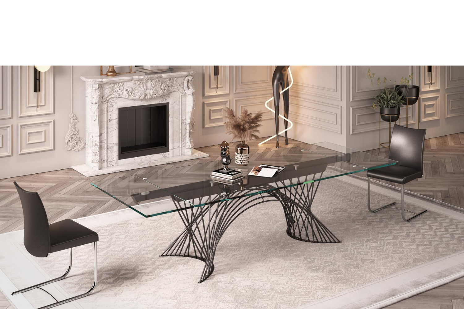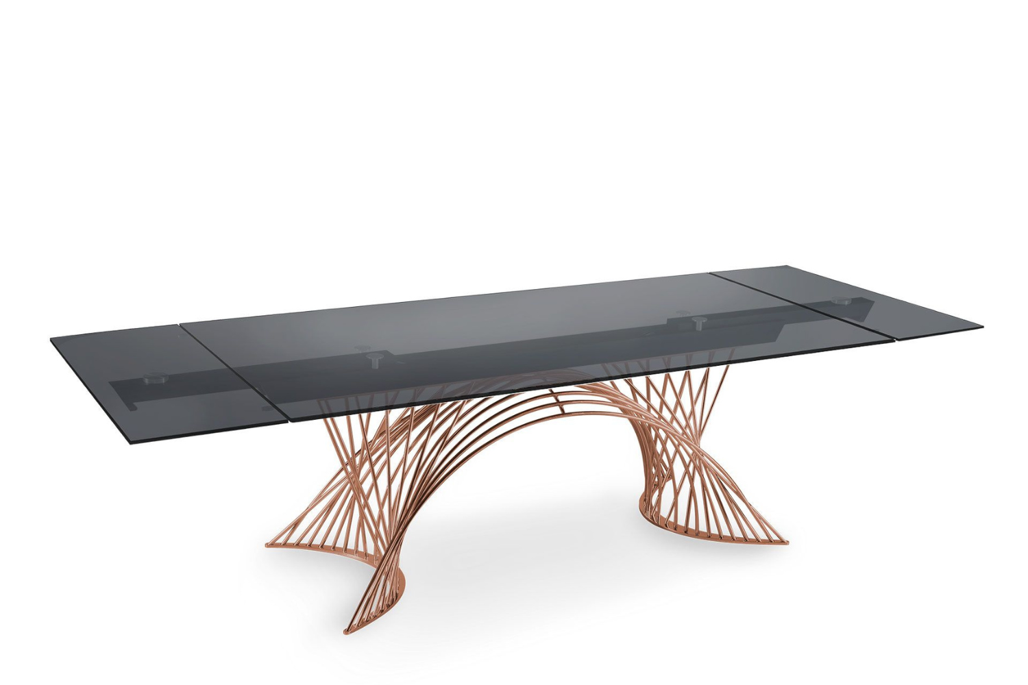 Extendable dining table, with top and extensions of glass. Base and track of chromed or painted metal. A very easy patented mechanism to pull out the lateral extensions allows the widening of the top of cm 80. Available also with ceramics tops.