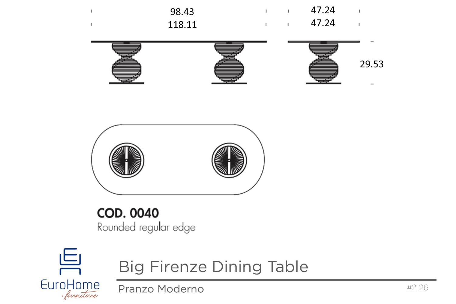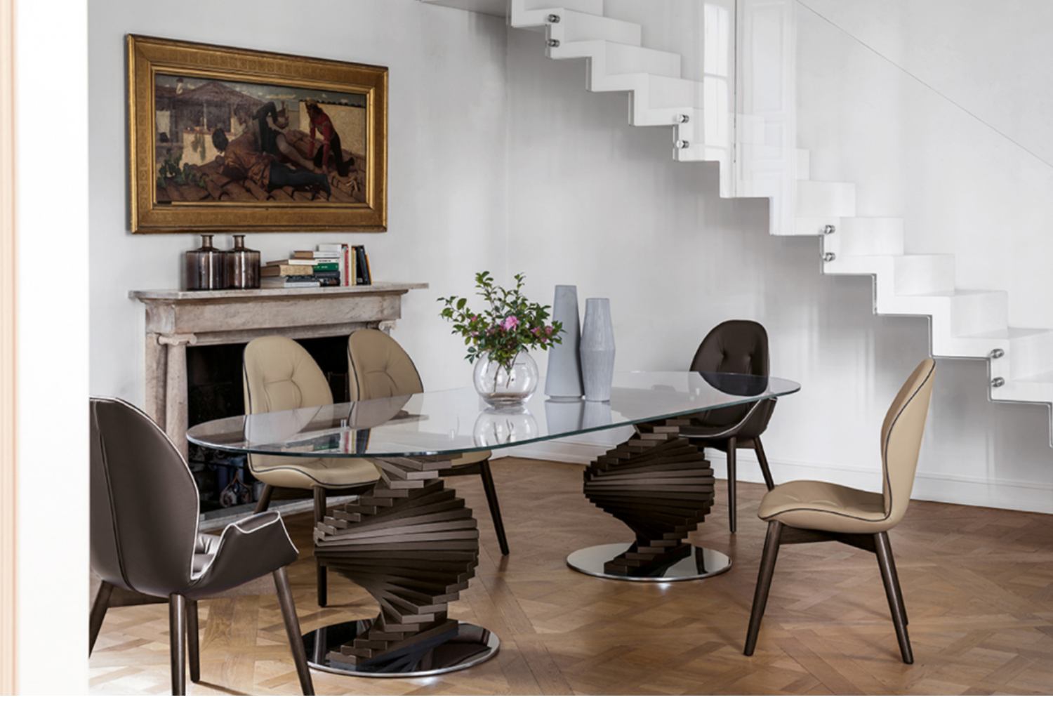 The defining feature of the Firenze table is its base, meticulously crafted from solid Canaletto walnut or dark oak slats. These slats are paired with precision, creating a captivating spiral sculpture that conjures an elegant optical illusion. Completing the ensemble is a glass or porcelain stoneware top, available in multiple sizes. Pranzo Moderno's distinctive approach seamlessly integrates precision, quality, and practicality, offering the table with options for both single and double bases.