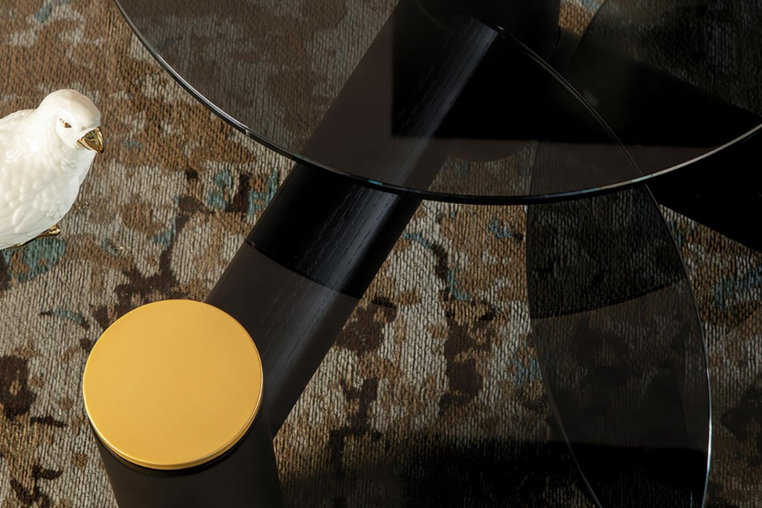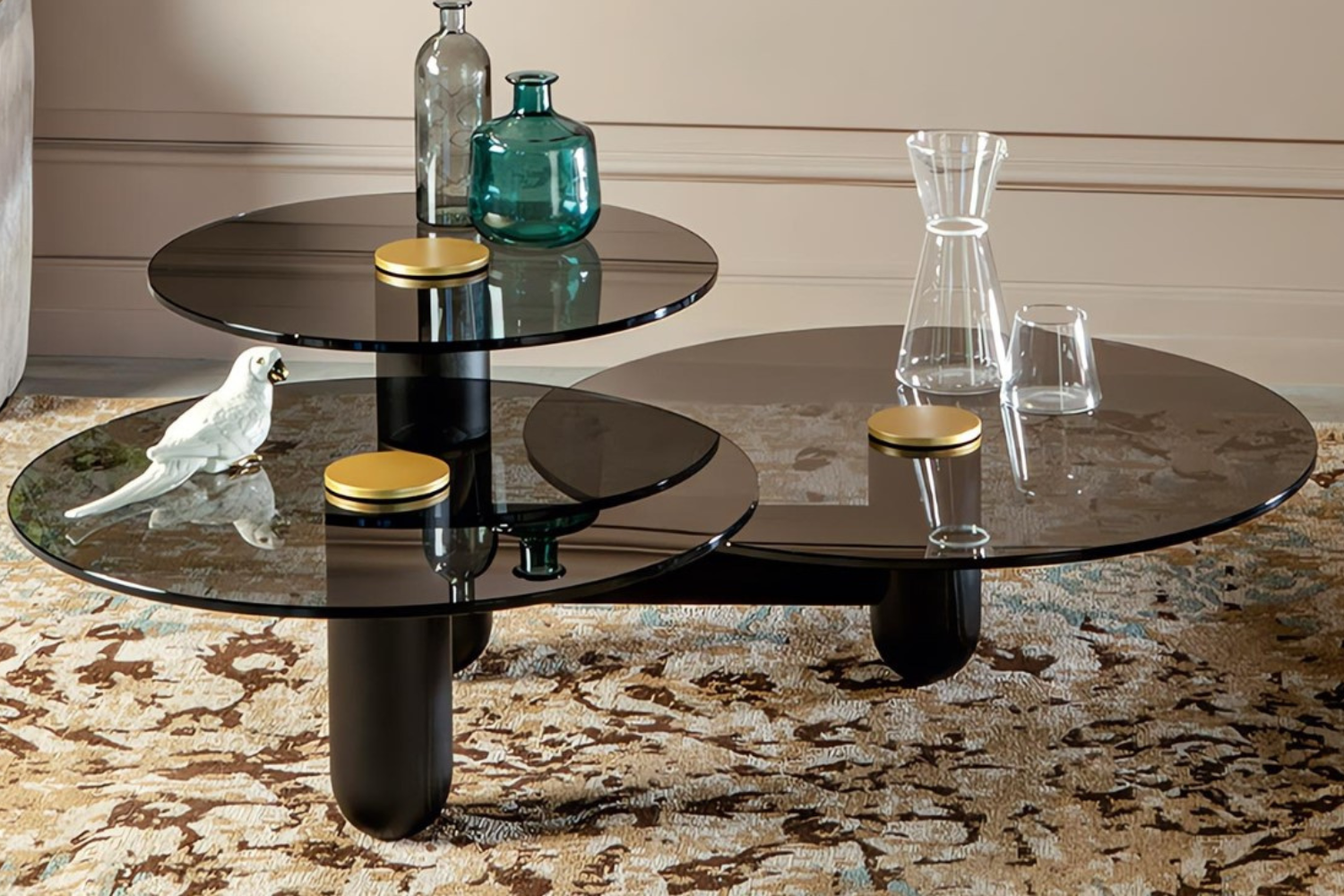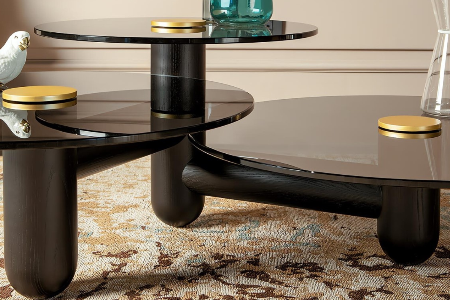 Transform your living space with the celestial allure of the Cosma Coffee Table.This table features a stunning design with three interconnected tops of varying diameters and heights, creating a dynamic, orbital aesthetic. At the center of each smoked glass top, a bold satin gold button adds a touch of glamour and sophistication, drawing attention with its radiant charm. The table’s sleek black ash wood base provides a strong foundation, perfectly balancing the smoky surfaces and golden highlights. Ideal for hosting guests or showcasing decorative accents, the Cosmo Coffee Table effortlessly combines functionality with timeless elegance.