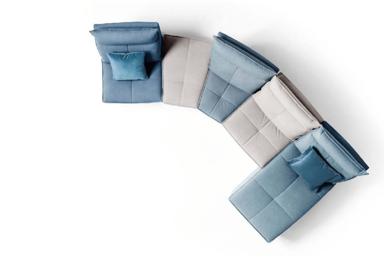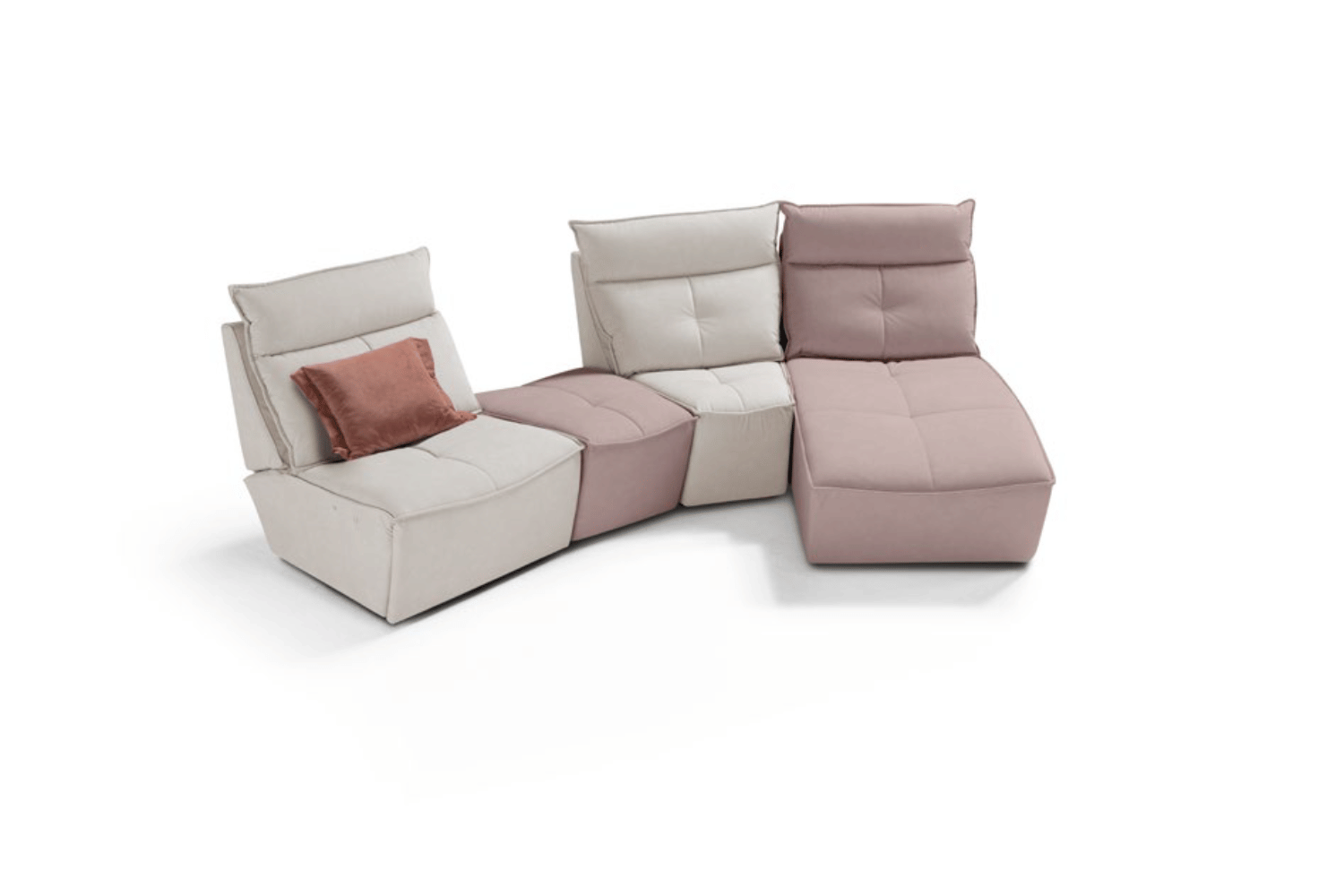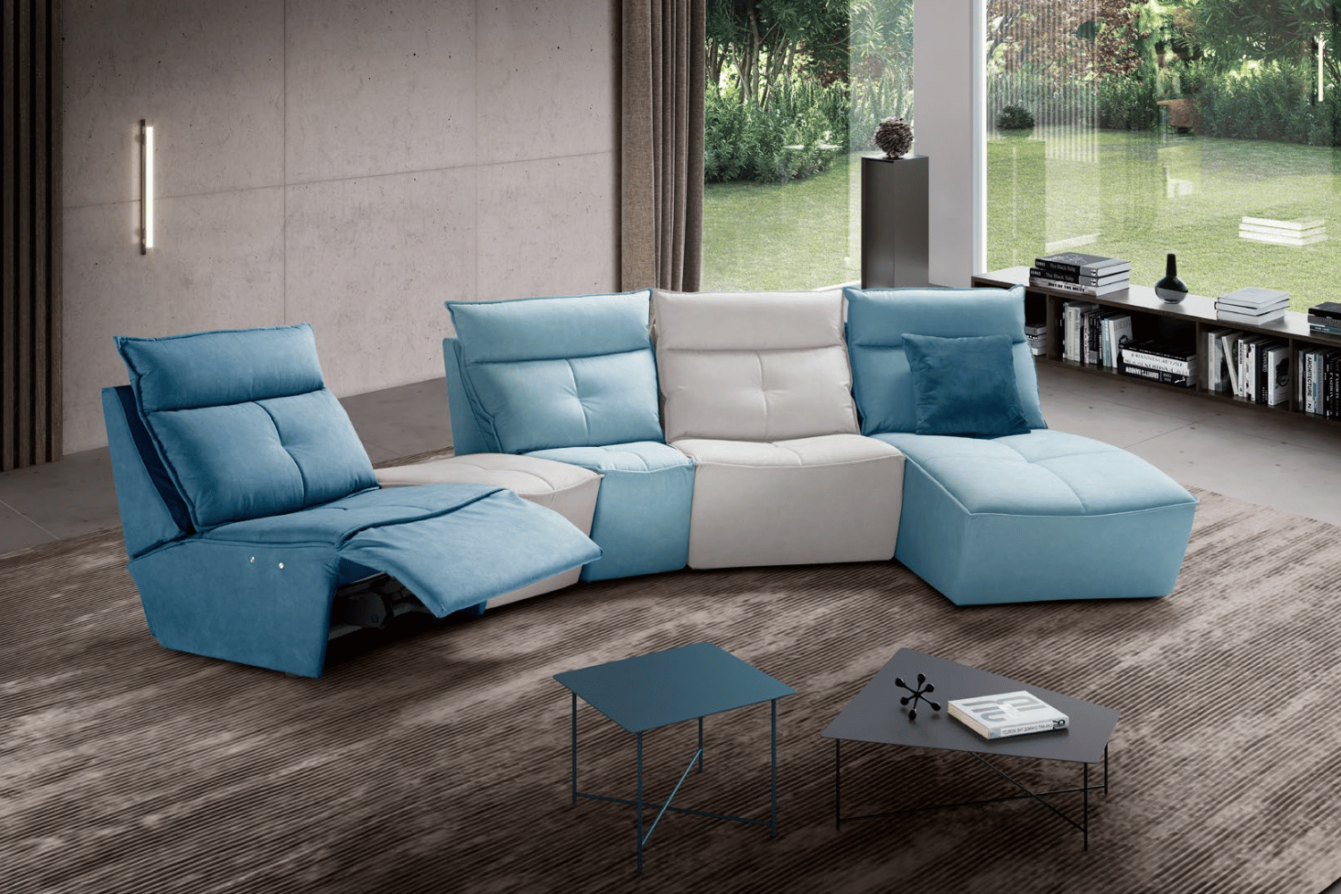 Designed as a project open to various configuration thanks to a variety of modules which may result in creative and original sectional compositions, including chaise longue, pouf, it is perfect in different colour matching. Combining leather and fabric upholstery. The linear quilting and the slim and sinuous armrest highlight its modern design, enriched by the power reclining seats.