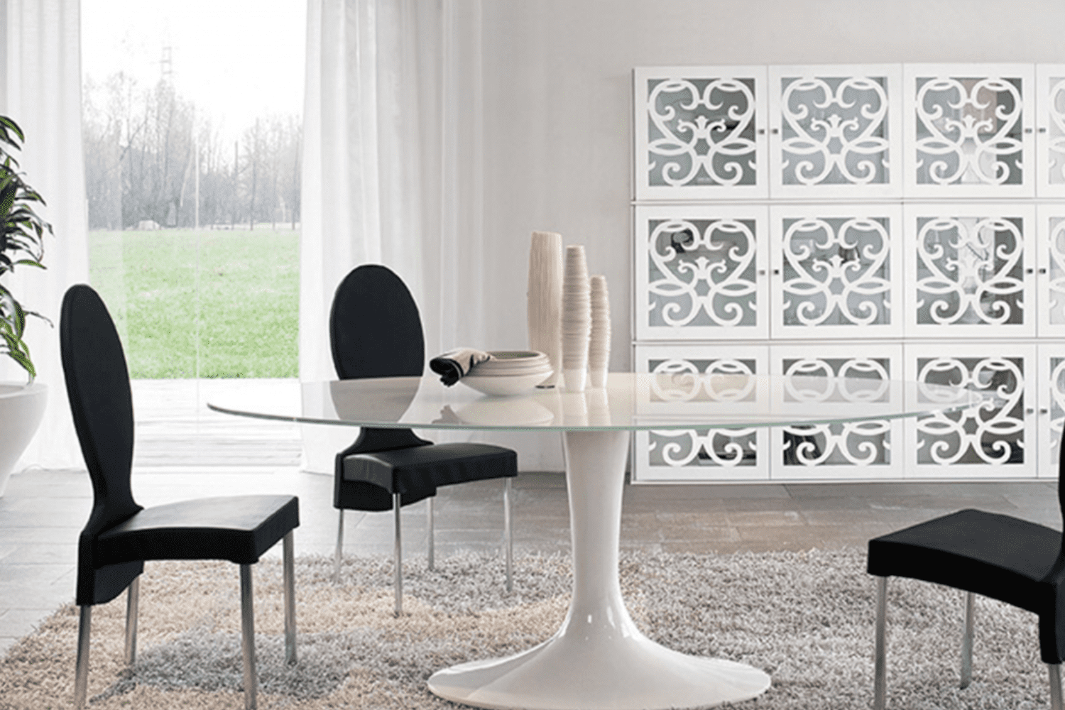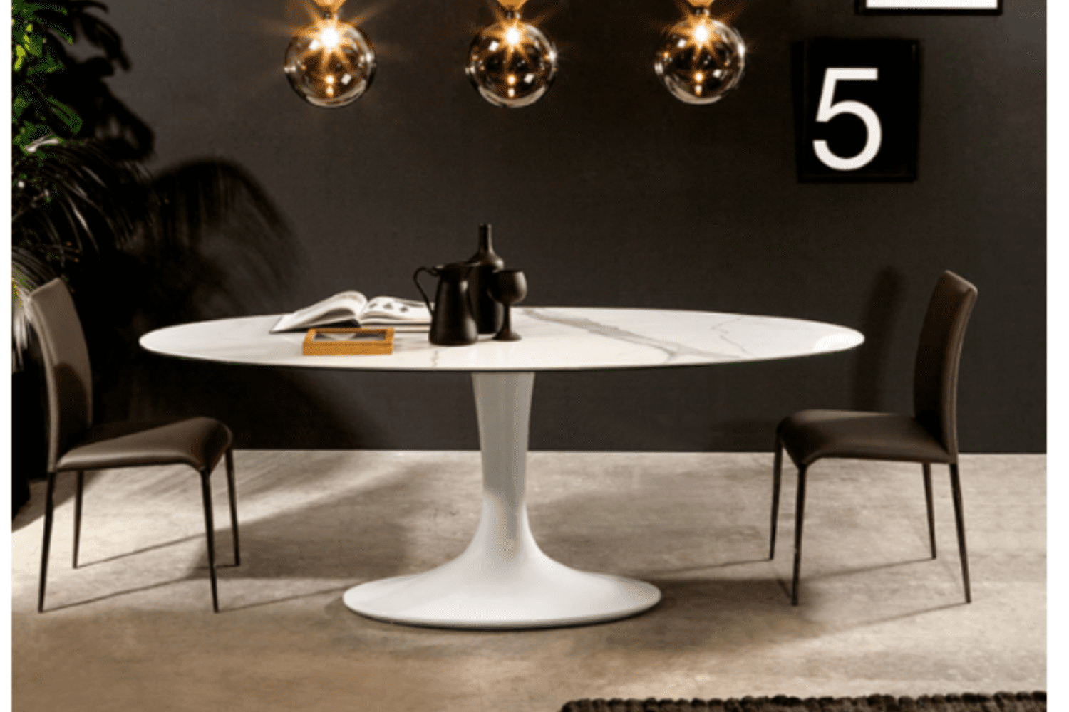 The Imperial table extends gracefully like a stem from its round base, broadening at the bottom and tapering as it rises, achieving a harmonious balance between space and materials. Its glossy cultured marble base is elegantly complemented by a selection of tempered glass finishes for the tabletop.