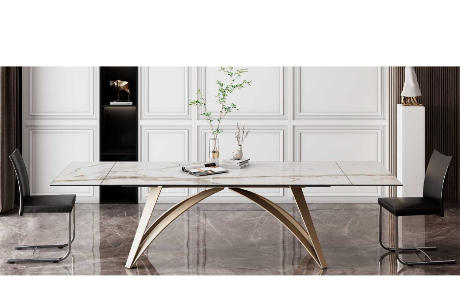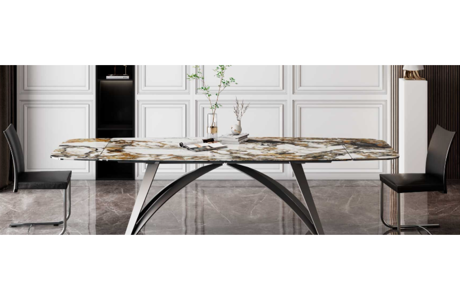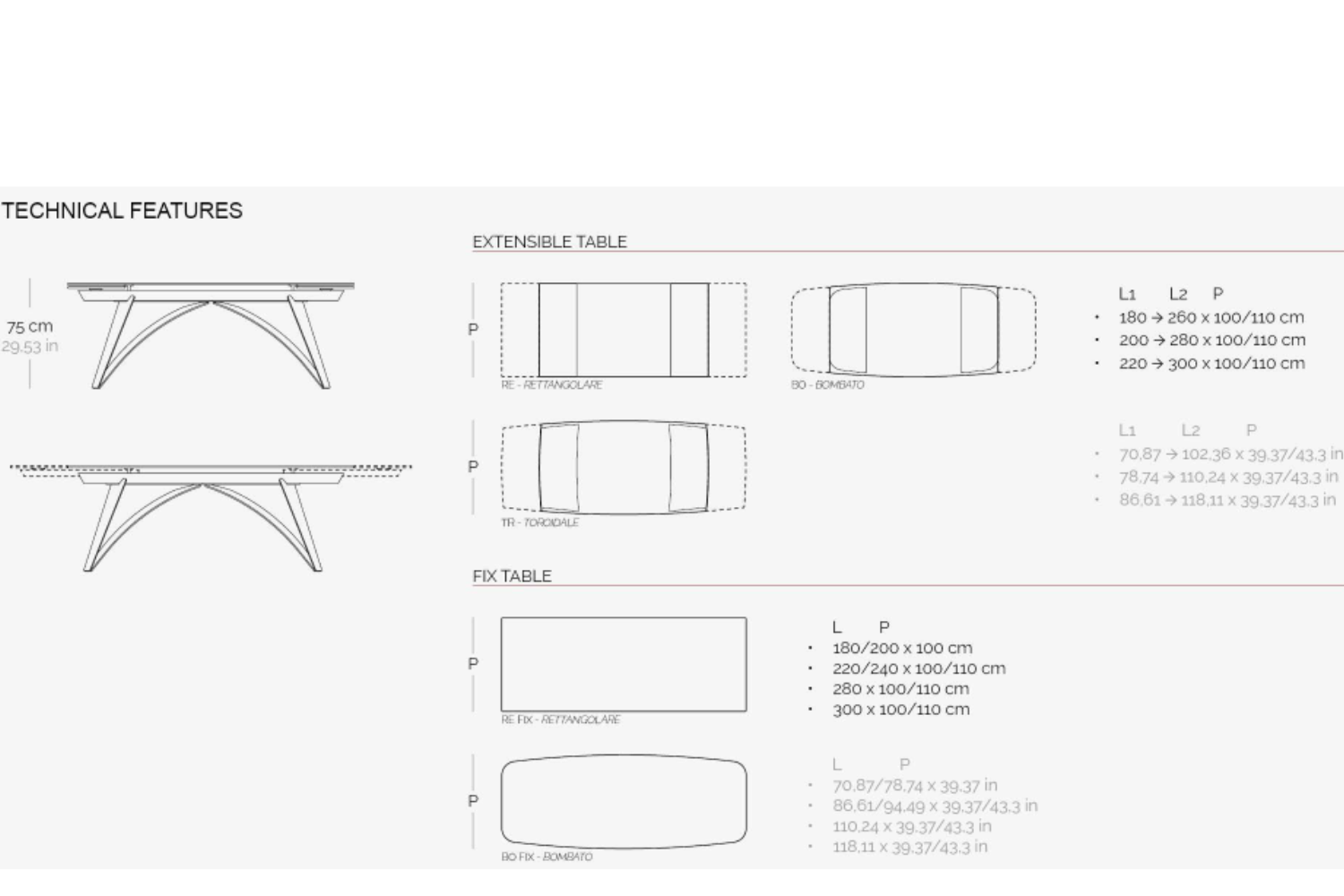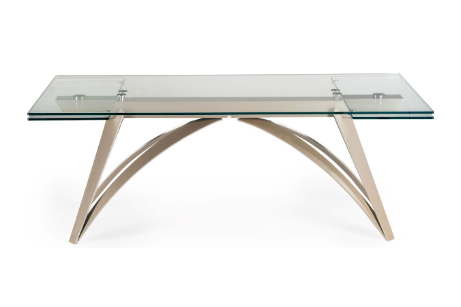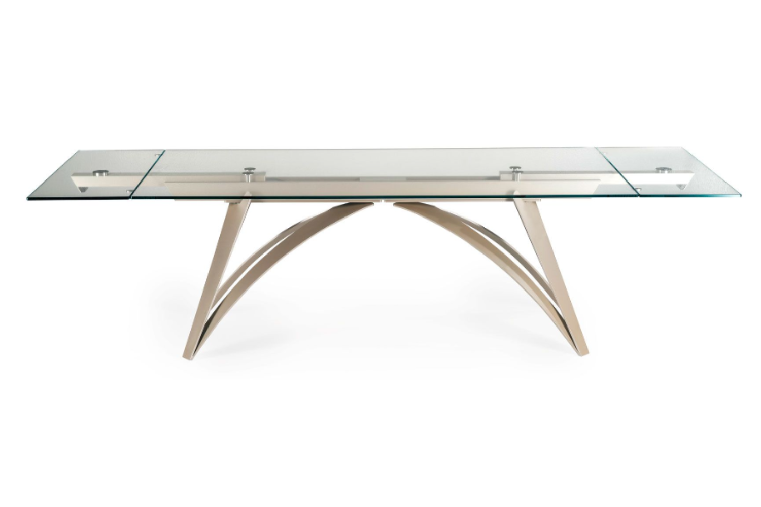 An extendable dining table with glass top and extensions, supported by a base and track made of painted metal. Featuring a patented mechanism for easy lateral extension, allowing for a widening of the top by 80 cm (31.5 inches). Also available with ceramic tops.