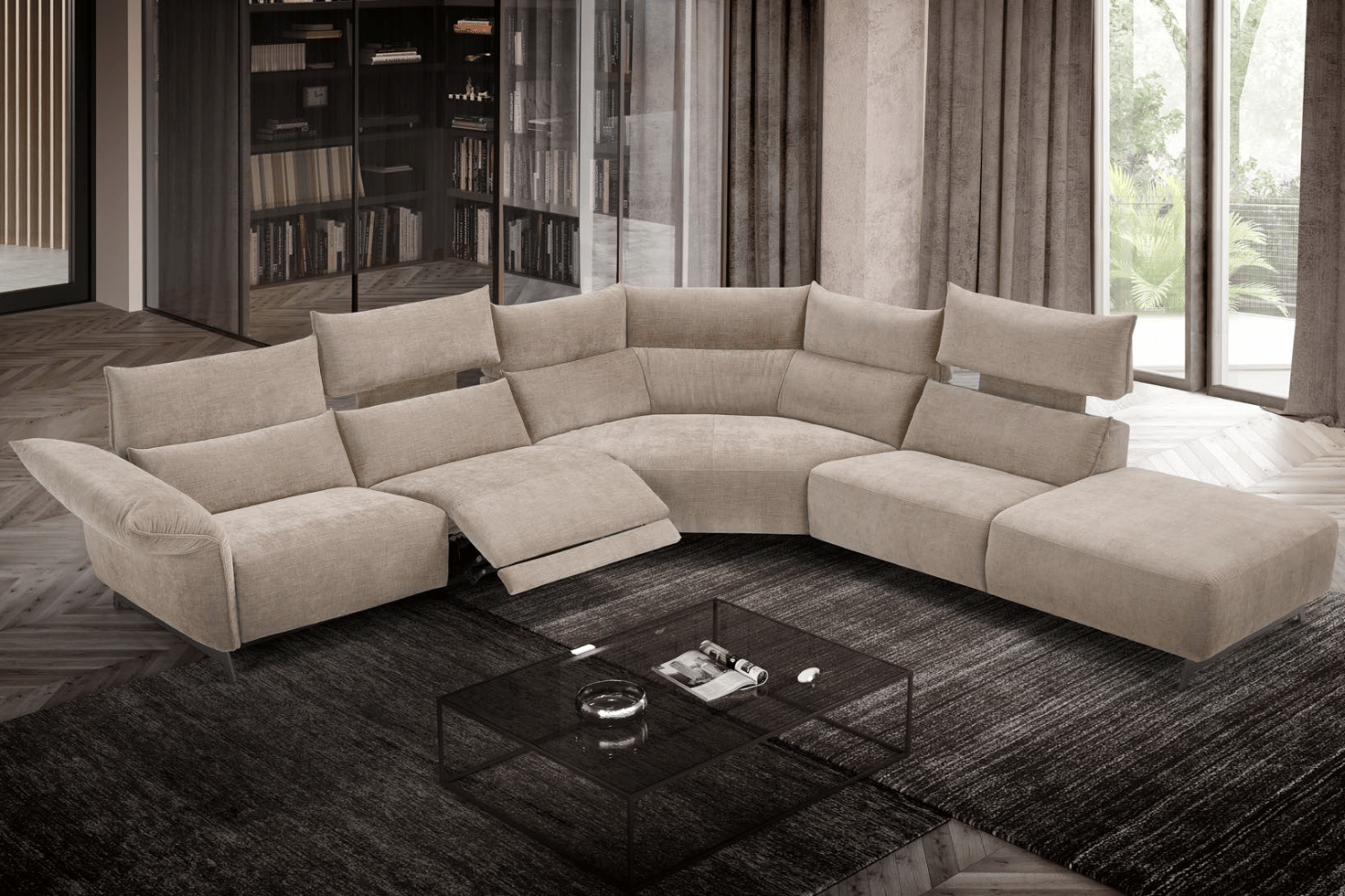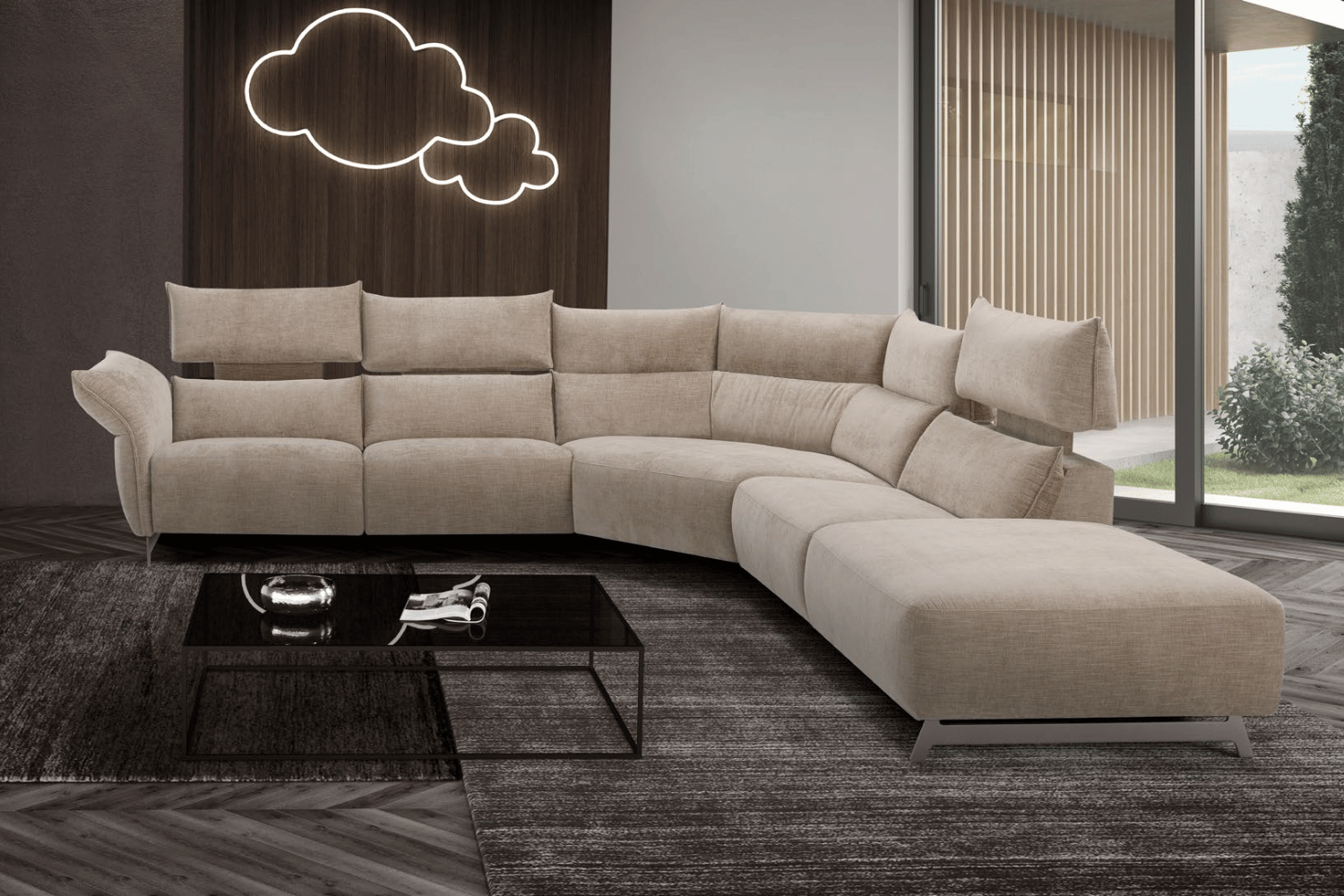 A flexible project for a totally innovative idea of relaxation that combines ergonomics, design, and maximum comfort. Supported by metal feet, available in fabric or leather , Levi summarizes the main functions of our recliner collection: starting with the double motor reclining seats and vertical electric headrest, to end up with the manual adjustable armrest.