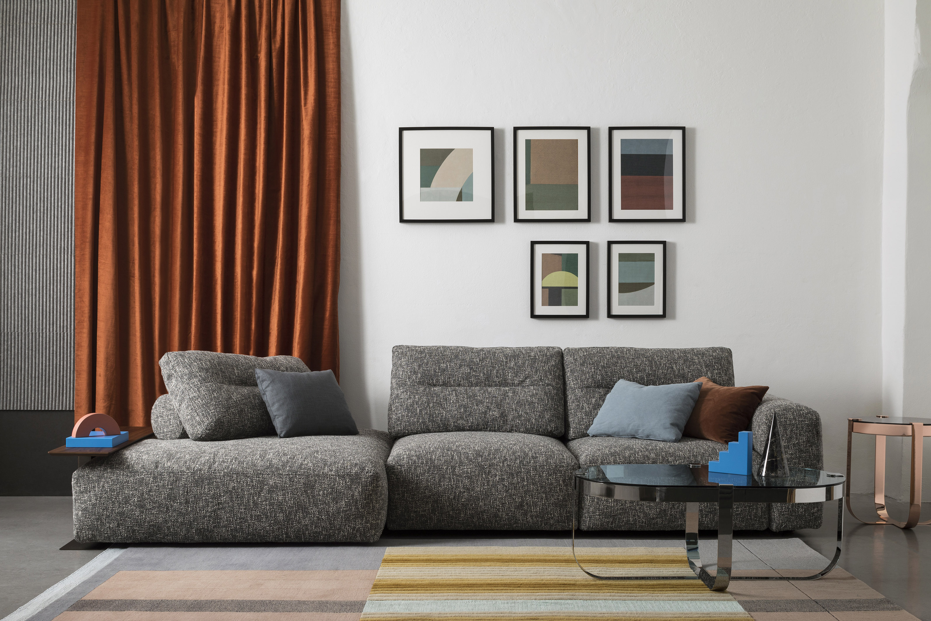 Mesatin Sectional Sofa with Modular Seatings,a revolutionary design that redefines relaxation. The fluid movement of its pouf structures echoes the essence of My Taos, creating a visually stunning and dynamic arrangement. Comfort takes center stage in this stunning redesign. The backrests have been redefined, incorporating the latest materials to deliver a luxuriously supportive and ergonomically designed experience. This focus on comfort extends beyond the seats, with the inclusion of fold-out side tablesa touch of practicality that adds a sophisticated touch. Aesthetics meet function with the addition of new cylindrical support cushions. They not only enhance comfort but also contribute to the sofa's modern and cohesive design. The updated design embraces a touch of poetry, with rounded forms softening edges and lines for a timeless and elegant look. Mesatin exemplifies enduring design. It seamlessly blends classic style with contemporary functionality. Fully removable covers add a layer of practicality, allowing for easy maintenance and the flexibility to refresh the look of your sofa as your preferences evolve.