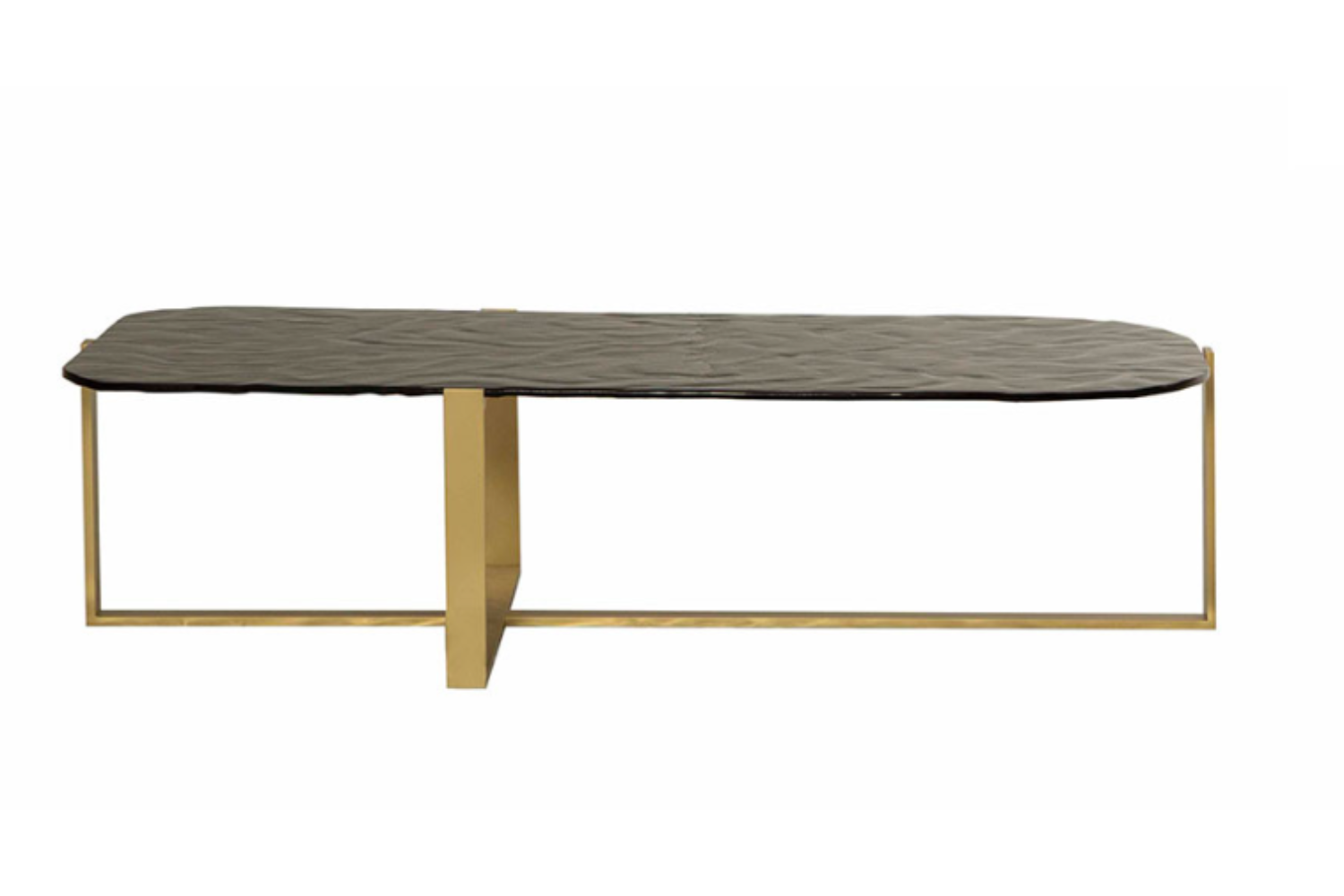 The Oceano coffee table is a striking centerpiece that effortlessly enhances any contemporary living room. Its uniquely rippled glass top captures the mesmerizing effect of water in motion, creating an artful, asymmetrical profile. Complementing this intricacy, the interlocking geometric base offers a bold contrast with its clean lines and solid structure, blending style and substance for a truly distinctive design. Crafted with a harmonious mix of materials, the Oceano coffee table brings a vivid interplay of textures to your space. Available in two sizes, it provides ample surface area for decor and everyday essentials while maintaining a visually lightweight and elegant presence. With its luxurious fume glass top and choice of two sleek metal finishes for the base, this table is designed to meet the highest standards of form and function.