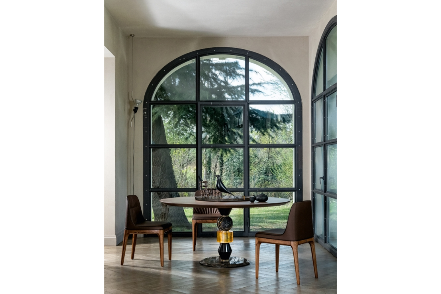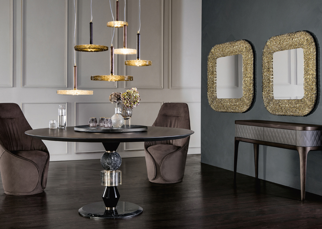 Boasting a multi-material structure comprising authentic marble, fused glass, and lacquered turned wood, this table radiates substantial aesthetic appeal derived from the intrinsic material qualities of its components. Available in a range of finishes, it comes equipped with a Lazy Susan and is also offered in the Big version, featuring two or three bases