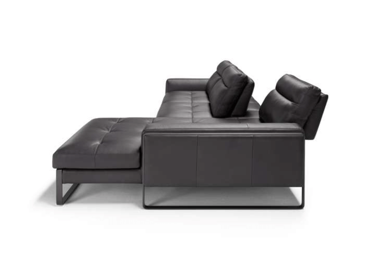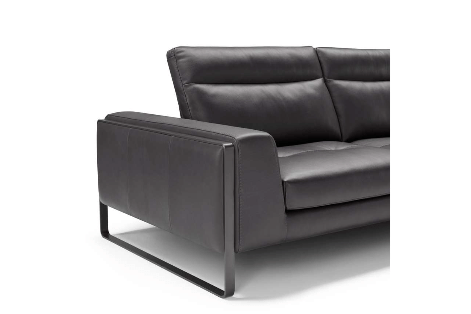 A rigorous sofa, with well-designed lines and balanced proportions, Pace is suspended on a metal base available in various finishes. The large seat, characterized by regular quilting and visible stitching, together with the tilting backrest, define its high degree of comfort. Modular, upholstered in fabric or leather, it also offers several possibility of configurations with chaise longue as well as terminal ottoman.