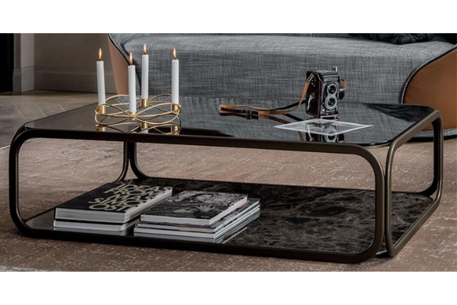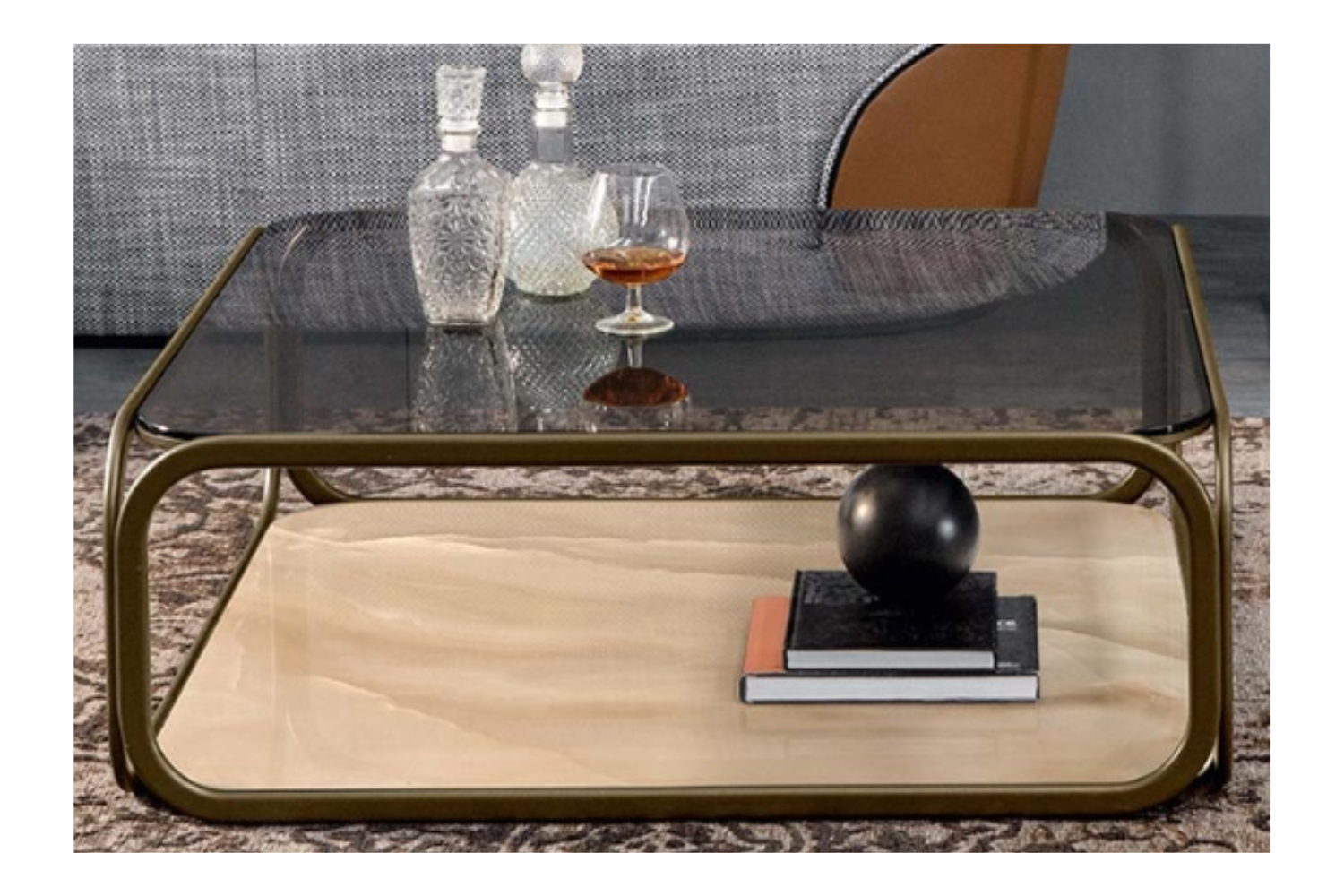 Elevate your modern living space with the captivating Remina coffee table, a true masterpiece of contemporary design. Its geometric silhouette creates an open and airy aesthetic, enhanced by a convenient lower shelf for added storage. The curvilinear details bring a touch of elegance, seamlessly complementing other modern furnishings in the room. Crafted in Italy with premium materials, the Remina coffee table is designed for durability and timeless style. Available in two sizes, its top and base offer a range of ceramic finishes, while the metal accents feature a refined Stone Bronze finish. Pair it with the matching end table to complete a cohesive and sophisticated look.