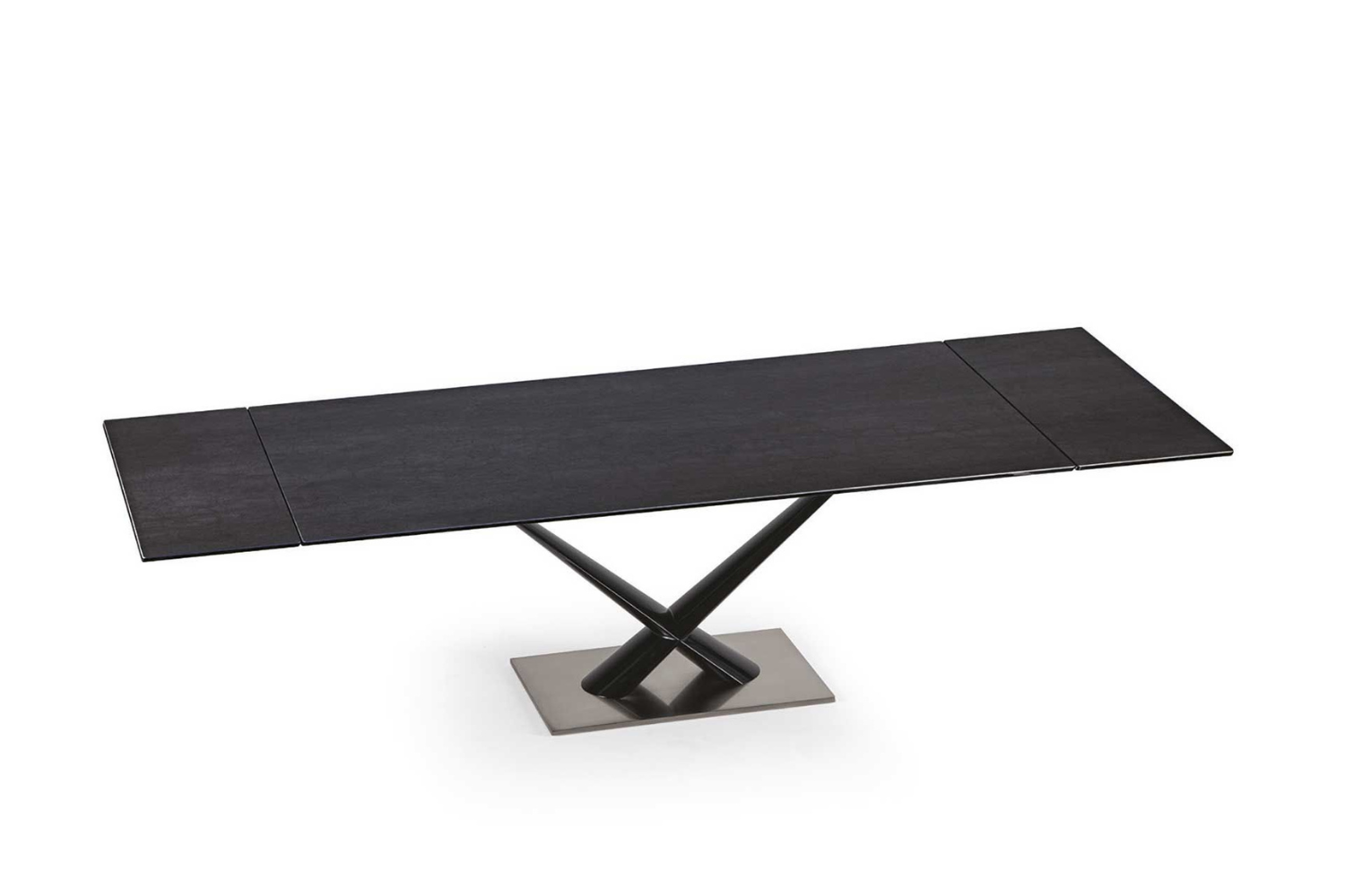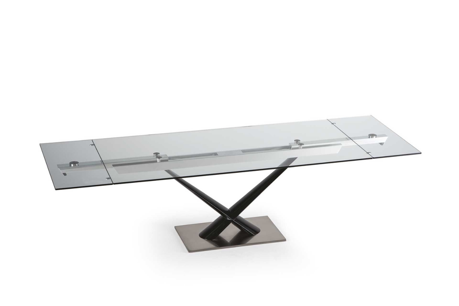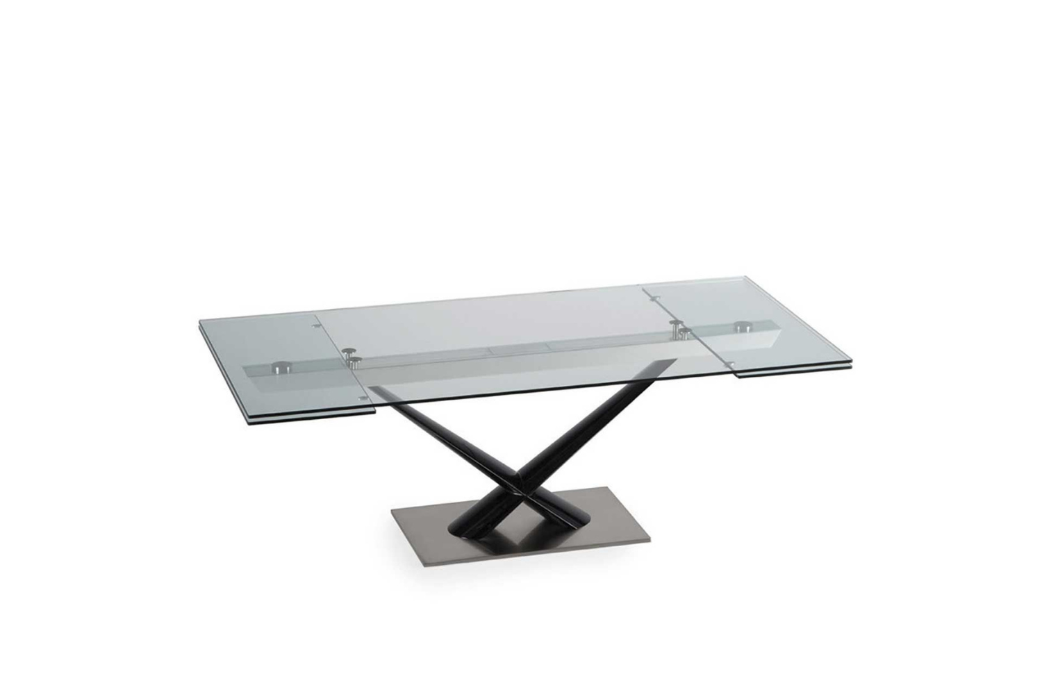 Extendable dining table with glass top and extensions. Legs in painted steel. A very easy mechanism in painted aluminum to pull out the extensions allows the widening of the top of cm 80. Available also with ceramics tops.