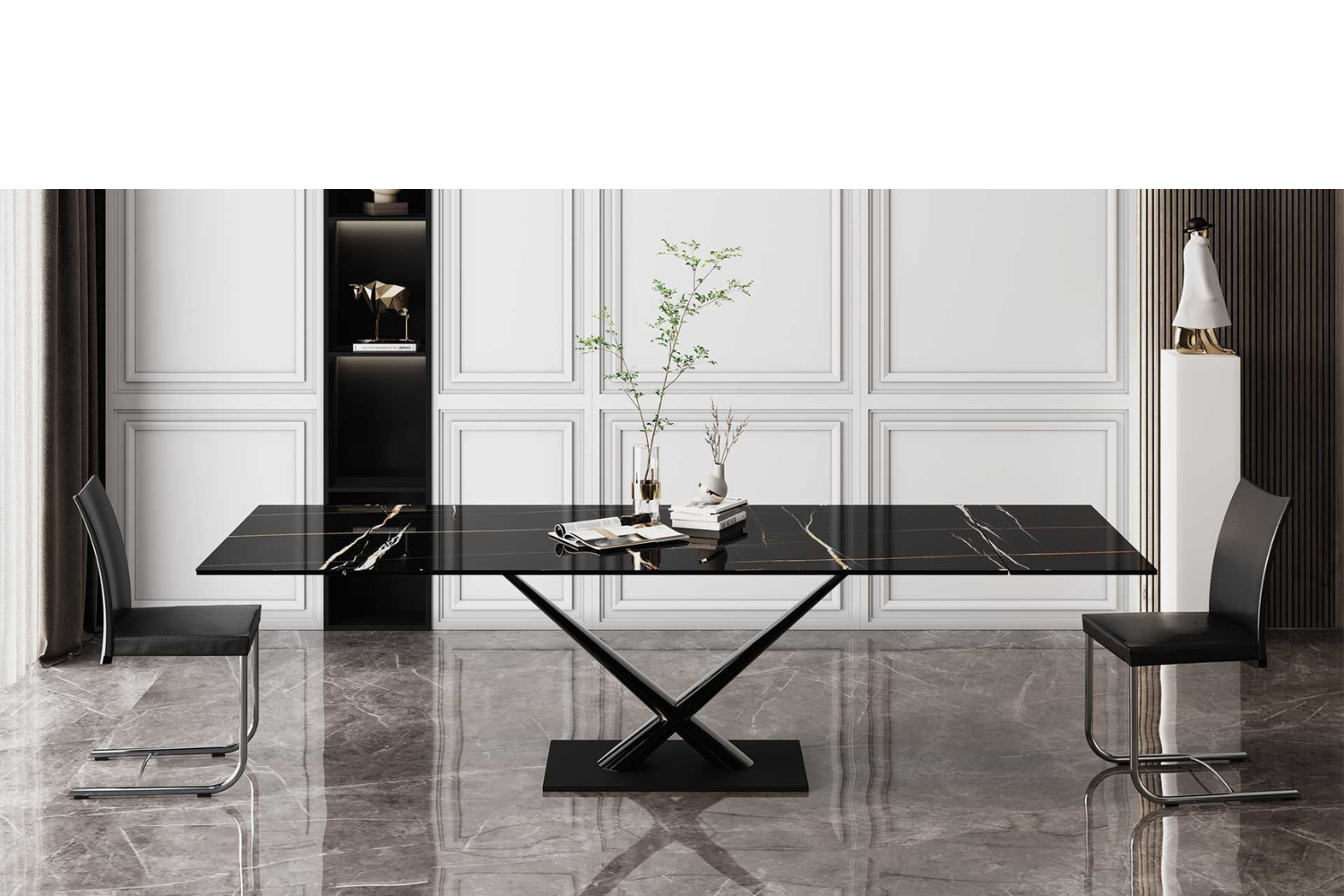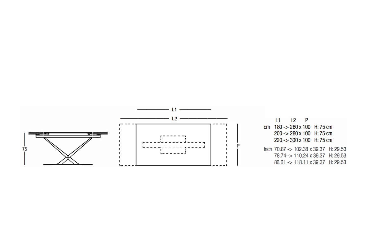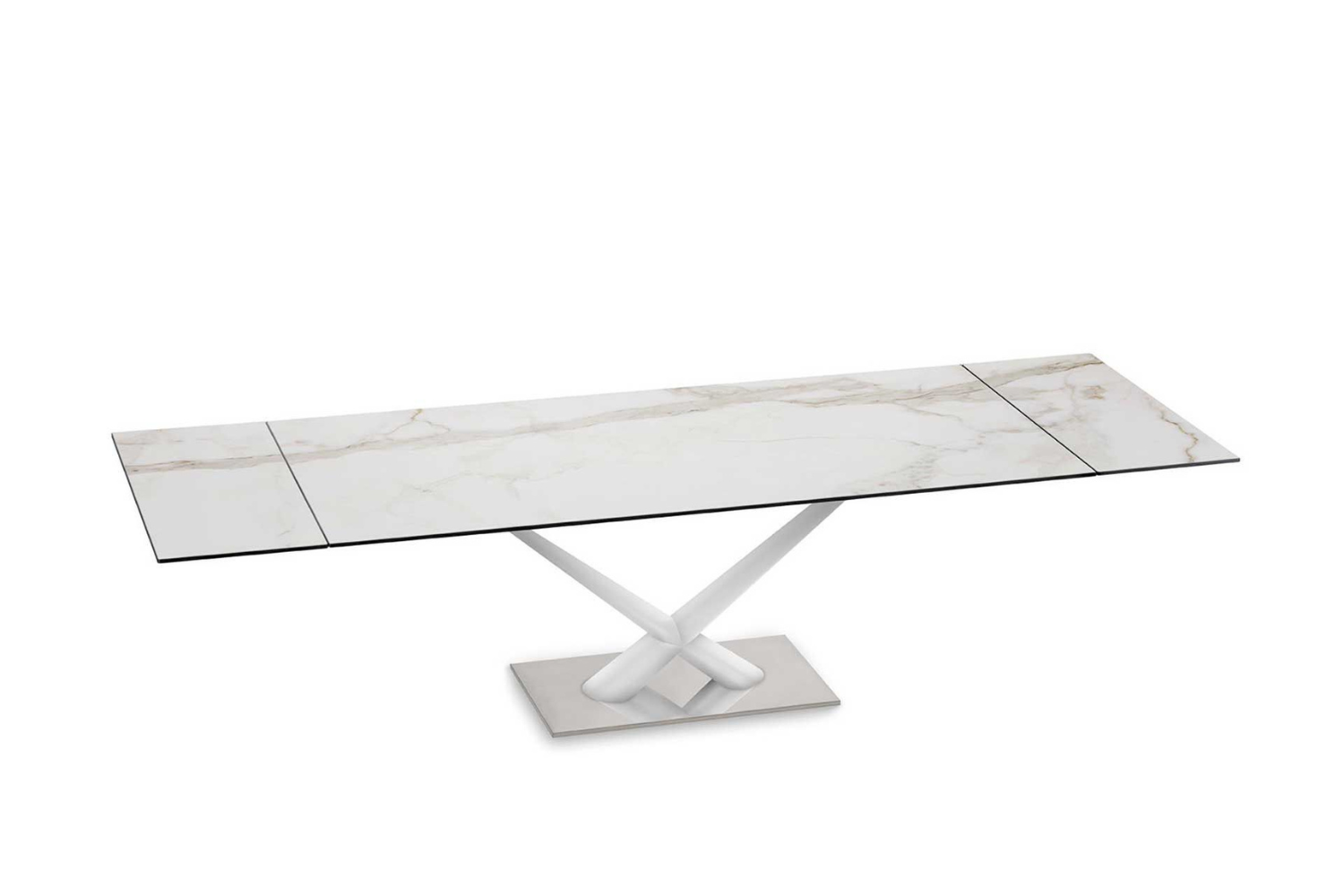 Extendable dining table with glass top and extensions. Legs in painted steel. A very easy mechanism in painted aluminum to pull out the extensions allows the widening of the top of cm 80. Available also with ceramics tops.