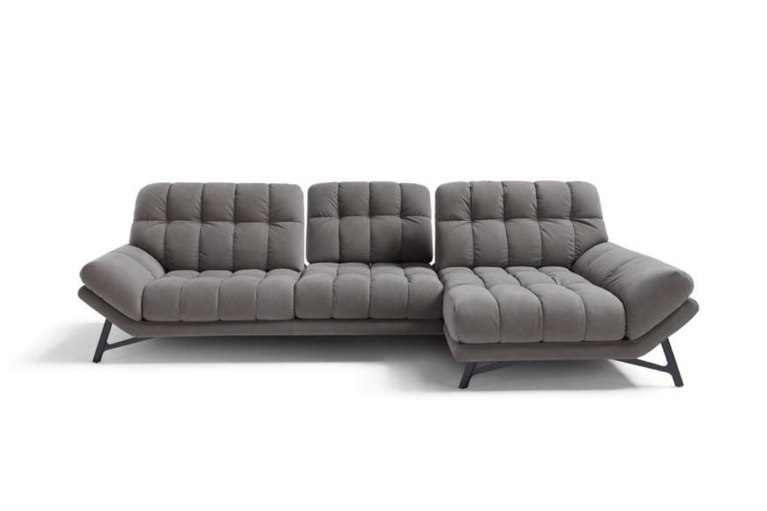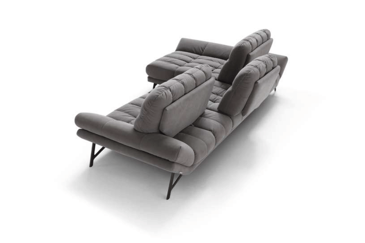 Spigla is an elegant design that focuses on the originality of its shapes. Characterized by a deep quilting on the seat and on the backrest as well as sophisticated details of the metal feet, it features a tilting backrest and inclined armrests that add extra comfort. Available in both leather and fabric covering, as well as with tilting mechanism and fixed backrest with reduced depth, it offers the possibility of configuring sofas in various sizes and in combination with chaise lounges.