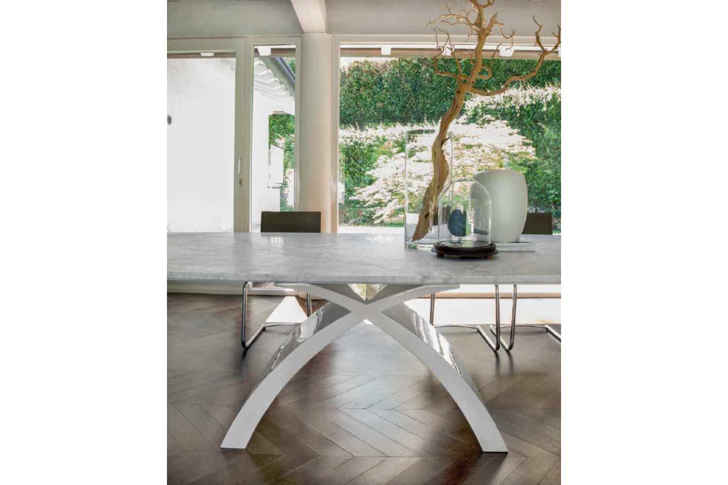 Tokyo, now in its extendable version, features an aluminum guide bar and offers a selection of glass, ceramic, wood, or marble tops. The legs, crafted from cultured marble, boast dynamically strong lines that can be further customized with a RAL finishing, allowing you to personalize your dining room. With the flexibility to create numerous combinations, Tokyo's design effortlessly blends both contemporary and classic elements, accentuated by the presence of the wooden extendable top
