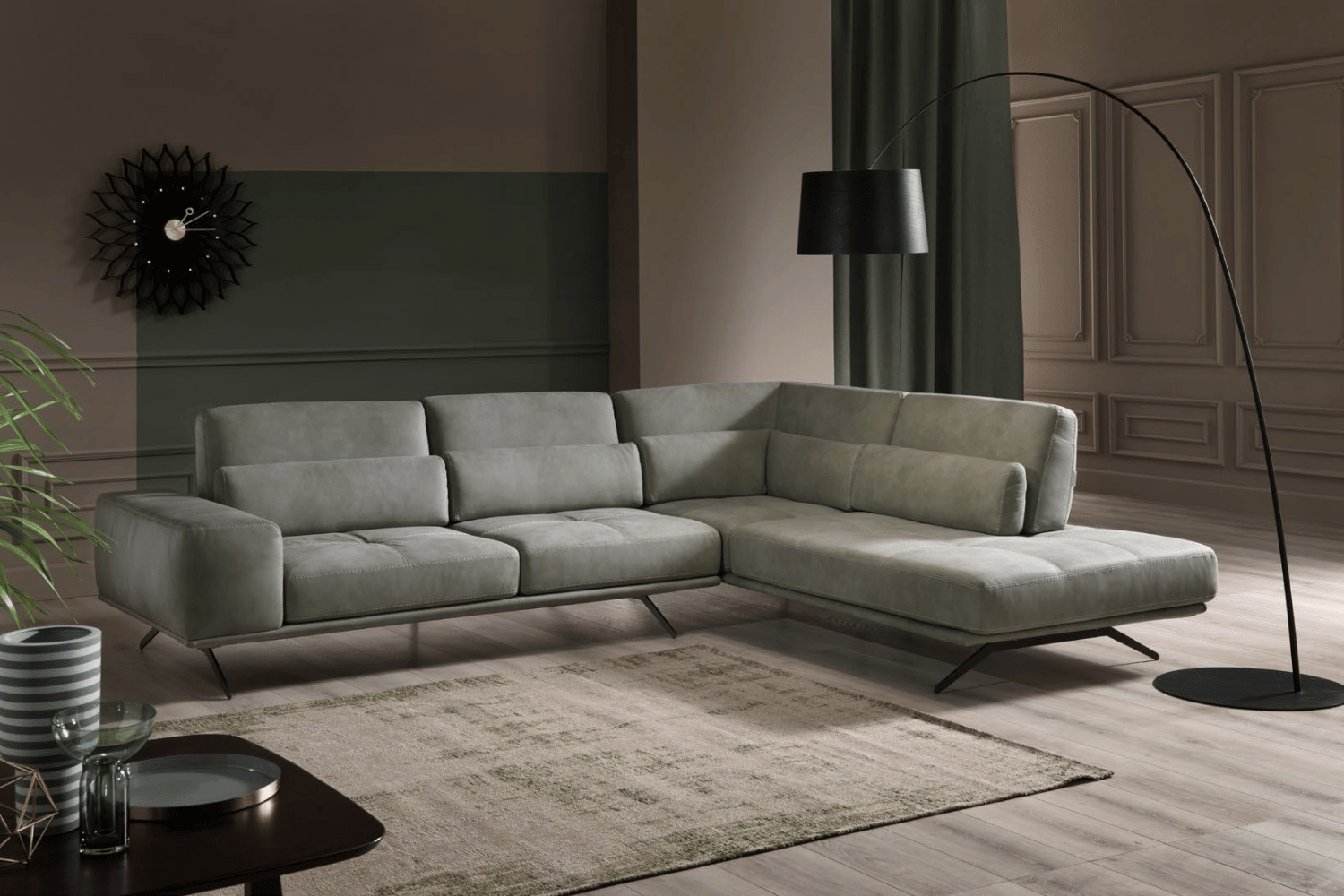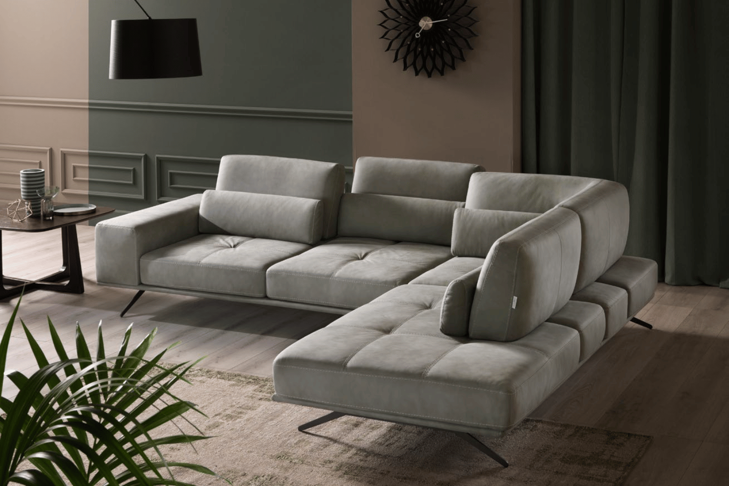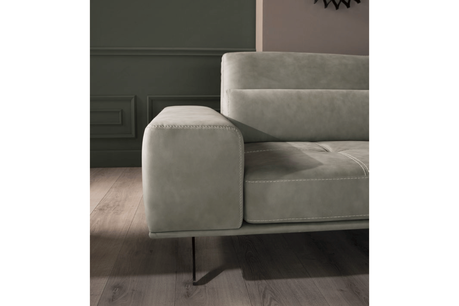 Delicate elegance of its silhouette, refined details, and maximum functionality. A squared and prominent armrest completes the seating, finished with artisanal geometric quilting and double-crossed seams. Vamani with leather or fabric upholstering on metal feet, is a real call to relax thanks to the lumbar cushions and the moveable backrest, which regulates the seating depth.